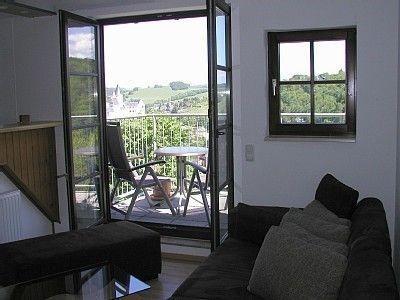 Einen tollen Blick auf die Erzgebirgslandschaft Schwarzenberg, insbesondere das Schloss und die Kirche, die Sie fußläufig in 3 min erreichen können, haben Sie vom Wohnzimmer / der offenen Küche und dem davor liegenden Balkon.
