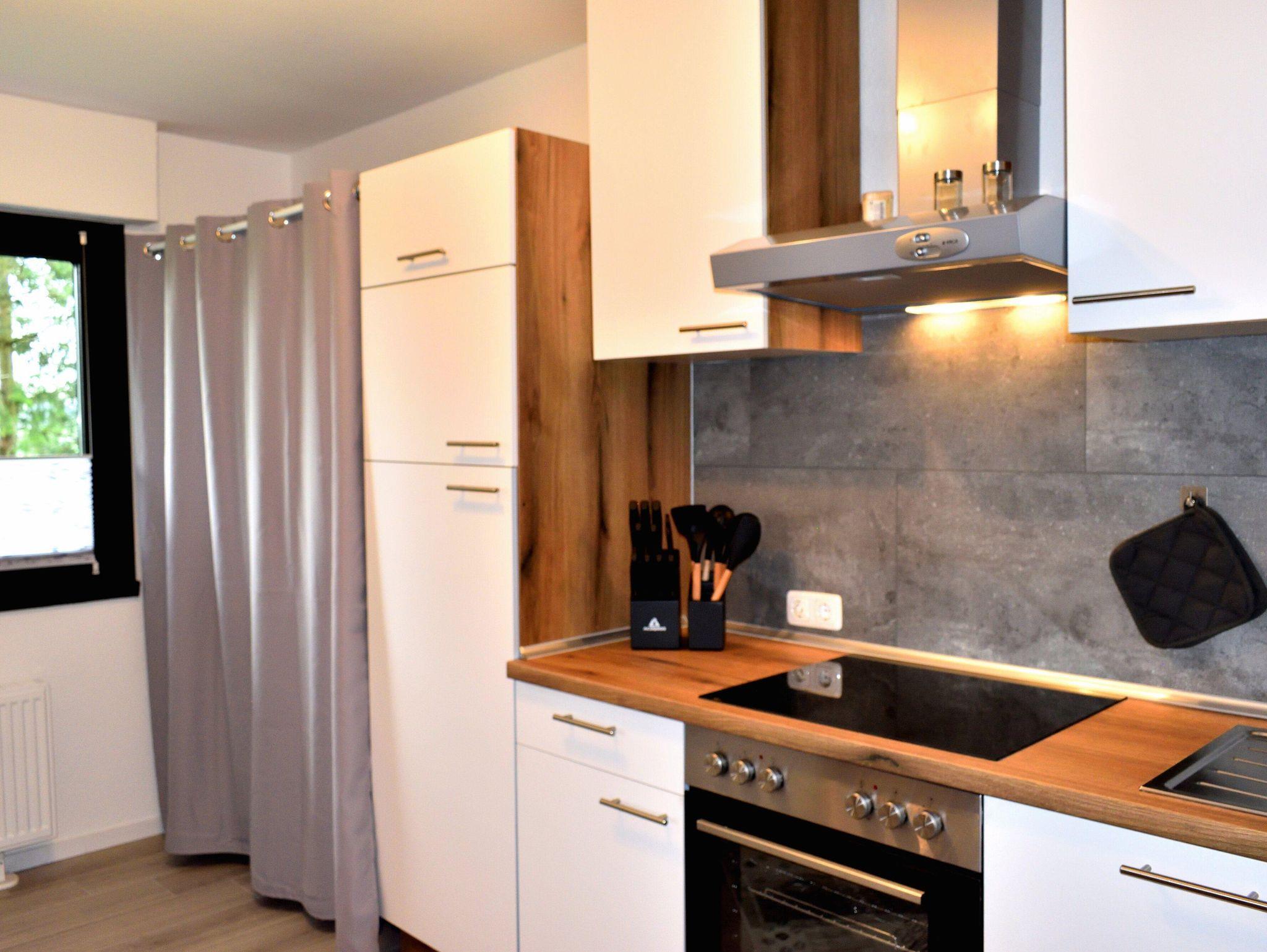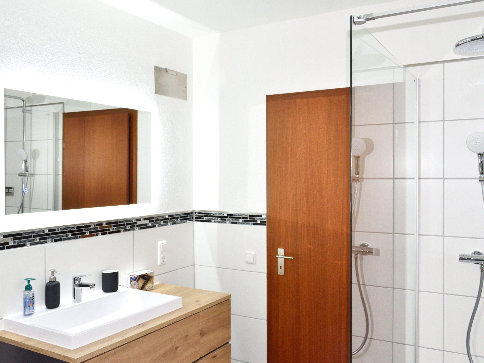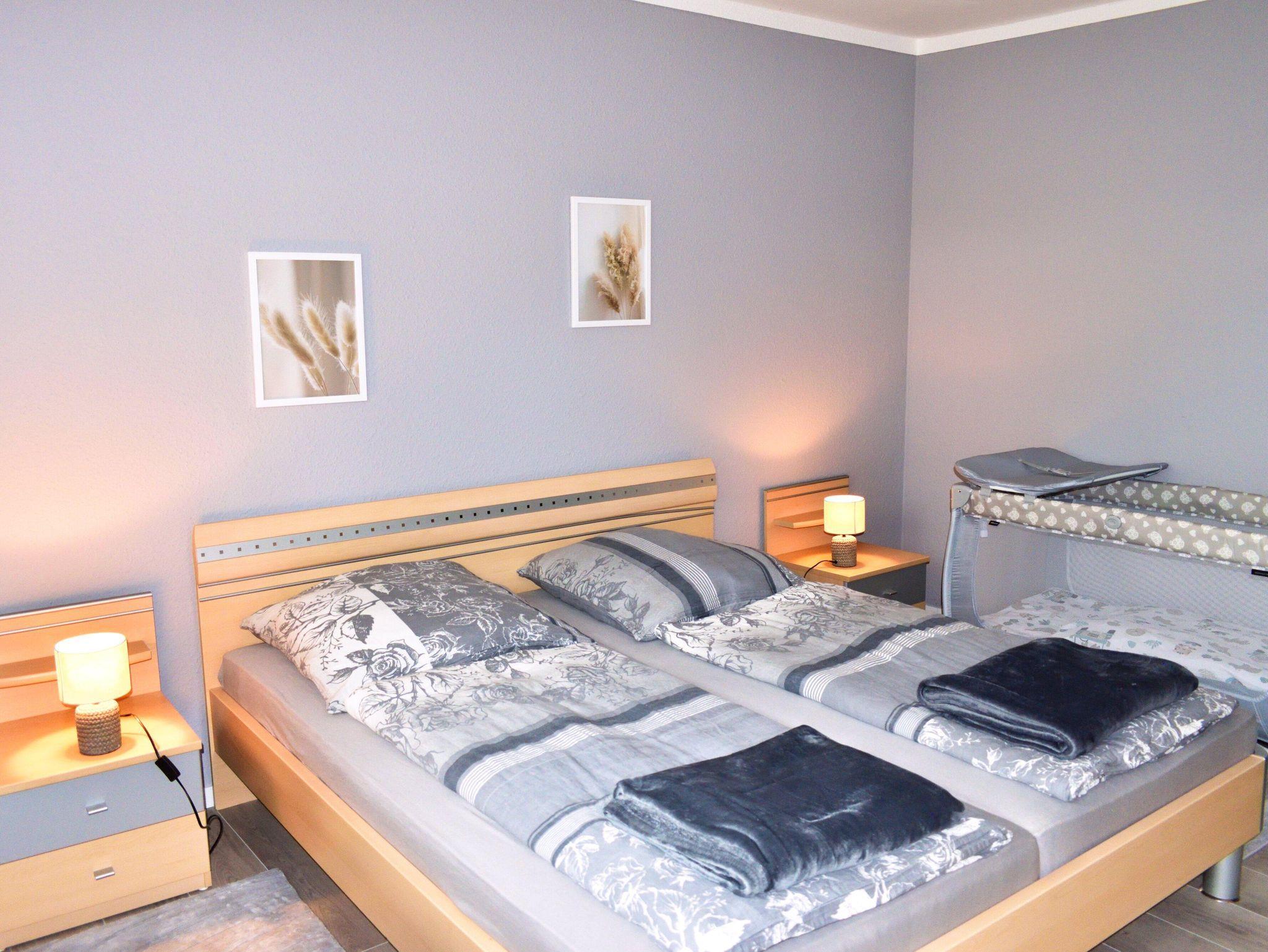Es erwartet euch eine komplett renovierte und möblierte Wohnung mit Balkon und Garten. In dem 90m2 großen Haus ist Platz für bis zu 5 Personen. Das freistehende Haus verfügt über einen offenen Wohn-und Essbereich mit Zugang zur Küche. Im Wohnzimmer findet ihr eine große Couch mit Schlaffunktion, einem 65 Zoll Flachbildfernseher und WLAN, natürlich kostenlos. Das absolute Highlight: unser Holzkaminofen!!! Der Essbereich bietet Platz für die ganze Familie. Die Küche ist großzügig ausgestattet. Ob für einen ausgiebigen Kochabend mit Freunden oder um gemeinsam mit der Familie einen Kuchen zu backen. Der Balkon ist mit Sitzmöglichkeiten und einem Holzkohlegrill ausgestattet. Hier kann man bei einem Glas Wein und einem guten Essen den Panoramablick und den Sonnenuntergang genießen. Das ist Entspannung pur. Das Badezimmer ist die absolute Wohlfühloase und die sehr gute Wasserqualität ist wie eine Körperkur für Haut und Seele. Es erwartet euch eine ebenerdige, große Dusche, ein großes Waschbecken mit beleuchtetem Spiegel, Föhn und Handtücher. Im Flurbereich steht zudem ein Gäste-WC zur Verfügung. Es gibt insgesamt drei Schlafzimmer. Im ersten Schlafzimmer, was auch fester Bestandteil der Wohnung ist, befindet sich ein Doppelbett (1,80x2,00), ein sehr geräumiger Kleiderschrank, Nachttische mit Schubladen und Nachttischlampen direkt am Bett. Das Zimmer, sowie alle anderen Zimmer auch, verfügen über elektrische Rolläden. Die beiden anderen Schlafzimmer verfügen über große Betten (1,60x2,00) und je einen Kleiderschrank, einen Nachttisch und Nachttischlampen. Es stehen ein Hochstuhl und ein Kinderbett zur Verfügung. Für Kinder stellen wir außerdem verschiedene Spiele/Spielsachen bereit sowie einen seperaten Kindertisch mit Stühlchen. Egal auf welcher Seite man aus dem Fenster schaut, man sieht immer hinein ins Grüne. Direkt vor der Wohnung kann das Auto geparkt werden.