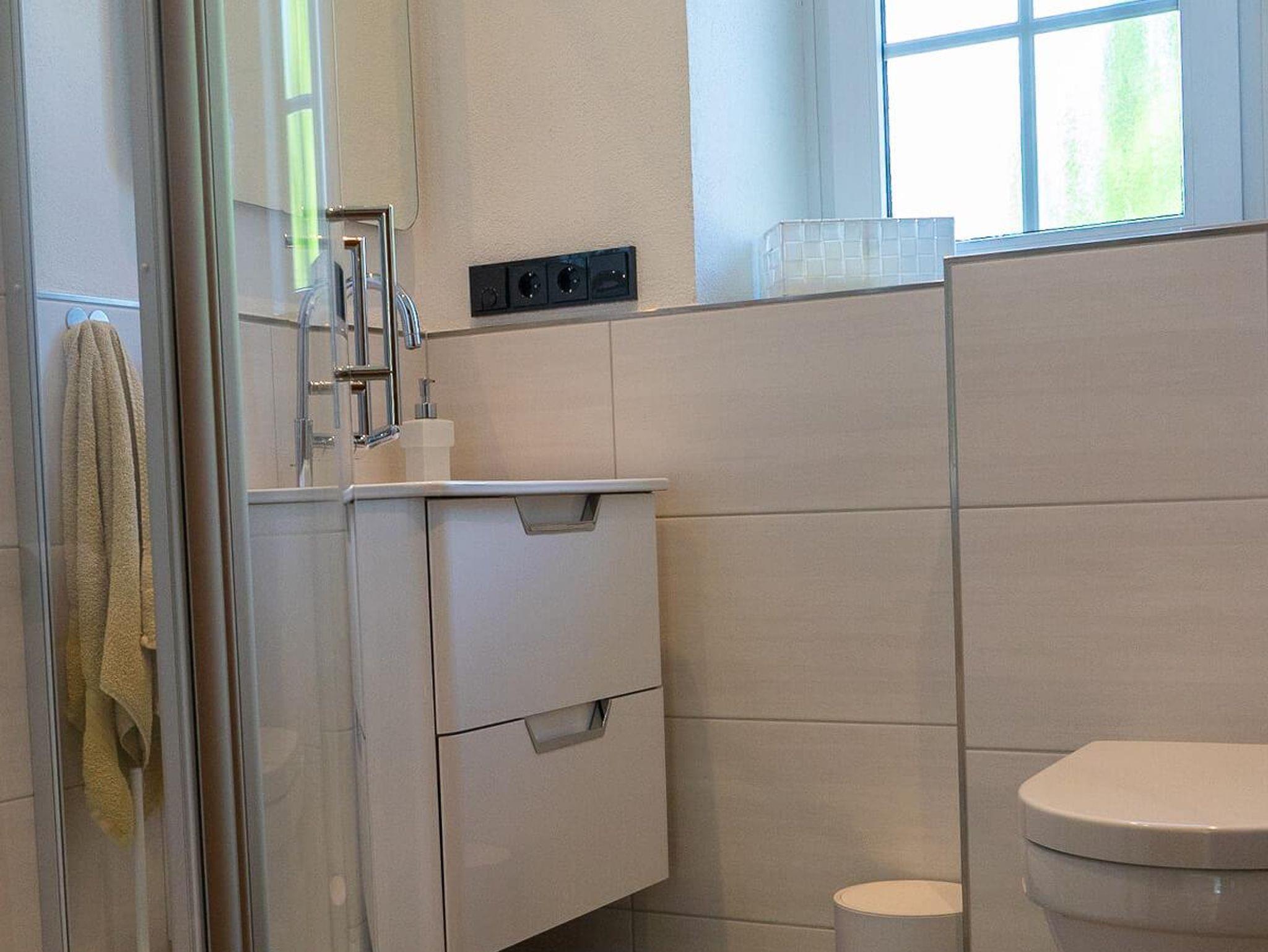 Das größte Schlafzimmer befindet sich im Dachgeschoss und ist mit einem Doppelbett 1,80m x 2,00m ausgestattet. Eine Sitzecke mit zwei Sesseln, ein Flachbildfernseher und eine Toilette mit Waschbecken befinden sich ebenfalls im Zimmer.