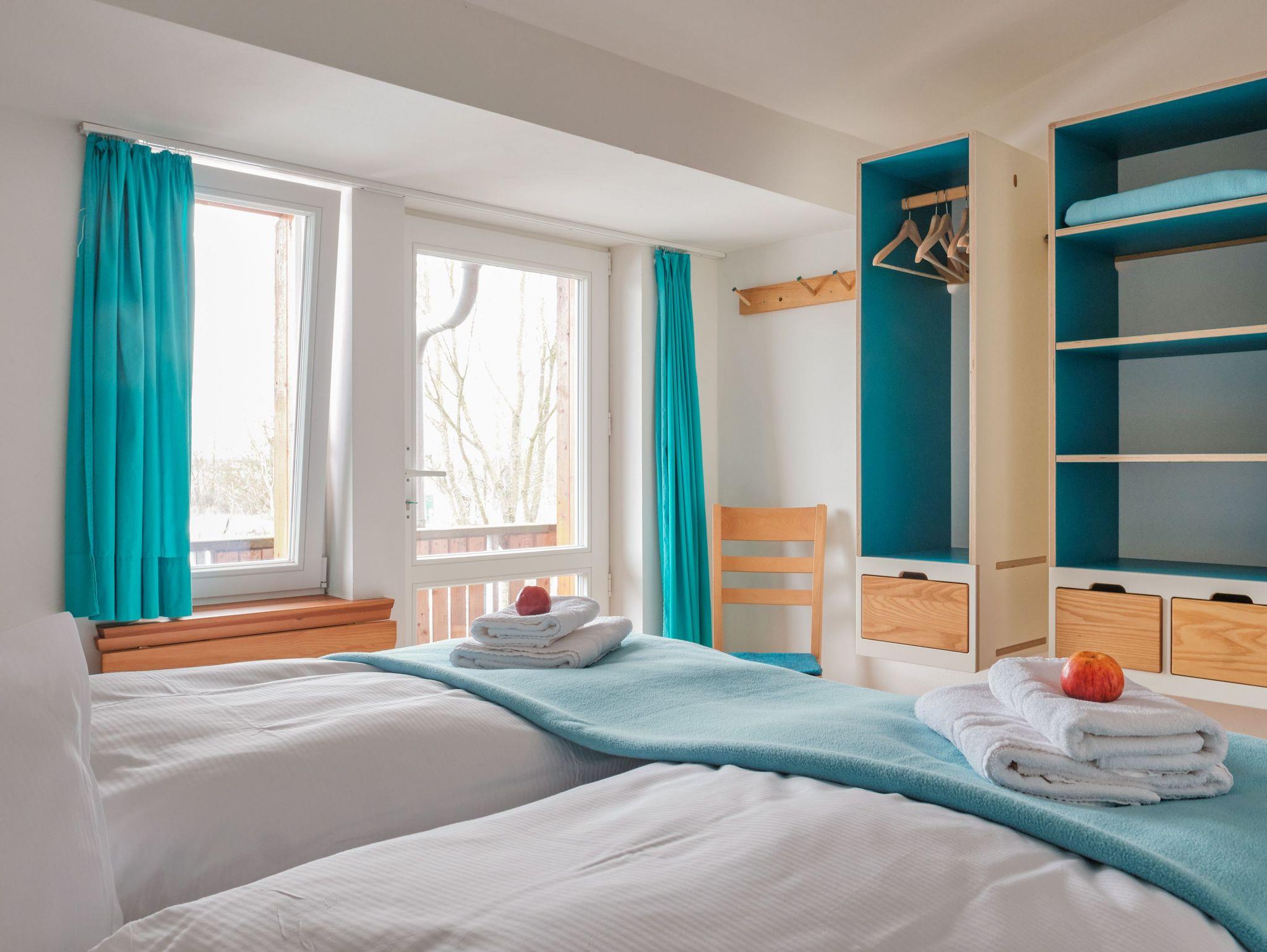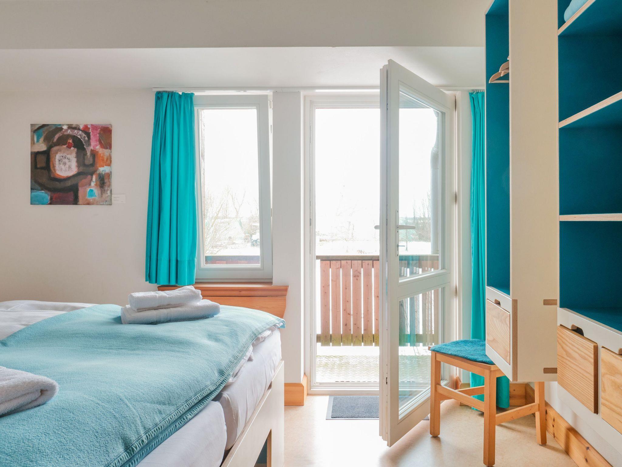 Die drei in Türkis gehaltenen Zimmer teilen sich ein Bad und eine Pantryküche im Flur, so ist eine Selbstversorgung möglich. Die Pantry ist mit allen notwendigen Geräten bester Energieefizienz ausgestattet. Dieses 12m² Zimmer liegt im Obergeschoss und schaut zum Kuhstall, zur Kälberwiese mit rechts dem Kinderbauernhof, dahinter im Rund begrenzen die Bäume vom Seeufer den Ausblick. Die Einrichtung stammt von befreundeten Designern und Tischlern. Künstler vom Hof und seiner Umgebung stellen ihre Bilder und Werke darin aus.