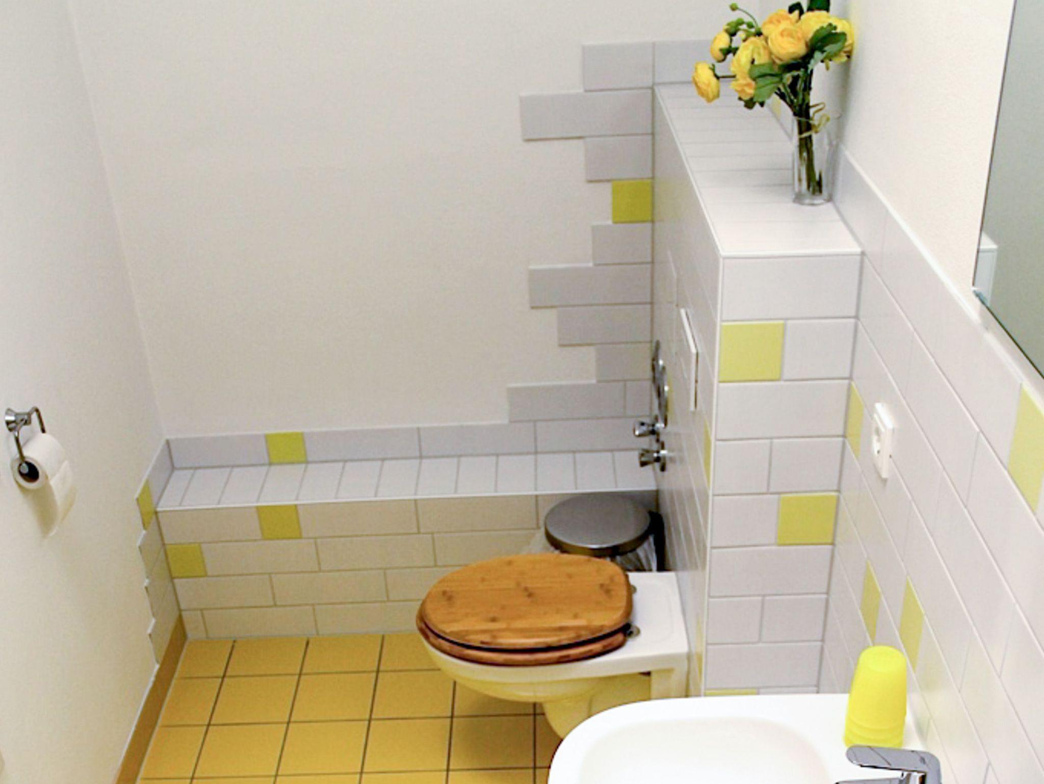 Diese 62m² große südöstliche Ferienwohnung, in Gelb gehalten, ist großzügig geschnitten, liegt im Obergeschoss und blickt zum Park mit den Gutsteichen und dem ehemaligen Café, zum Außenbereich für unsere Gäste. Hinter dem Gutsteich befindet sich der Spielplatz, dann folgt das Bistro/Café.