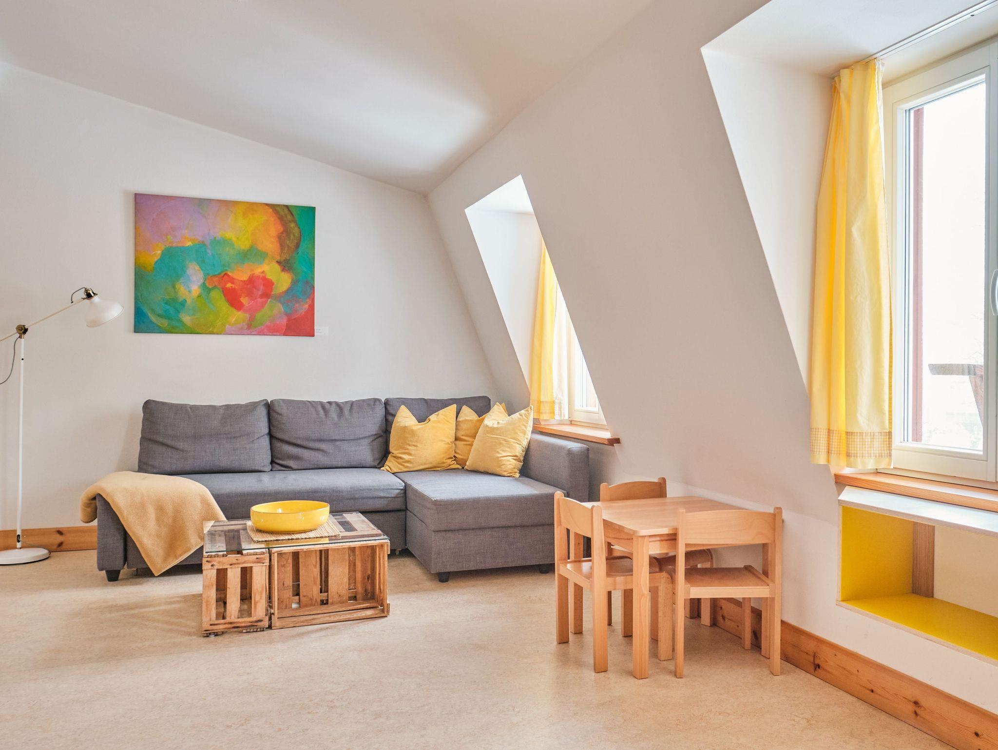 Sie hat 2 Schlafzimmer (1x Doppelbettzimmer mit Doppelbett (180x200; getrennte Matratzen), 1x Zweibettzimmer (90x200)), Wohnküche mit TV und Bad. Im Wohnbereich steht zusätzlich eine Schlafcouch (140x200) als Aufbettung für 1 Person zur Verfügung. Die Einrichtung stammt von befreundeten Designern und Tischlern, Künstler vom Hof und seiner Umgebung stellen ihre Bilder und Werke darin aus. Die Küche ist mit Geräten hohen Komforts und bester Energieeffizienz ausgestattet. Die Ferienwohnung ist über die Außentreppe und Galerie zu erreichen, auch direkt über den eigenen Balkon.