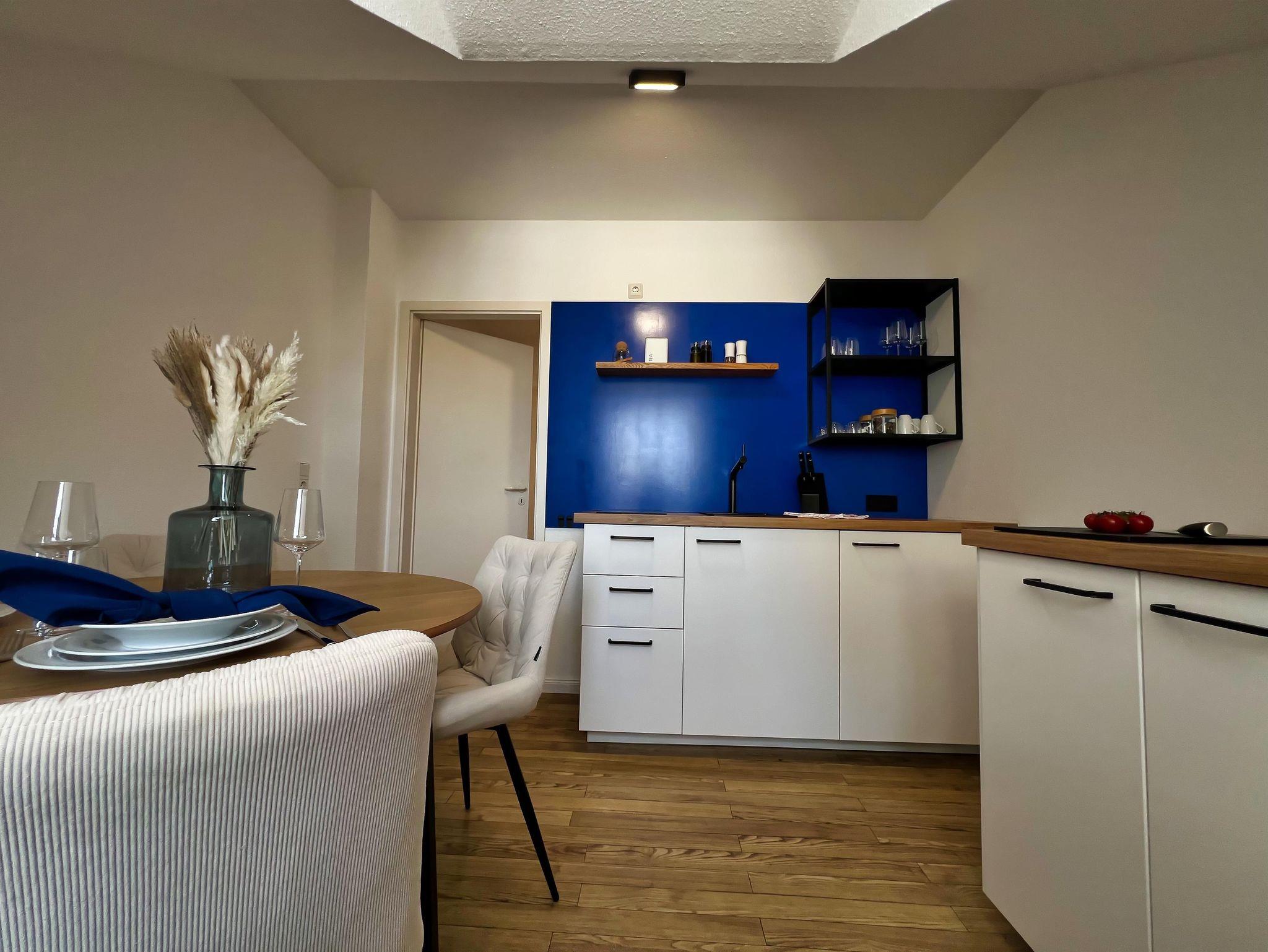 Die neue offene Küche lädt zum Kochen und Verweilen ein. Am großen Esszimmertisch ist ausreichend Platz für gemeinsame Mahlzeiten und gesellige Abende.