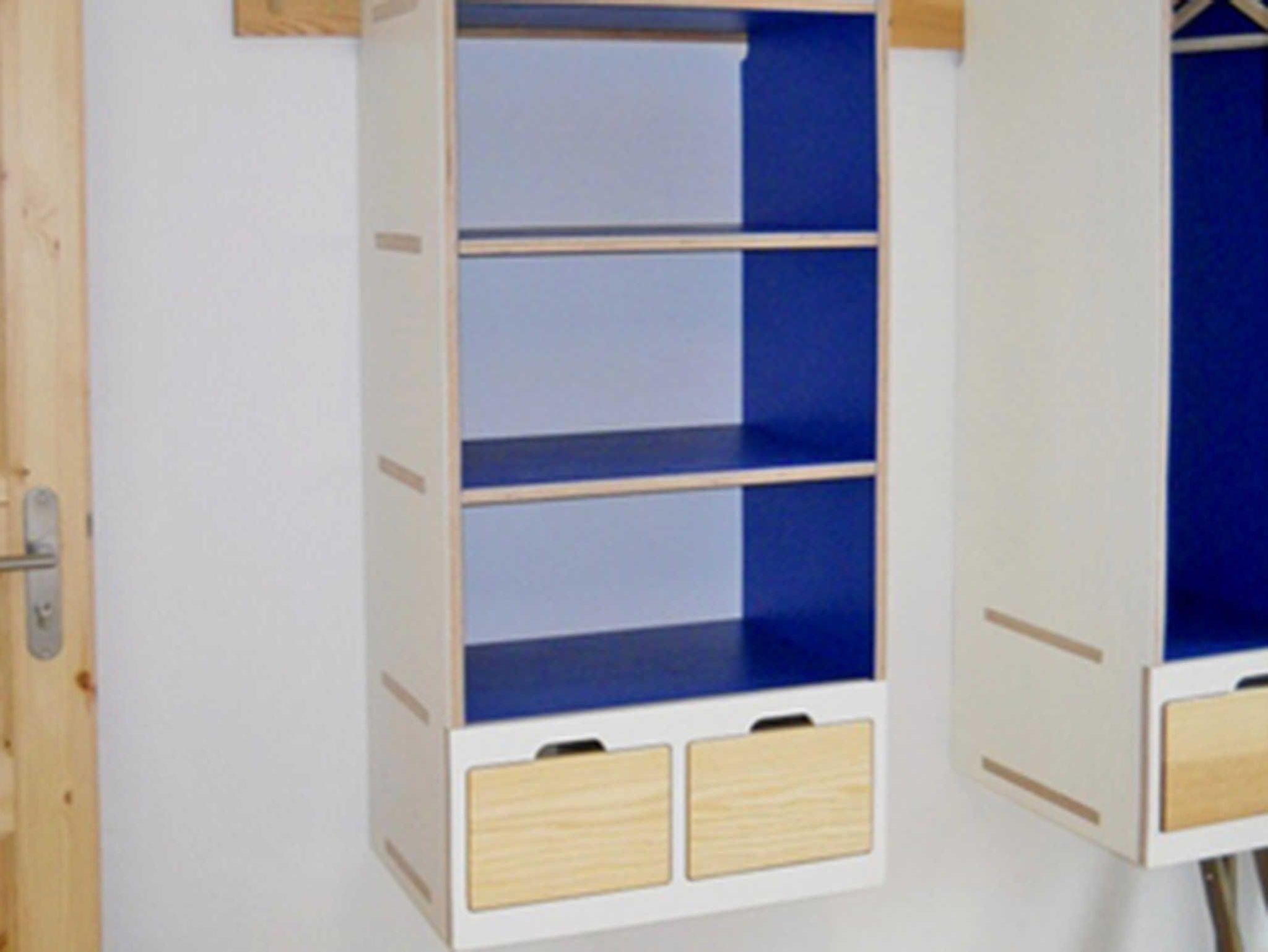 Die beiden in Blau gehaltenen Zimmer teilen sich ein Bad und eine Pantryküche im Flur, so ist eine Selbstversorgung möglich. Die Pantry ist mit allen notwendigen Geräten bester Energieeffizienz ausgestattet. Dieses 12m² große Zimmer, liegt im Obergeschoss und schaut zum Kuhstall, zur Kälberwiese mit rechts dem Kinderbauernhof, dahinter im Rund begrenzen die Bäume vom Seeufer den Ausblick. Die Einrichtung stammt von befreundeten Designern und Tischlern. Künstler vom Hof und seiner Umgebung stellen ihre Bilder und Werke darin aus.