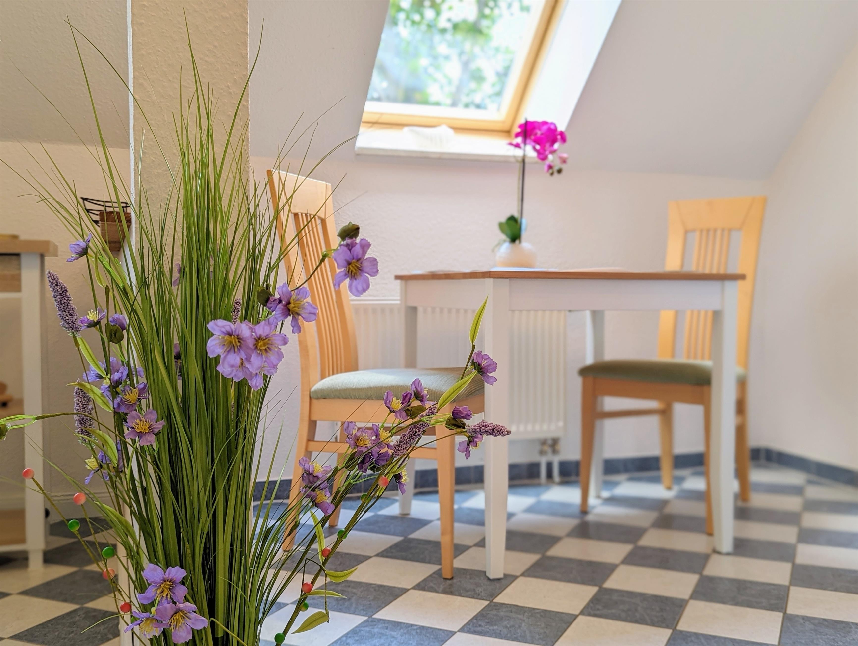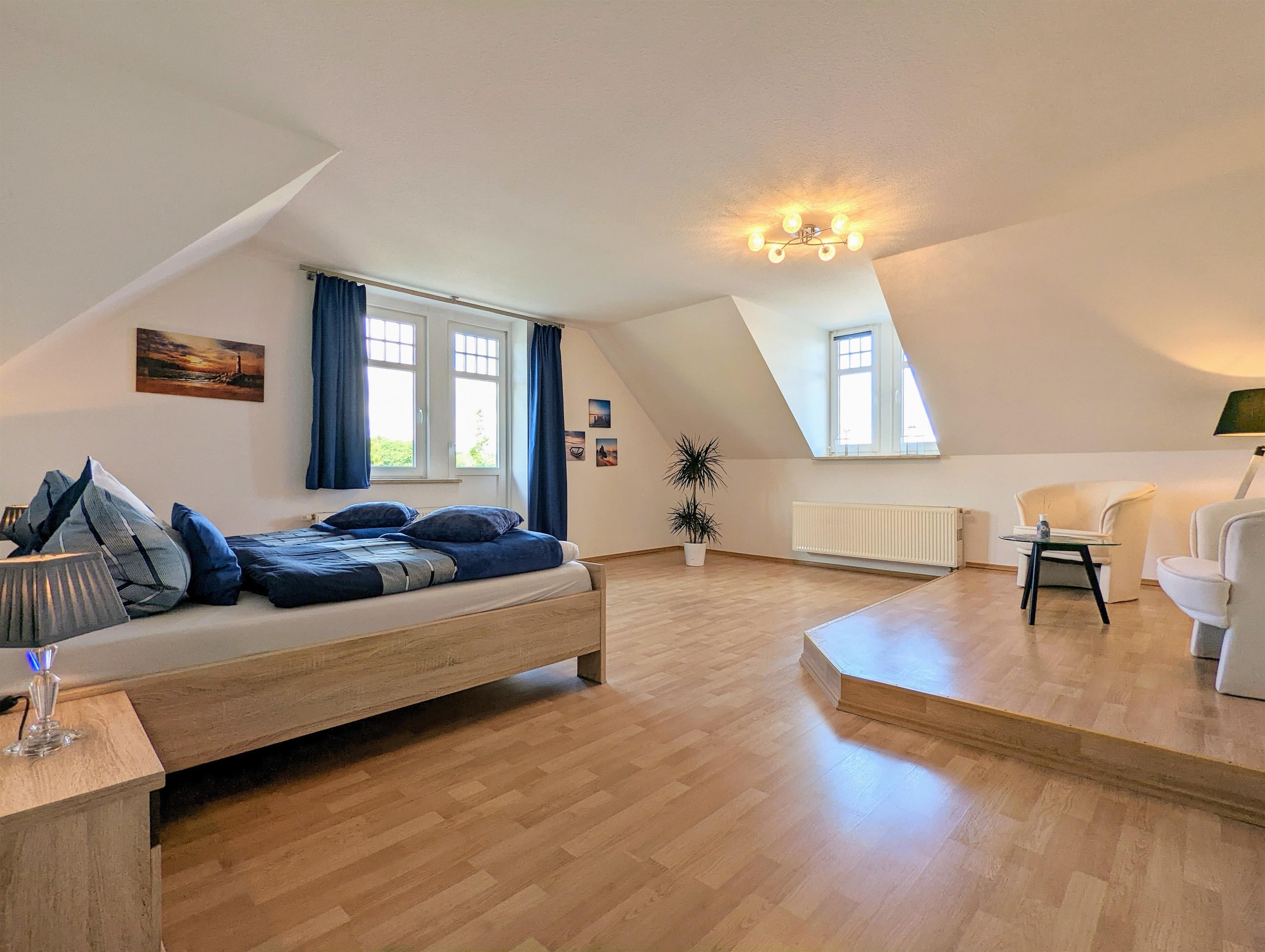 Auf 100 m² Wohnfläche bietet die Ferienwohnung genügend Freiraum für 2 Personen. Die Wohnung erstreck sich über das gesamte Dachgeschoss und bietet dadurch den schönsten Blick über den Schweriner See, bis zum Horizont. Von der Diele gelangen Sie in alle Räume. Das Wohnzimmer lädt mit einer großen Sofalandschaft und einem Essbereich zu gemütlichen Stunden ein. Vom Wohnbereich gelangen Sie auf den kleinen Balkon. Genießen Sie den freien Blick über den ganzen Schweriner See und zur Insel Kaninchenwerder. Das Schlafzimmer bietet mit seinem Doppelbett und der Leseecke einen idealen Ruhebereich. Auch von hier haben Sie einen wundervollen Blick auf den See. Auf Wunsch können Sie ein zweites Schlafzimmer mit Einzelbett hinzu bekommen. In der voll ausgestatteten Küche können Sie Ihre Lieblingsspeisen zubereiten. Das Bad ist mit Badewanne und einer großen Dusche ausgestattet. Zur Unterhaltung stehen Ihnen ein Smart-TV und WLAN zur Verfügung. Parken können Sie direkt vor dem Haus. Ein SUP (Stand Up Paddle) können Sie kostenfrei nutzen.