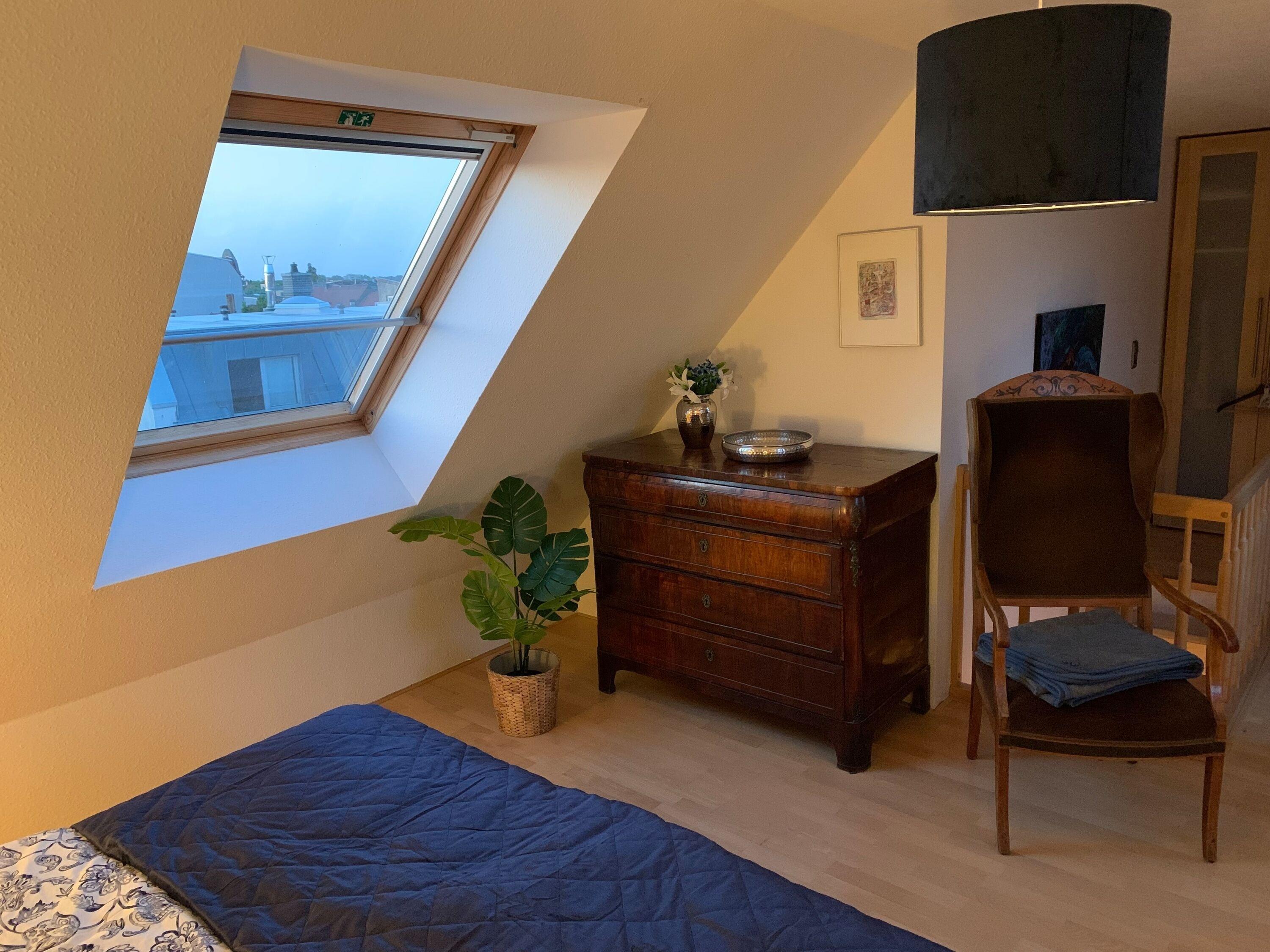 Unsere exklusive helle Maisonnette-Ferienwohnung für 2 - 1 Person befindet sich mitten im Herzen der Altstadt von Schwerin, im 3. Stock eines Mehrfamilienhauses direkt am Schweriner Ziegenmarkt. Das obige Bild zeigt den phantastischen Blick von Dachterrasse und Wohnküche. Die Wohnung ist hochwertig ausgestattet und verfügt über alle Annehmlichkeiten, die man für einen längeren Aufenthalt benötigt.