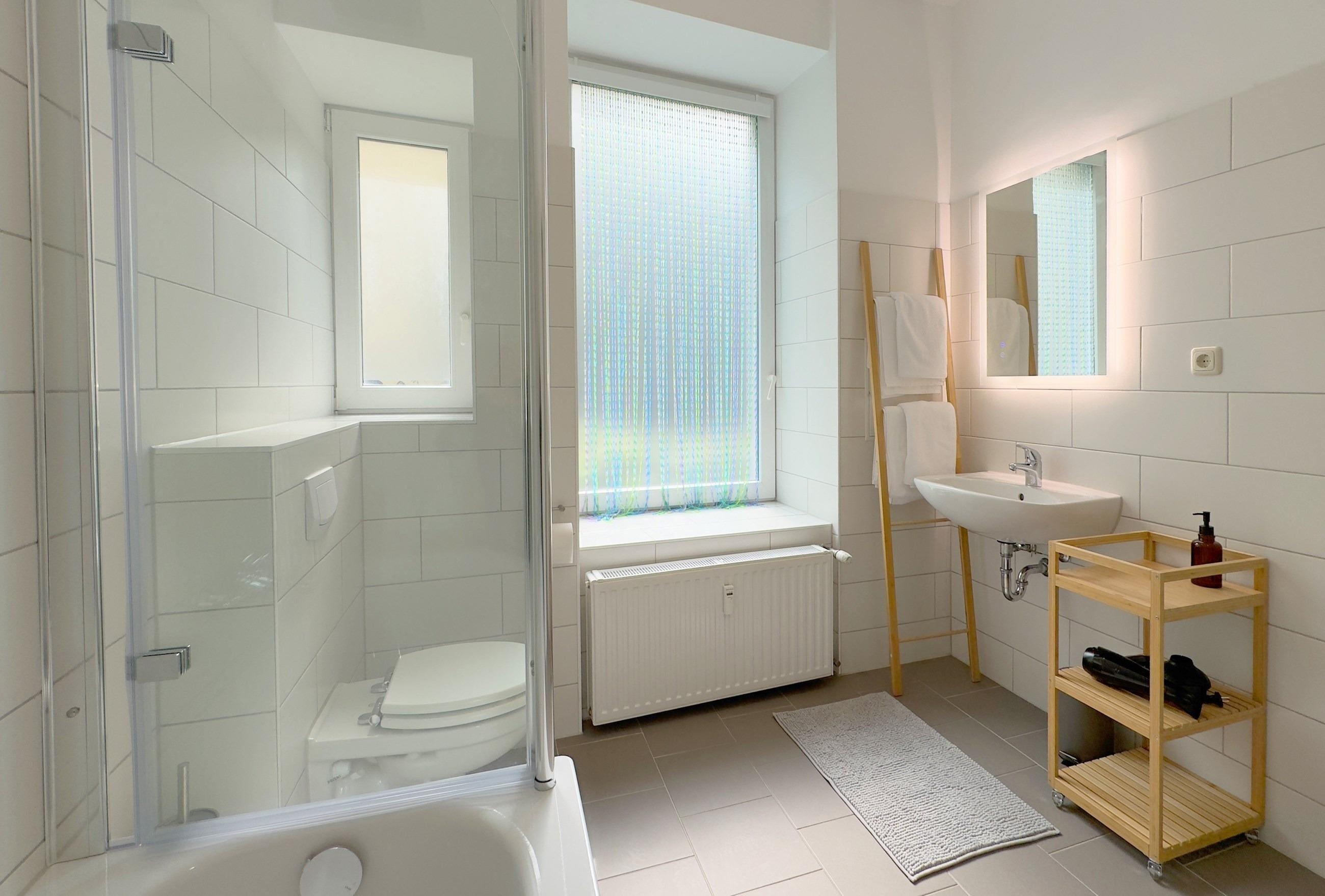 - Modernes Badezimmer mit Badewanne (mit Duschfunktion) und WC inklusive Waschmaschine mit Trocknerfunktion