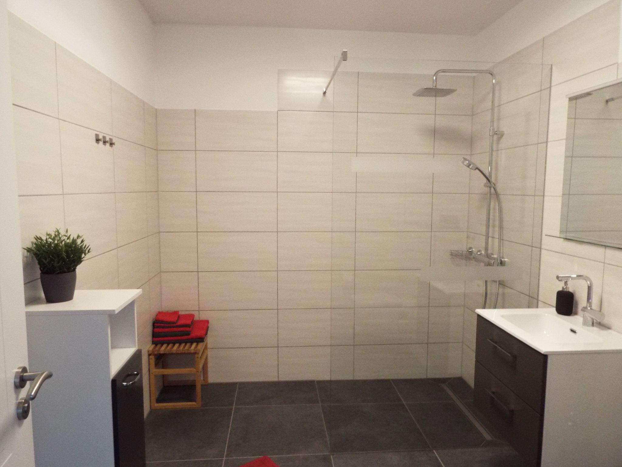 Die großzügigen Bäder haben eine ebenerdige Dusche und fügen sich mit ihrem modernen Design sehr gut in das Gesamtkonzept ein.
