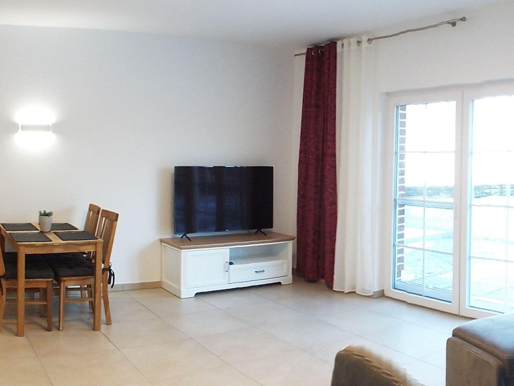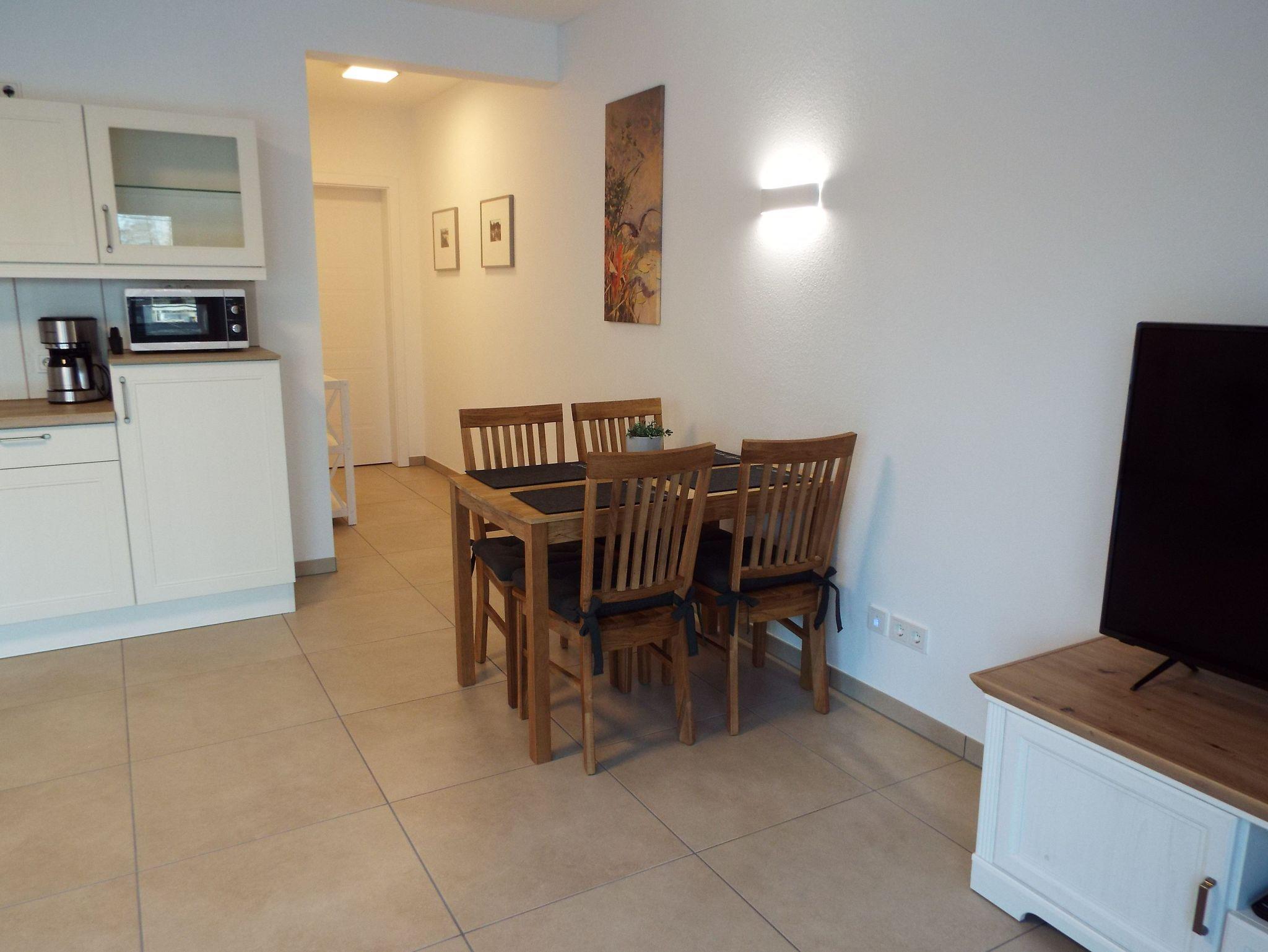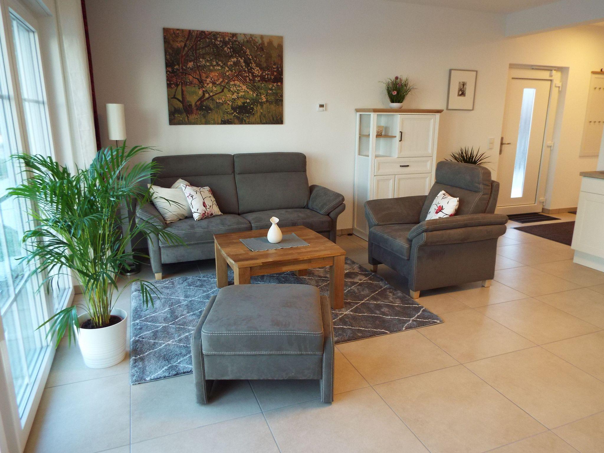 Die Ferienwohnung 1 ist ebenerdig und barrierefrei konzipiert und ist großzügige 70 qm groß. Sie lädt mit ihrer modernen Einrichtung und den warmen Farben zum Erholen und Entspannen ein. Die Wohnungen wurden mit viel Liebe hochwertig eingerichtet. Im großzügigen Wohnbereich finden Sie eine gemütliche Sitzecke mit einem 2-Sitzer und einem extra Sessel; natürlich auch einen Couchtisch. Hier findet sich auch der Flachbild-TV. In der offenen Landhausküche müssen Sie auf Nichts verzichten. Es gibt einen Elektroherd, einen Kühlschrank mit Gefriermöglichkeit, einen Geschirrspüler, eine Mikrowelle, eine Kaffeemaschine und auch einen Wasserkocher. Sie finden hier alles vor, was Sie zum Wohlfühlen und Kochen benötigen.