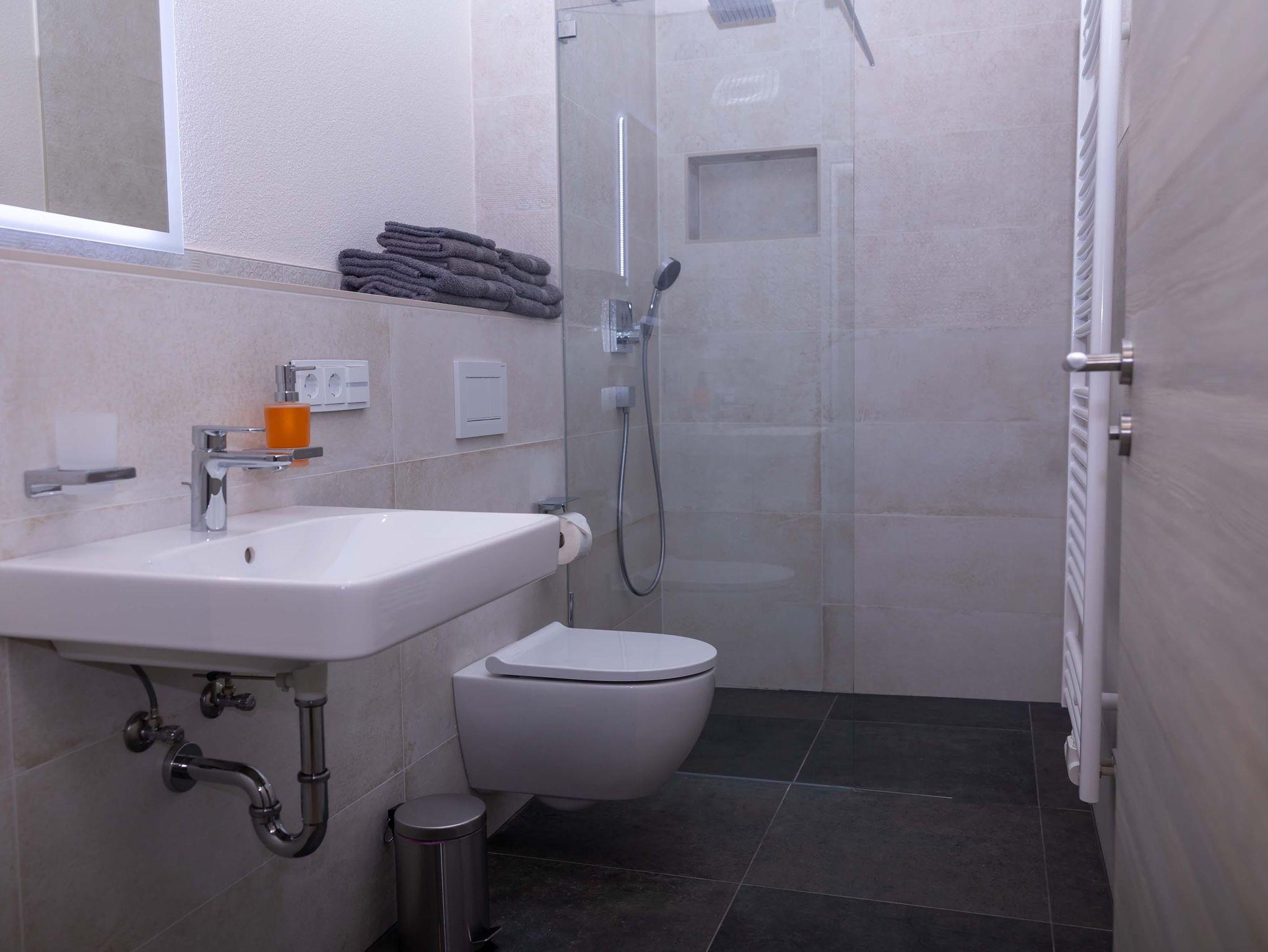 Für Ihre Nachtruhe stehen Ihnen zwei separate Schlafzimmer zur Verfügung: ein geräumiges Zimmer mit einem komfortablen Doppelbett und ein weiteres Schlafzimmer mit zwei Einzelbetten. Ausreichend Stauraum bieten der vorhandene Kleiderschrank und die Regale. Das Badezimmer ist praktisch und hell gestaltet und verfügt über eine Dusche, ein WC und ein Waschbecken.