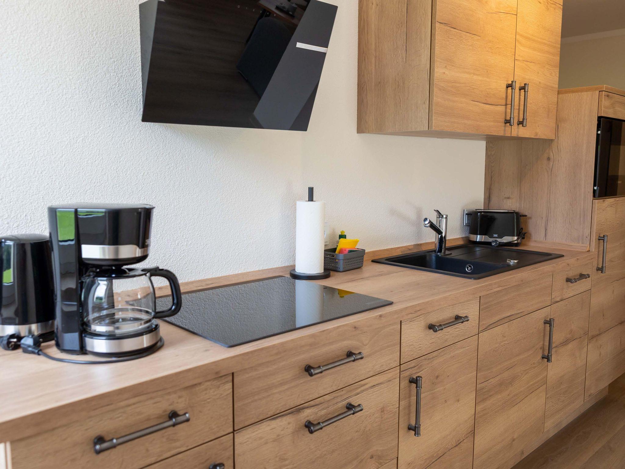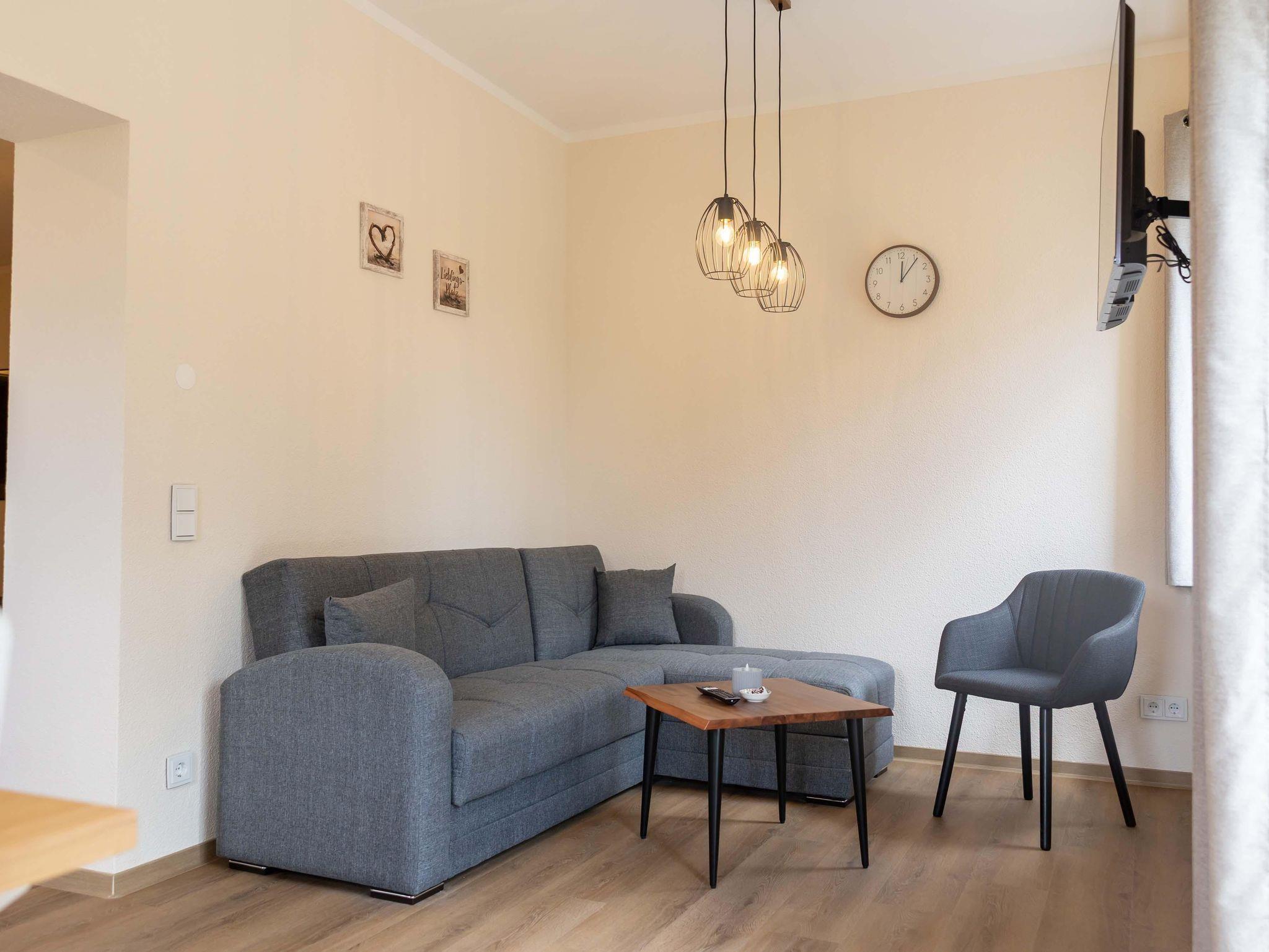 Entdecken Sie unsere charmante Ferienwohnung, beginnend mit der offenen Wohnküche, die keine Wünsche offenlässt. Die Küchenzeile ist mit modernen Geräten wie Geschirrspüler, 4-Zellen-Kochfeld, Mikrowelle, Kaffeemaschine, Kühlschrank (ohne Gefrierzelle), Wasserkocher und Toaster ausgestattet, ergänzt durch ein umfassendes Kücheninventar. Am Esstisch mit vier Stühlen können Sie entspannt frühstücken oder ein Abendessen genießen. Der Wohnbereich bietet Ihnen zusätzlich ein bequemes Sofa, einen Couchtisch und ein TV-Gerät für gemütliche Stunden.
