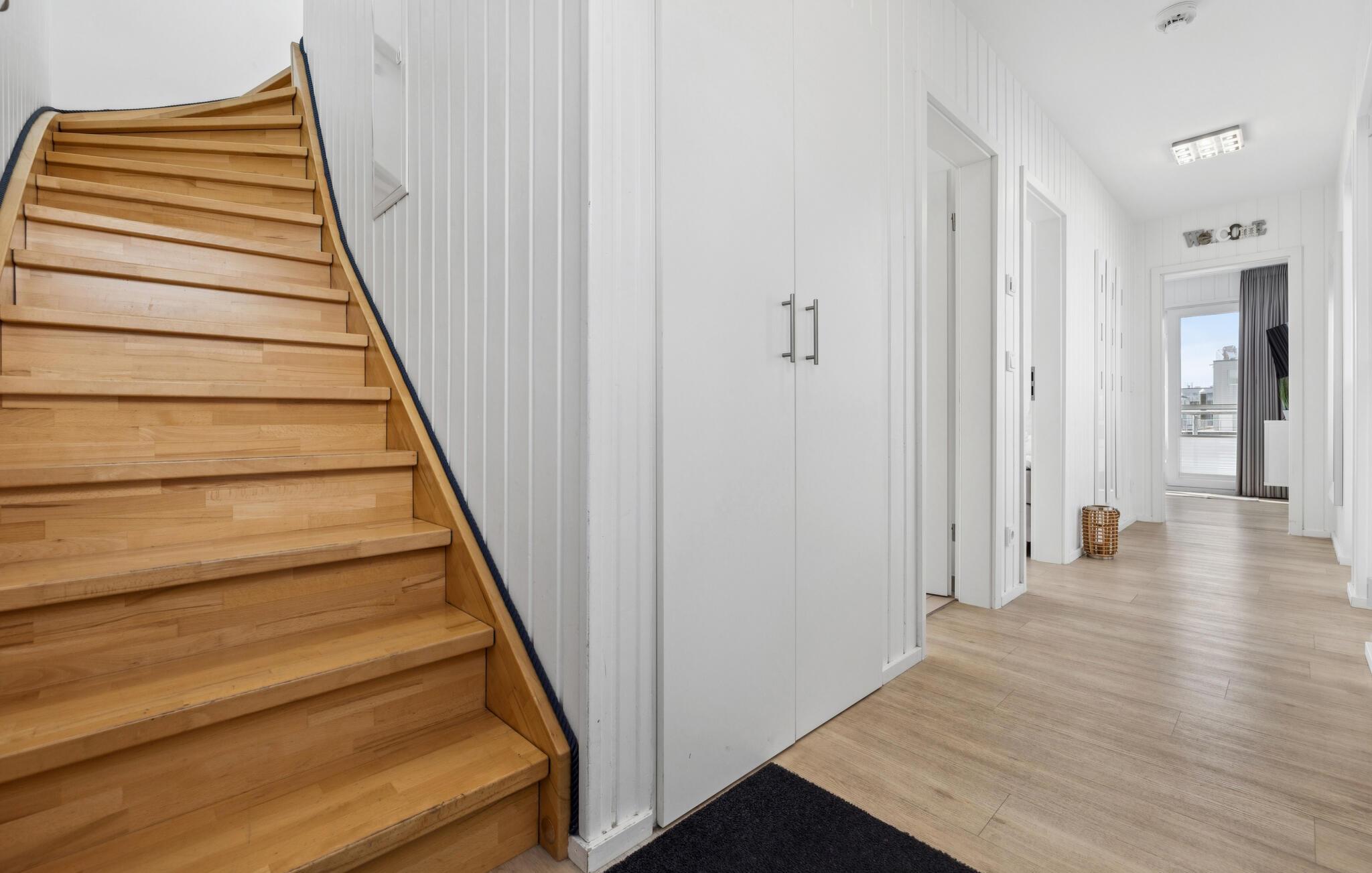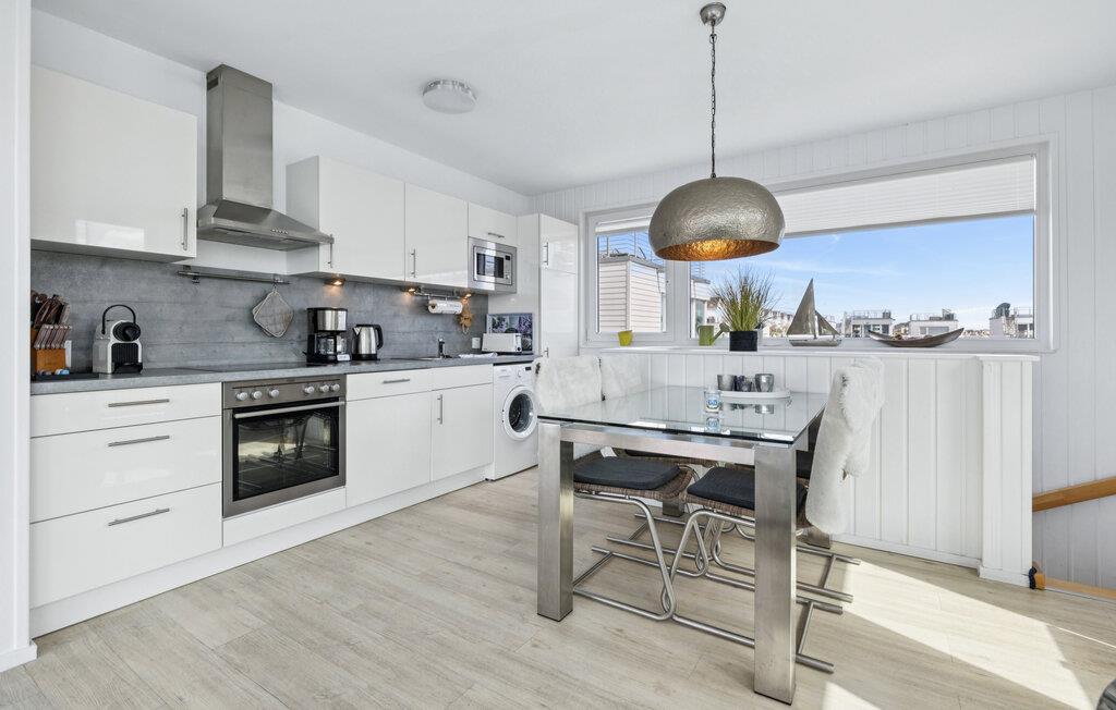 Det flydende hus strækker sig over tre plan. På øverste etage er der opholds- og spisestue i åbent plan med udsigt til vandet hele vejen rundt, fuldt udstyret køkken-alrum og tilstødende terrasse. Herfra har I adgang til den spektakulære tagterrasse med sol hele dagen og udsigt over sejl- og lystbådehavnen, Sleien og dens udmunding i Østersøen. Udstyret med havemøbler af høj kvalitet, en strandstol, liggestole og en Weber el-grill, tilbyder terrasserne en ren feriefølelse og betagende solnedgange.