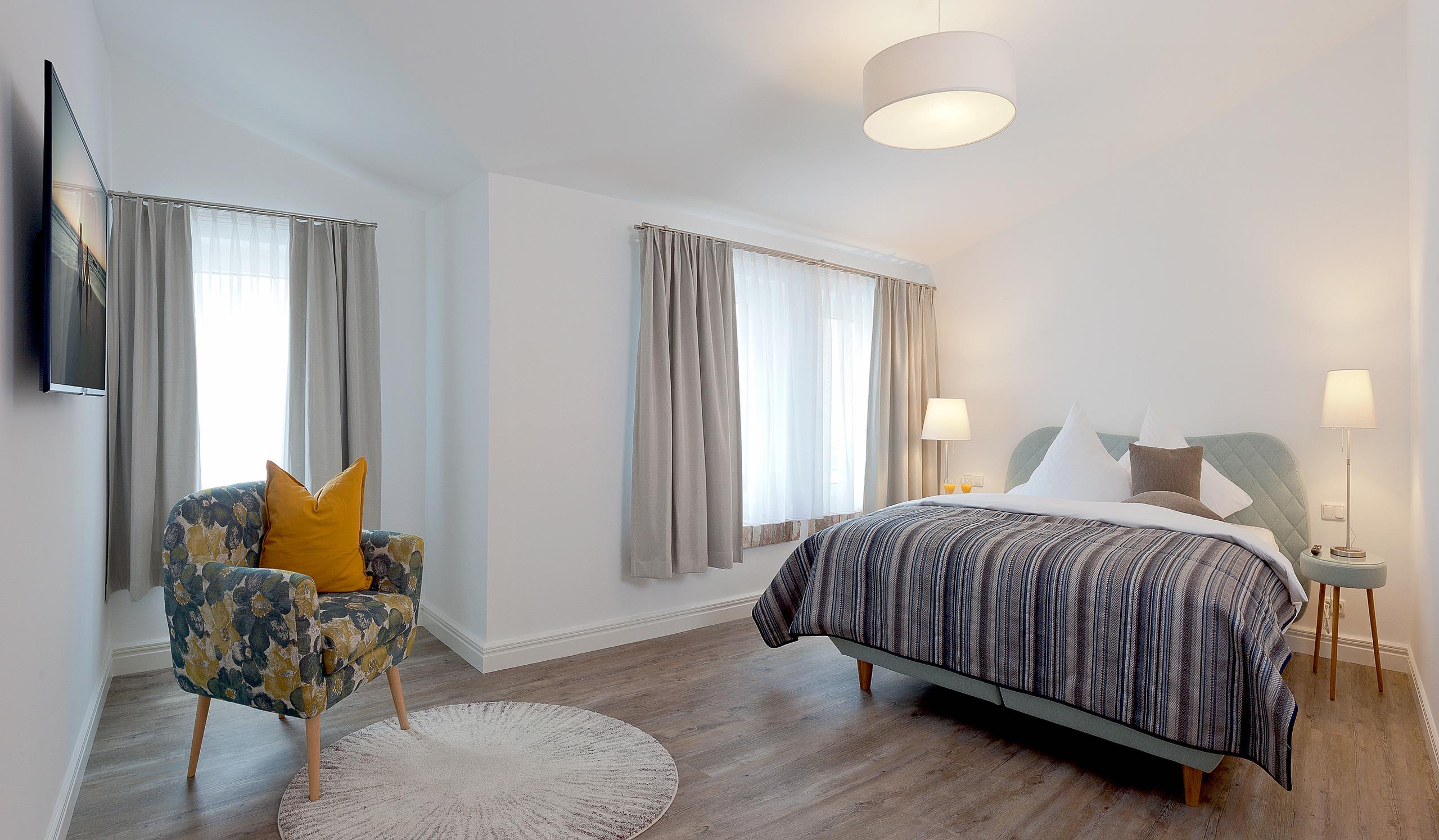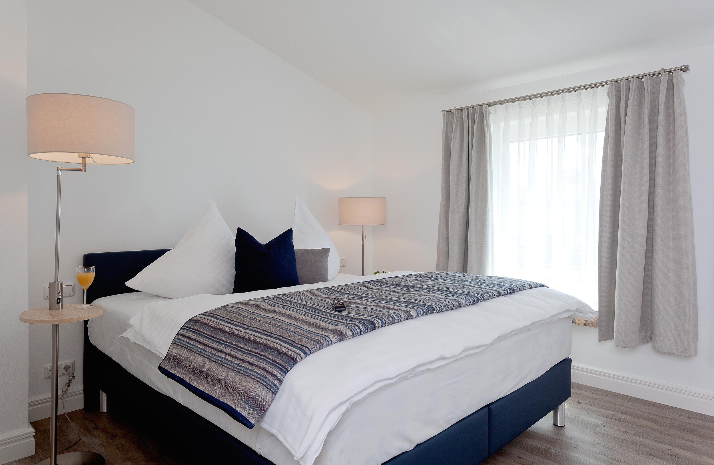Ebenfalls im Erdgeschoss befindet sich ein Schlafzimmer mit Bad en suite. Das Boxspringbett mit getrennten Matratzen (160 x 200) sowie die Möglichkeit der Verdunklung sorgen für erholsamen Schlaf. Ausreichend Schrankraum ist vorhanden. Das großzügige Bad mit Fenster bietet Ihnen sowohl Badewanne als auch Dusche und Waschtisch/WC.