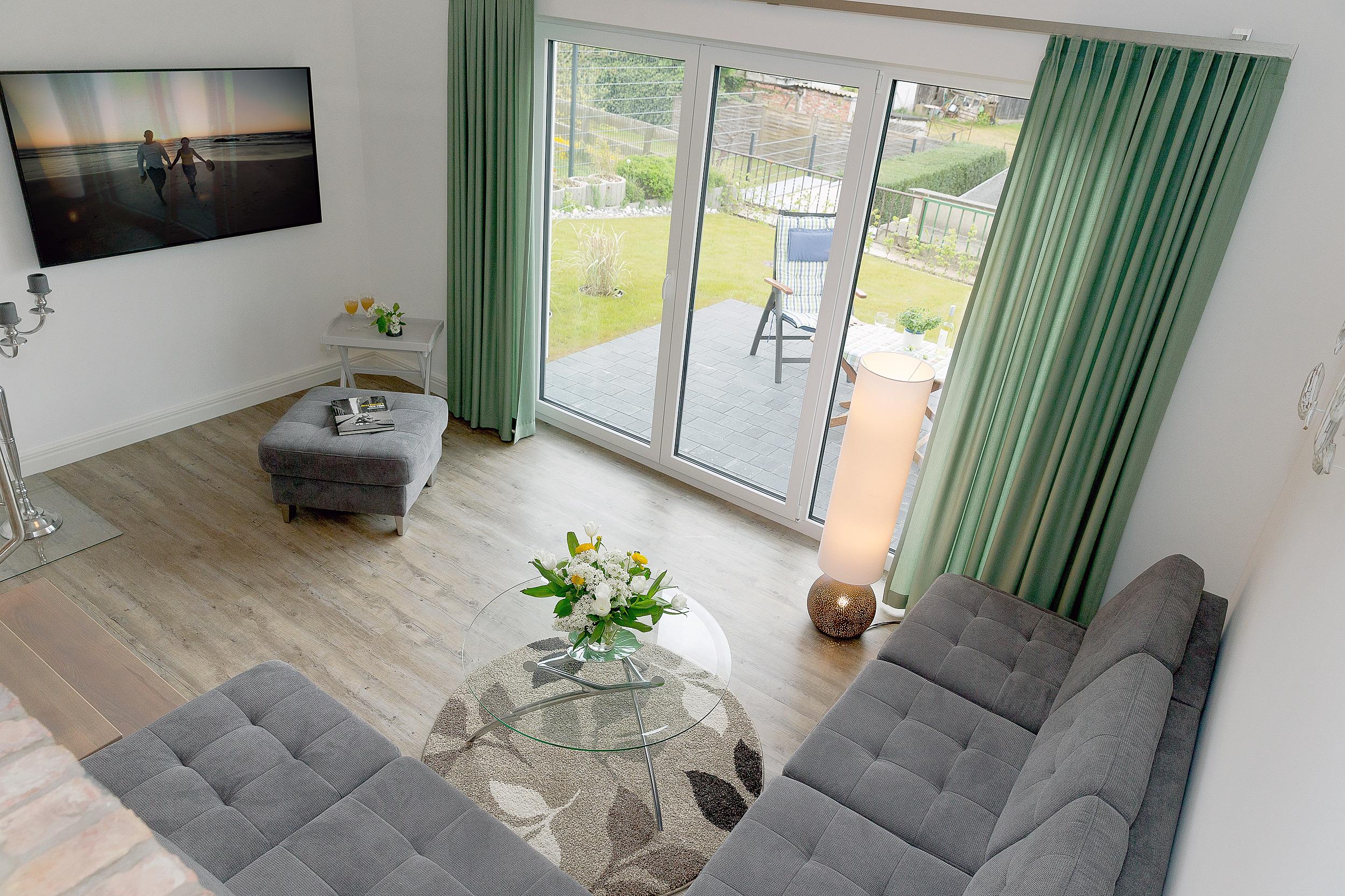 Diese moderne hochwertige 4-Zimmer Haushälfte erstreckt sich mit ihren 98 qm und ihren 4 Zimmern über zwei Ebenen. Alle Räume sind geschmackvoll und mit viel Liebe zum Detail gestaltet. Maximal 6 Personen können hier mit viel Komfort erholsame Ferien verleben. Im Erdgeschoss lädt die Wohnküche zum Kochen und zu gemeinsamen Mahlzeiten ein. Die moderne Küche ist mit Geschirrspüler, Cerankochfeld, Backofen, Kühlschrank etc. ausgestattet. Am angrenzenden bequemen Essplatz werden Sie gerne länger verweilen. Über ein paar Stufen abwärts erreichen Sie den offenen Wohnraum mit großem Ecksofa, Couchtisch und Flat TV. Von hier aus gelangen Sie auf die möblierte Terrasse, die südlich ausgerichtet ist und viel Sonne verspricht.