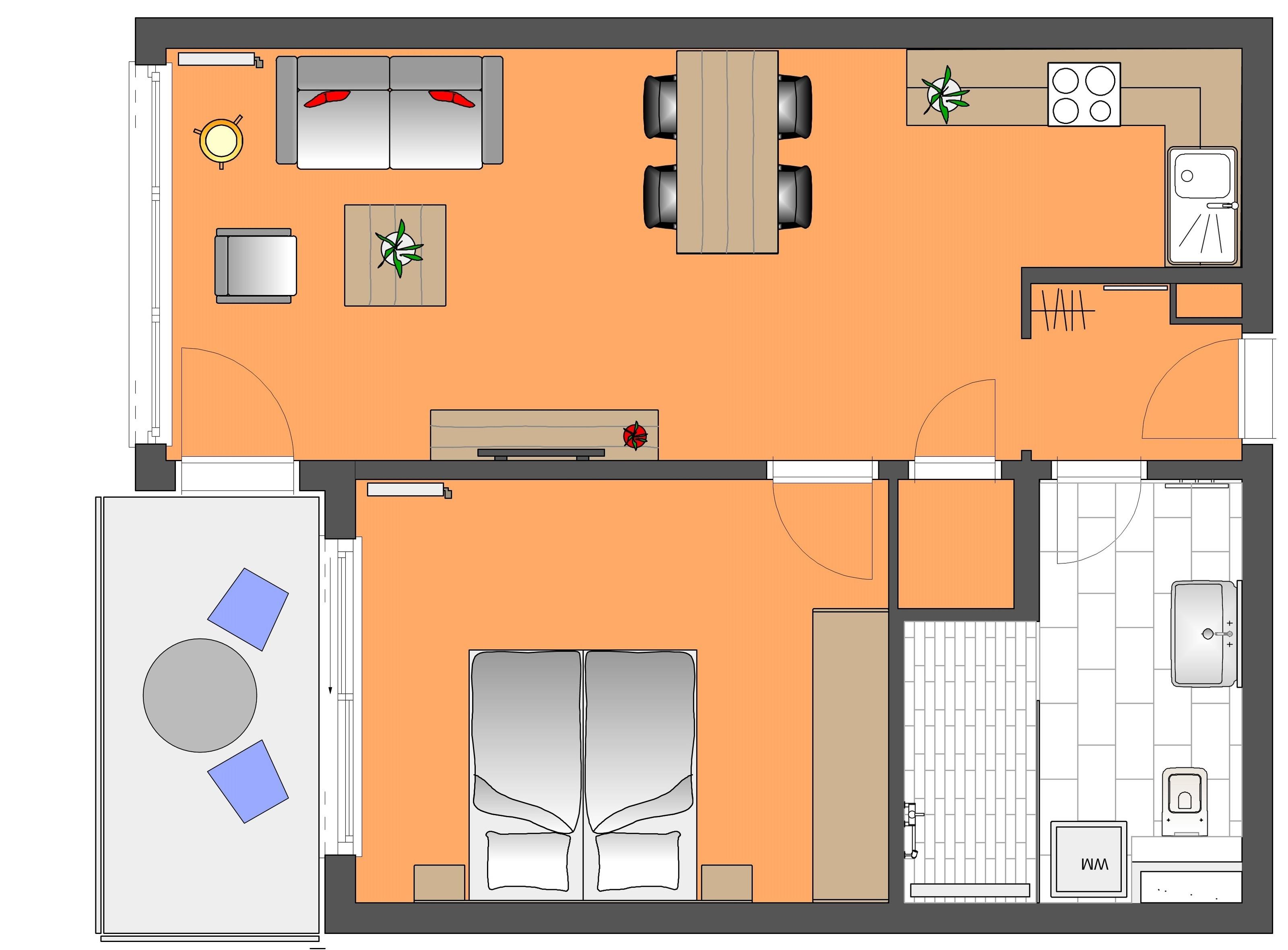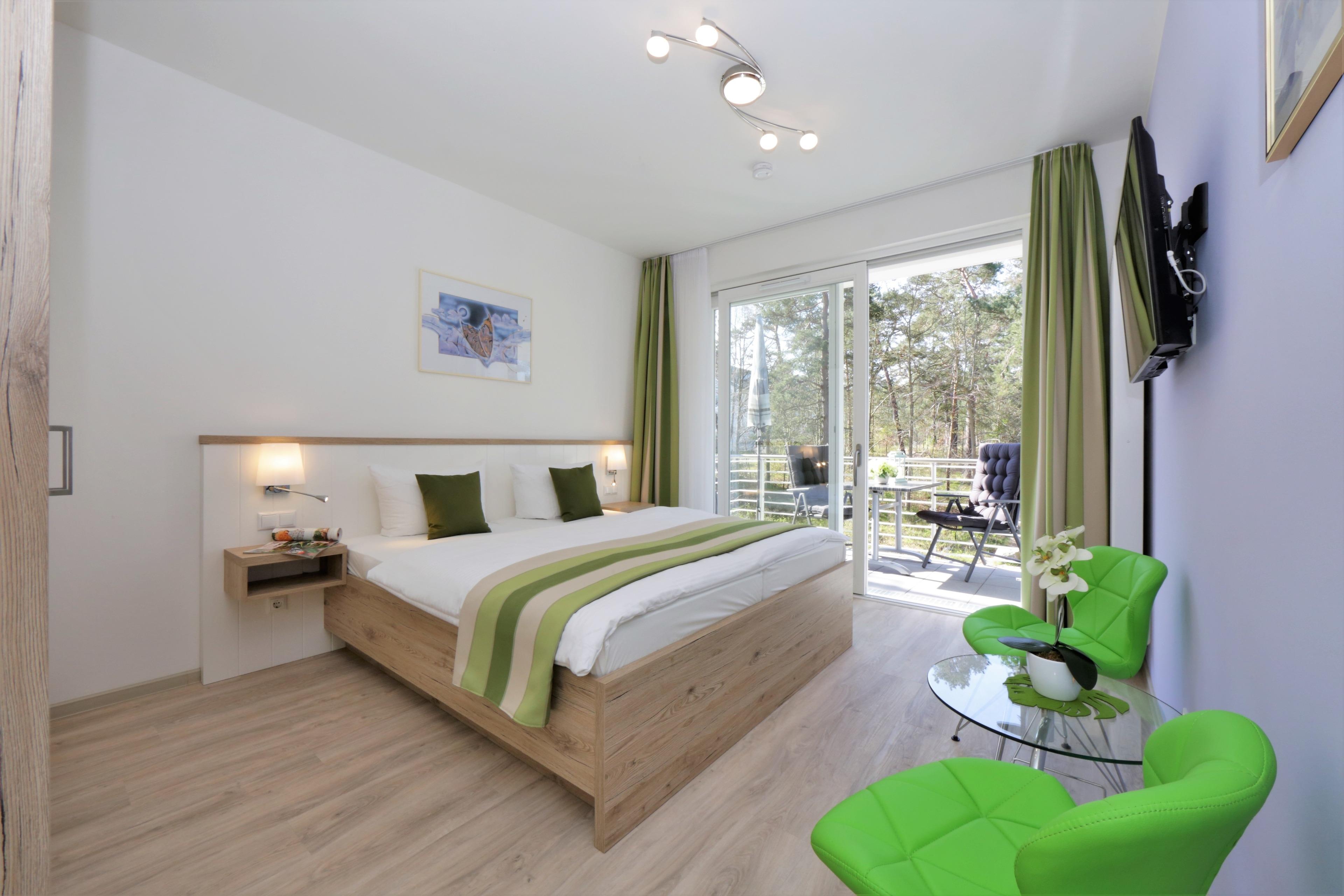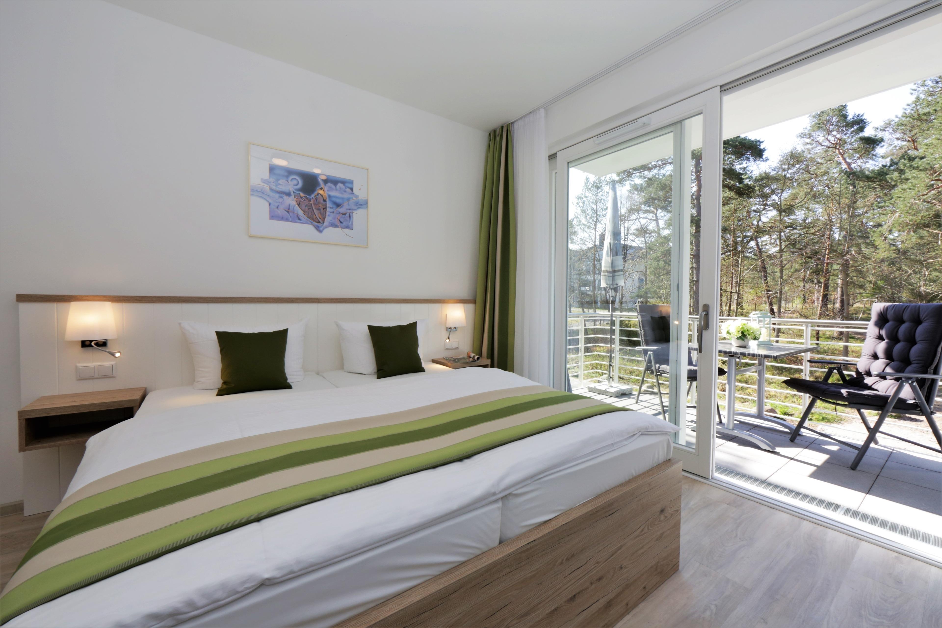 Dieses moderne 2-Zimmer Appartement ist 52 qm groß und befindet sich im 1. Obergeschoss der 2018 neu erbauten Strandresidenz. Die Wohnung ist für 2-4 Personen geeignet. Im Wohnbereich erwarten Sie eine bequeme Polstergarnitur mit Schlaffunktion (Matratze 160 x 200) mit Couchtisch und Flat TV sowie ein Esstisch für gemeinsame Mahlzeiten. Die moderne Küche mit Cerankochfeld, Backofen, Mikrowelle, Geschirrspülmaschine, Kühlschrank, Tiefkühlfach etc. ist ebenfalls offen im Wohnraum integriert. Über den Wohnbereich sowie das Schlafzimmer erreichen Sie den zum Süden ausgerichteten überdachten Balkon, der viele Sonnenstunden verspricht. Das Schlafzimmer verfügt über ein Doppelbett mit getrennten Matratzen (90 x 200) und einen Kleiderschrank. Das großzügige moderne Badezimmer ist mit einer bodengleichen Dusche mit Echtglasabtrennung und Waschtisch/WC ausgestattet.