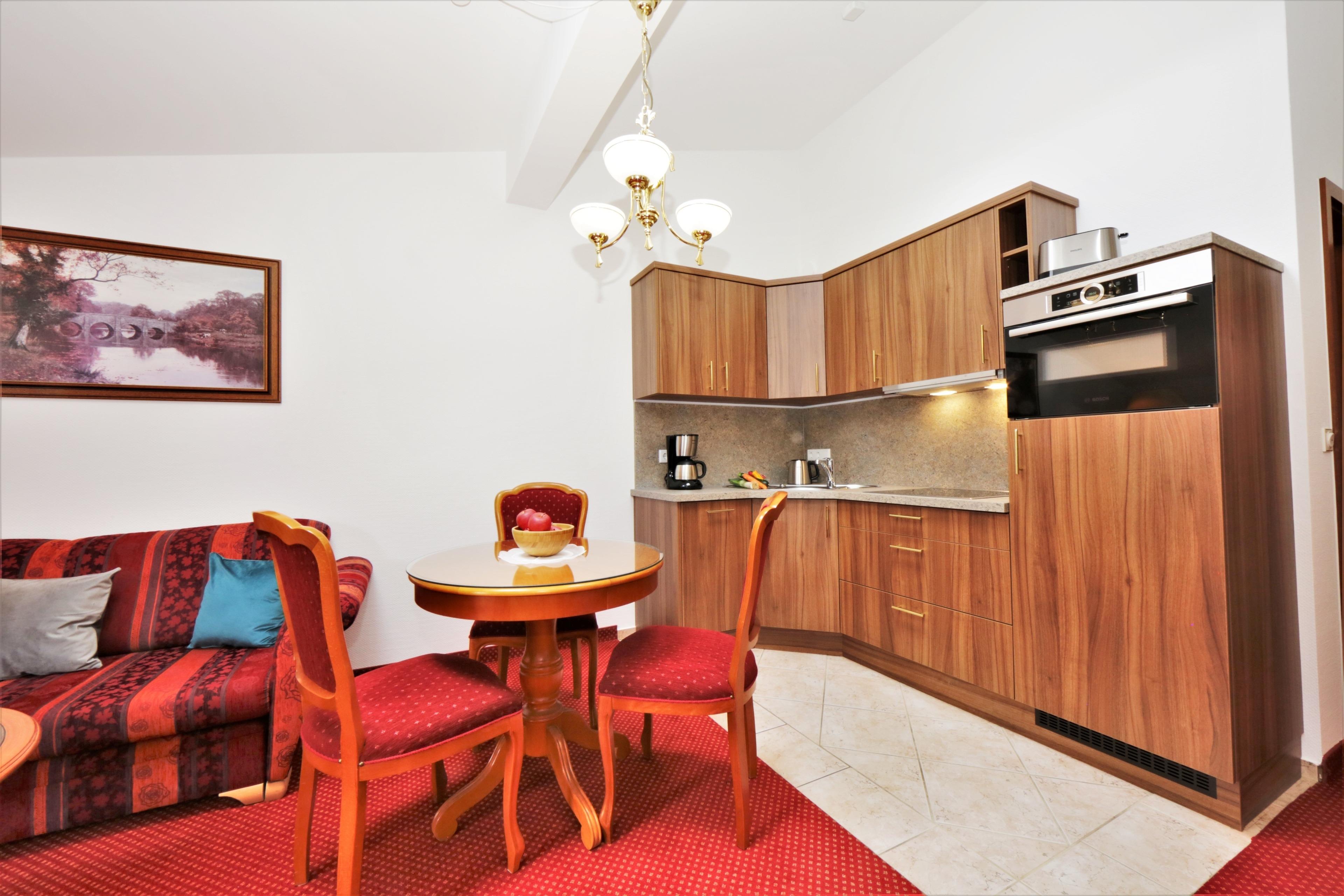 Diese 45 qm große 2-Zimmer Wohnung im italienischen Stil befindet sich im Dachgeschoss und bietet 2 Personen ausreichend Platz für einen erholsamen Urlaub am Meer. Das Wohnzimmer ist mit einer Couch, Sessel, Couchtisch und TV sowie einem kleineren Esstisch und drei Stühlen eingerichtet. Die moderne Küchenzeile, ausgestattet mit Cerankochfeld, Backkofen mit Mikrowellenfunktion, Kühlschrank mit Gefrierfach etc. ist offen im Wohnraum integriert. Das Schlafzimmer ist mit einem Boxspringbett mit getrennten Matratzen (90 x 200), einem Kleiderschrank und Kofferablage möbliert. Ein kleiner seeseitiger Balkon, von dem aus Sie teilweise das Meer sehen können, ist sowohl vom Wohn- als auch vom Schlafraum begehbar. Das gut ausgestattete Bad bietet den Gästen Badewanne, Echtglasdusche und Waschtisch/WC. Außerdem steht Ihnen ein separates Gäste-WC zur Verfügung. Der Pkw-Stellplatz befindet sich unmittelbar vor dem Haus und ist der Wohnung zugeordnet.