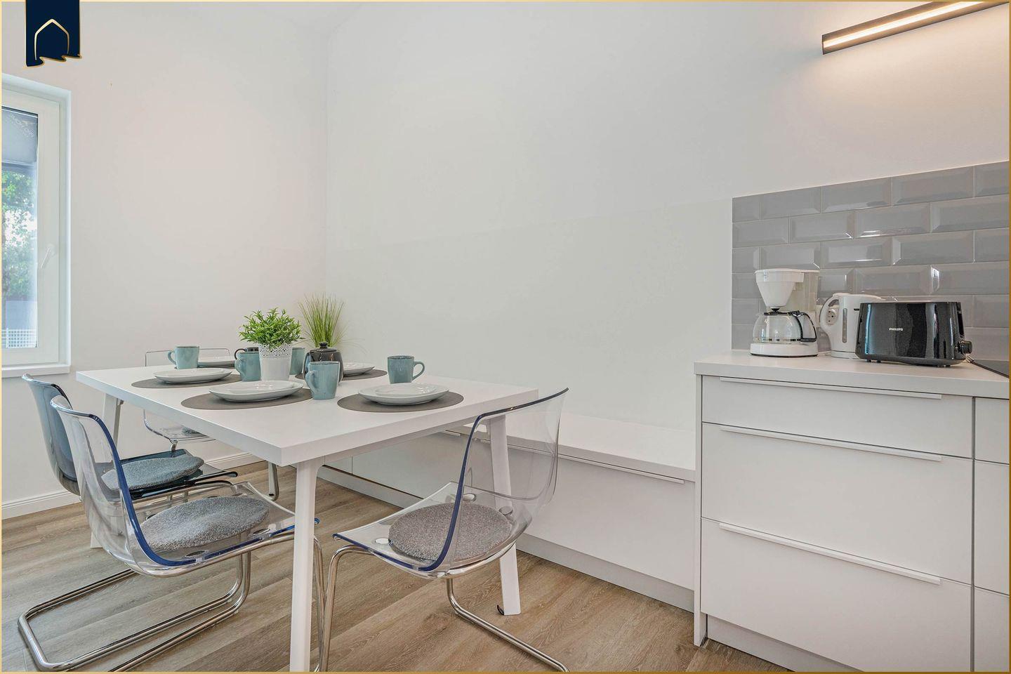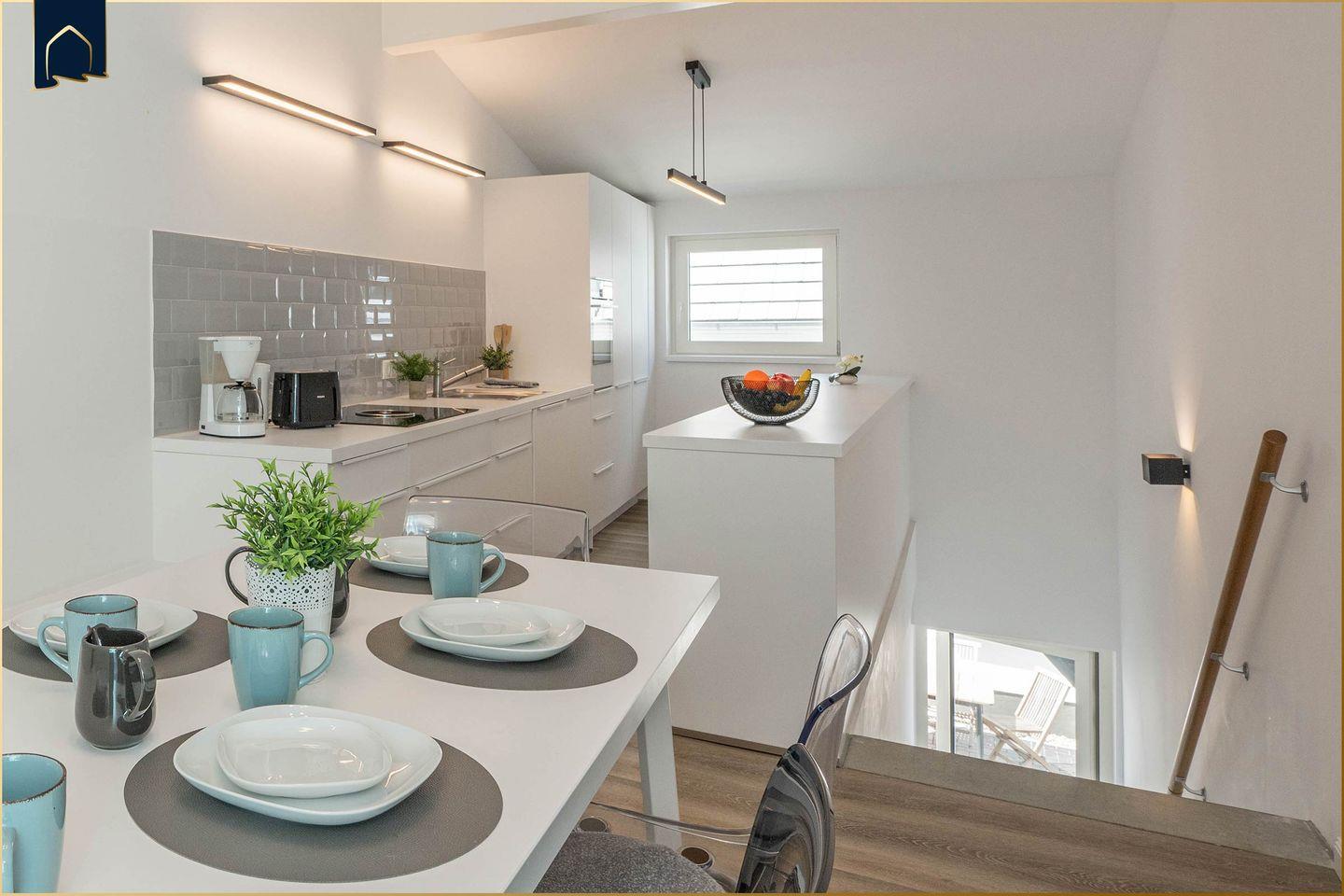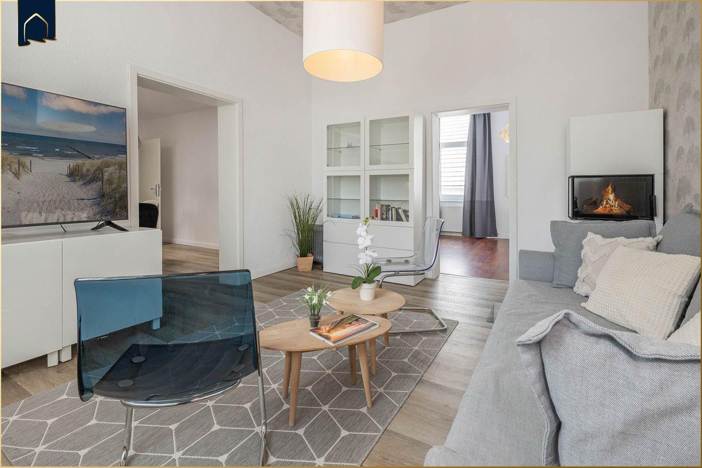 Mit insgesamt 4 Schlafzimmern, 2 voll ausgestatteten Badezimmern sowie 2 separaten WCs bietet diese Unterkunft großzügigen Raum für bis zu 8 Personen. Die offene Küche verfügt über einen Herd, Backofen, Gefrierfach, Spülmaschine, Kühlschrank, Wasserkocher, Kaffeemaschine und Toaster – ideal für gemeinsame Kochabende. Ein einladendes Wohnzimmer mit Sofaecke, zwei TVs und Kamin sorgt für gemütliche Stunden auch an kühleren Tagen. Die moderne Einrichtung kombiniert Funktionalität mit maritimem Flair.