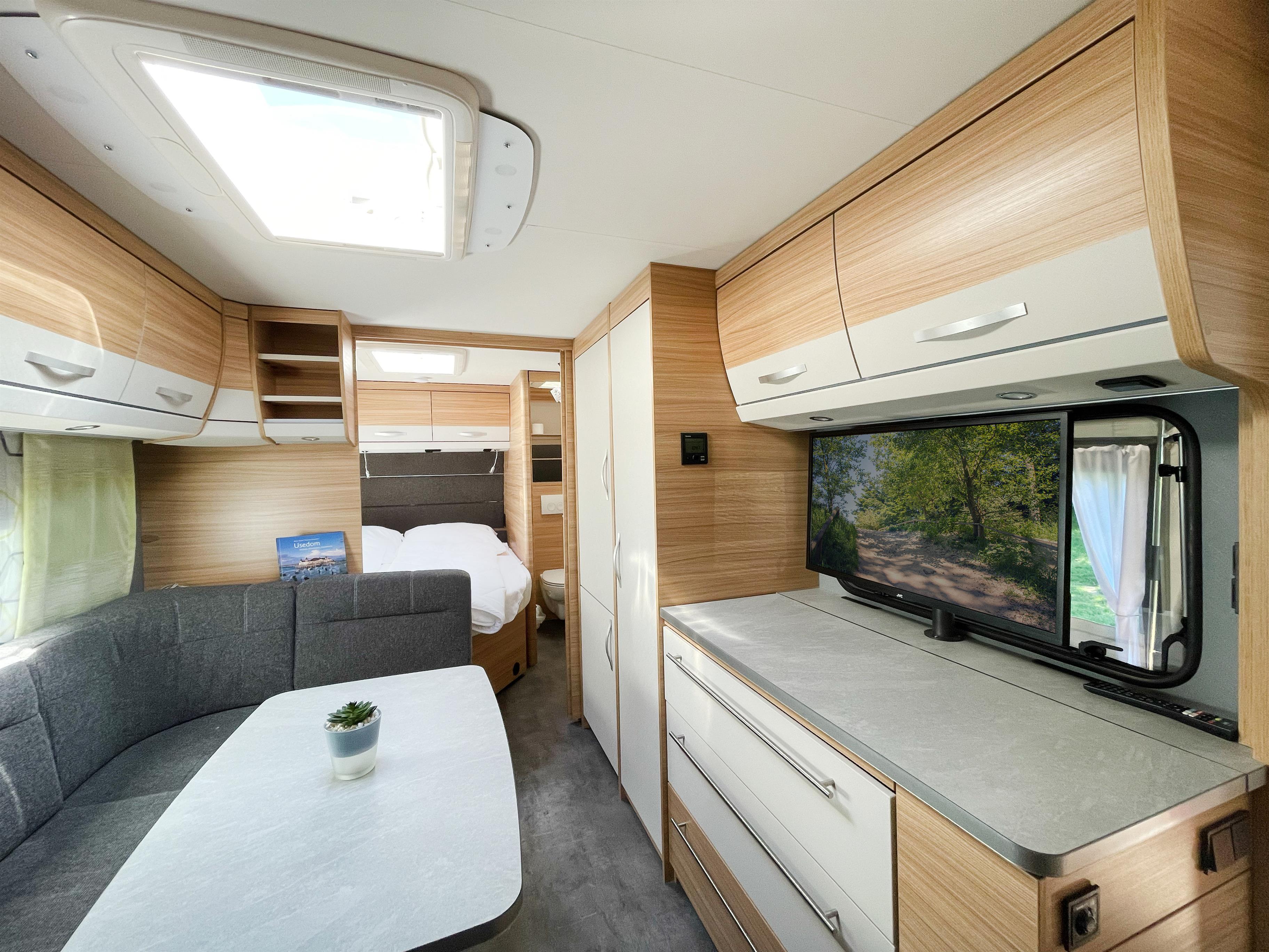 Im hinteren Teil des Wohnwagens befindet sich separat eine Toilette; ein Waschbecken steht im Schlafraum zur Verfügung. Des Weiteren befindet sich im mittleren Teil des Wohnwagens ein Tisch mit großzügiger Sofaecke und einem Fernseher, der auch zum Vorzelt hin schwenkbar ist und somit das Fußballspiel auch im Vorzelt genossen werden kann. Dank des durchdachten Designs bietet das Innere des Wohnwagens viel Stauraum.