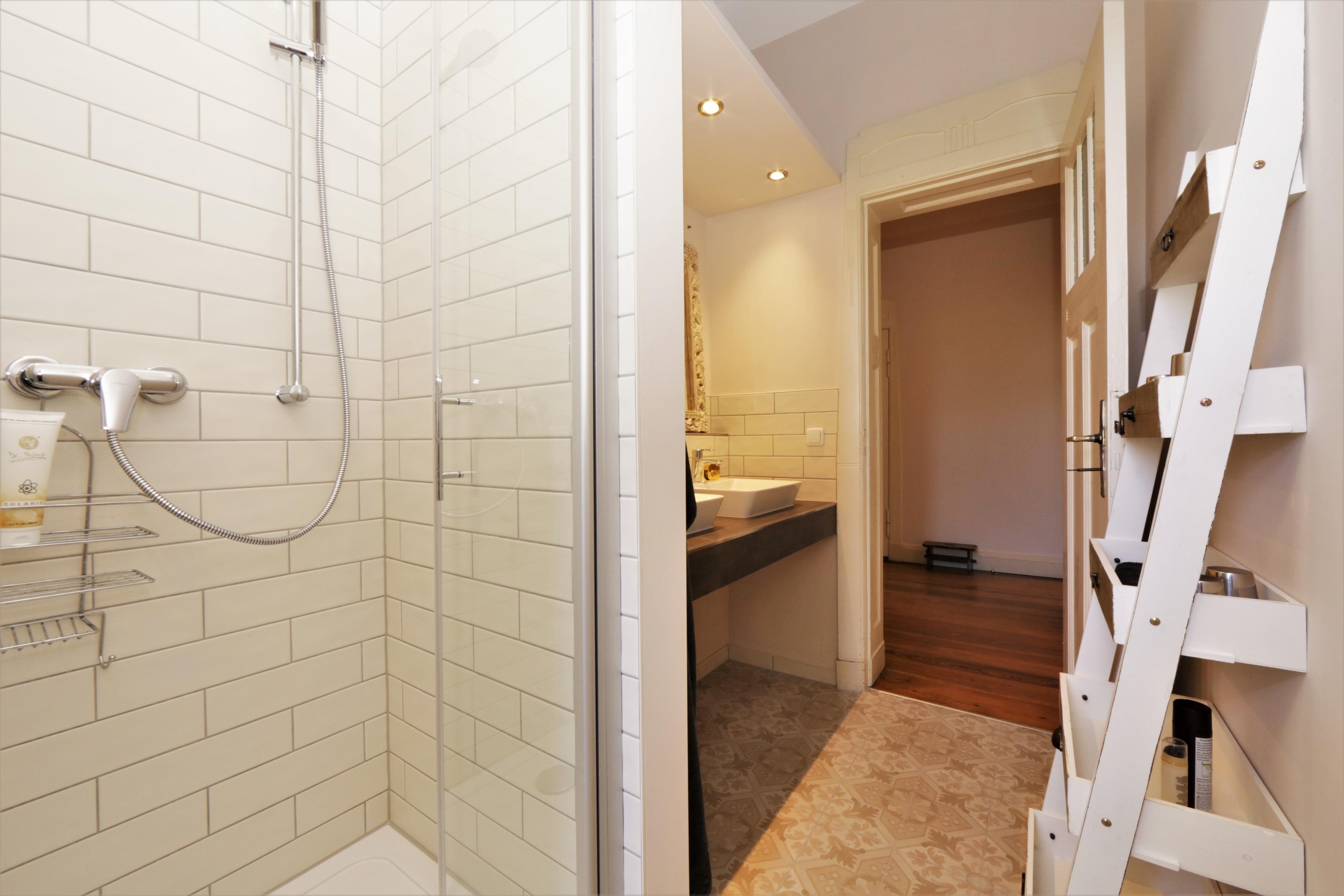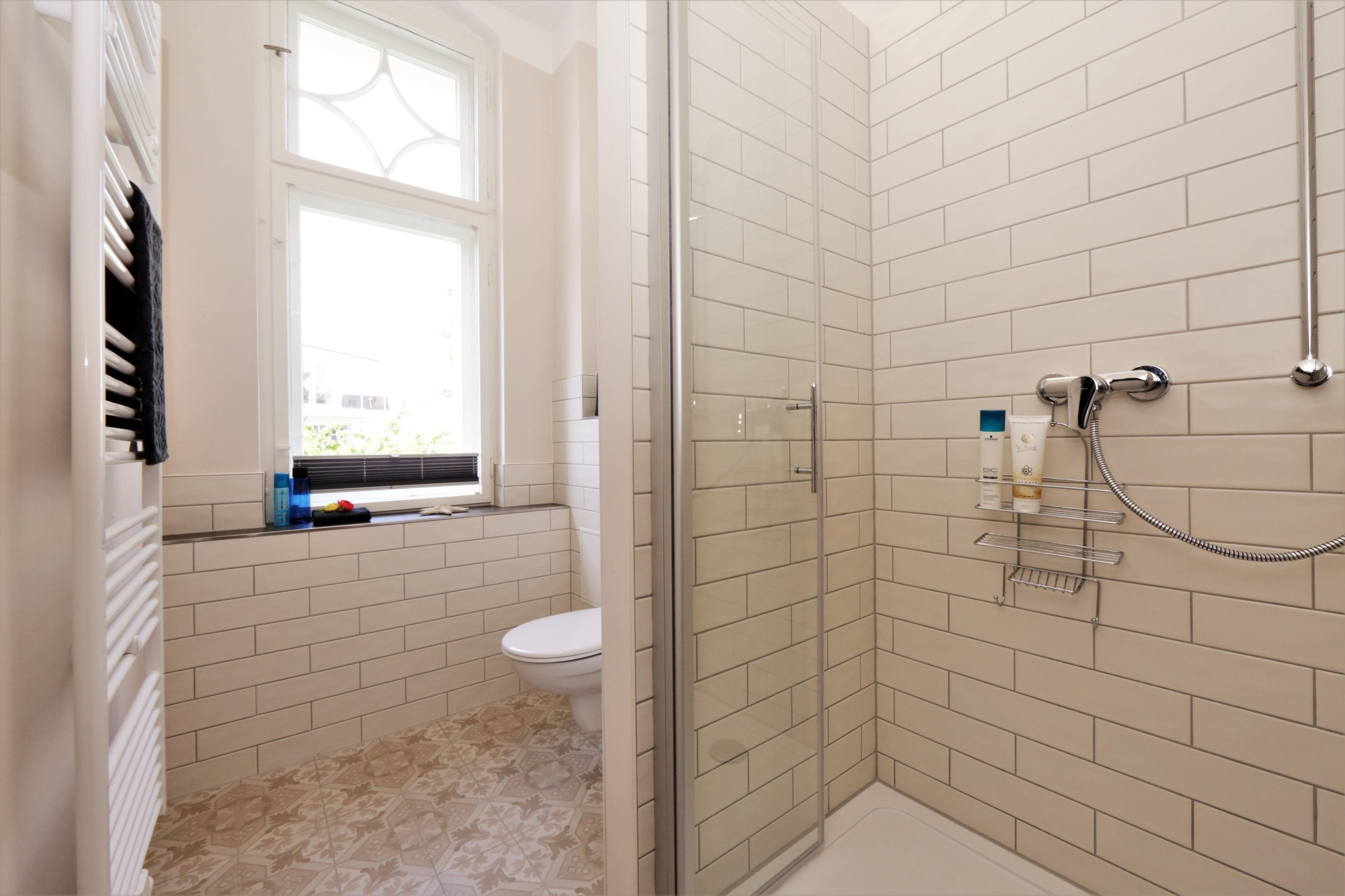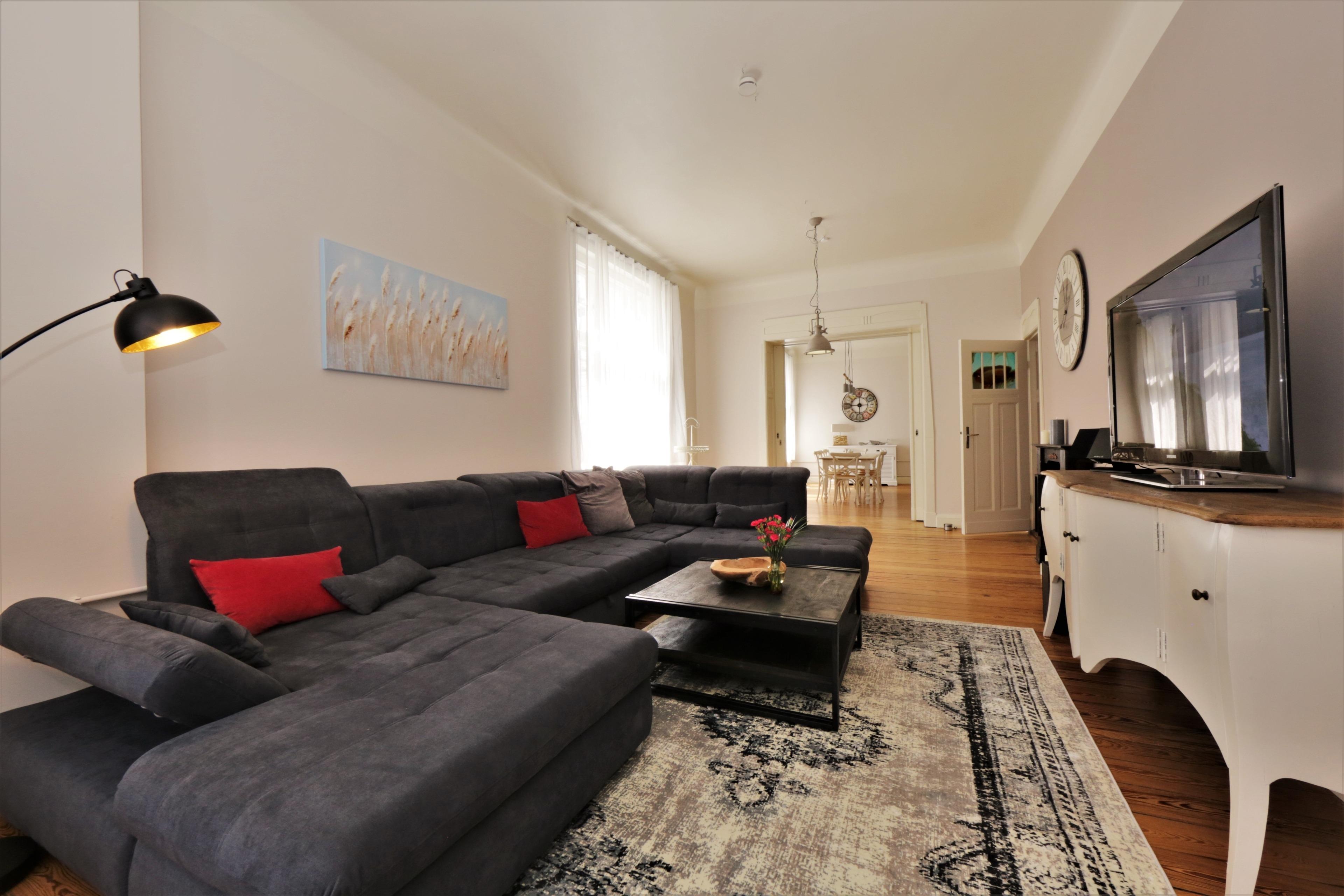 Dieses 135 qm große 4 Zimmer Appartement befindet sich im 1. Obergeschoss der Villa Noah. Hier können 2-8 Personen Ihren Urlaub ganz nah am Meer verleben. Bei der Einrichtung dieser Wohnung wurden geschickt die historischen Elemente der Bäderarchitektur mit modernem Design kombiniert. In der gesamten Wohnung ist der zeitlos schöne Dielenfußboden sehr gut erhalten. Im großzügigen Wohnraum finden Sie eine moderne Wohnlandschaft (mit Schlaffunktion 140 x 200) und einen großen Flat TV. Die Wohnküche, die vom Wohnraum und vom Flur begehbar ist, bietet den Gästen einen Essplatz für bis zu 8 Personen, der zu ausgiebigen geselligen Mahlzeiten einlädt. Die moderne Küchenzeile ist mit Kühlschrank, Geschirrspüler, Ceranfeld mit Backofen, Mikrowelle etc. ausgestattet. Alle Schlafräume sind jeweils mit einem Boxspringbett (2 Betten 160 x 200, 1 Bett 180 x 200) und einem Kleiderschrank eingerichtet, ein Schlafzimmer hat ein Bad en suite (Duschbad). Von einem der Schlafzimmer haben Sie Zugang zu einem kleinen Balkon, von dem aus Sie das Treiben auf der Bergstraße mit einem Morgenkaffe genießen können. Das zweite separate Badezimmer ist mit Dusche sowie Doppelwaschtisch/WC ausgestattet.