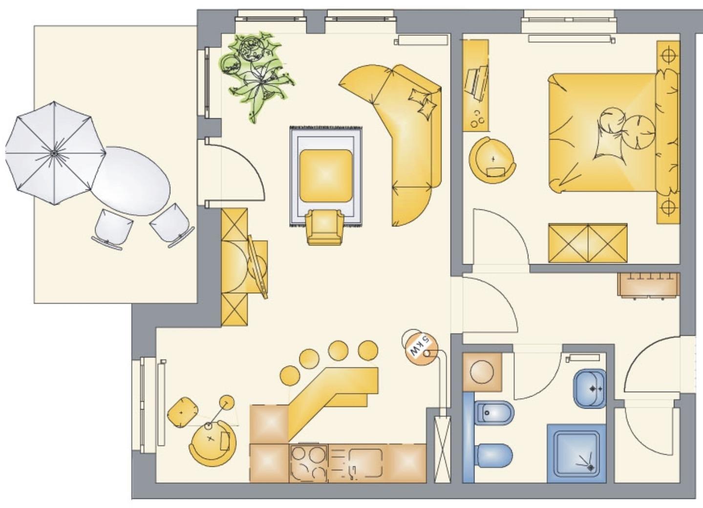 Der Wohnbereich ist mit einer Schlaf-Eckcouch und einem großem SAT-TV mit Radioempfang ausgestattet. Im Schlafzimmer befindet sich ein Doppelbett mit verstellbaren Lattenrost. Auf dem Sideboard steht ein weiterer SAT-TV (als Einschlafhilfe). Der Radiowecker kann auch als Smartphone-Ladestation genutzt werden. Ein kleiner Stahl-Safe ist im Schrank eingebaut.