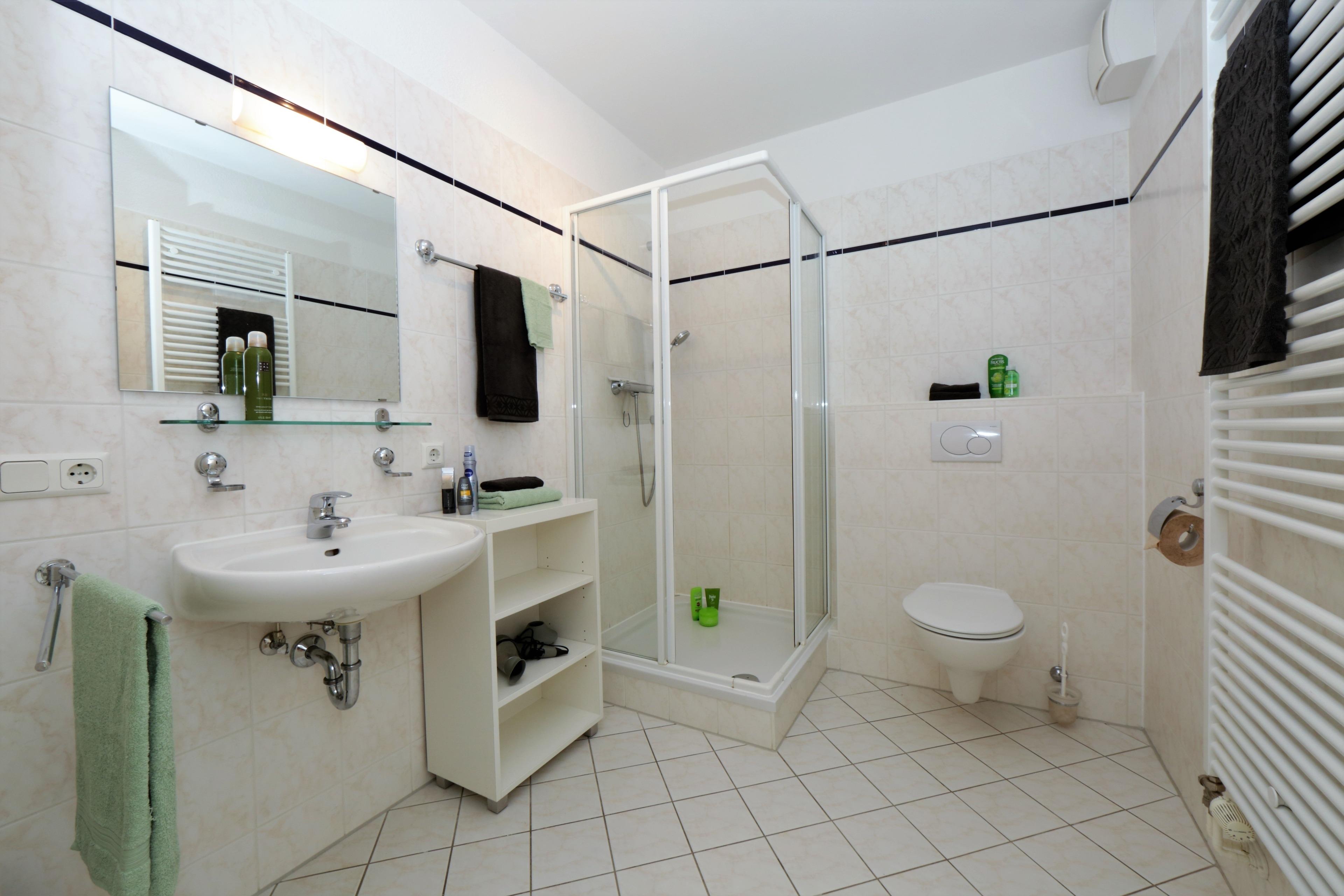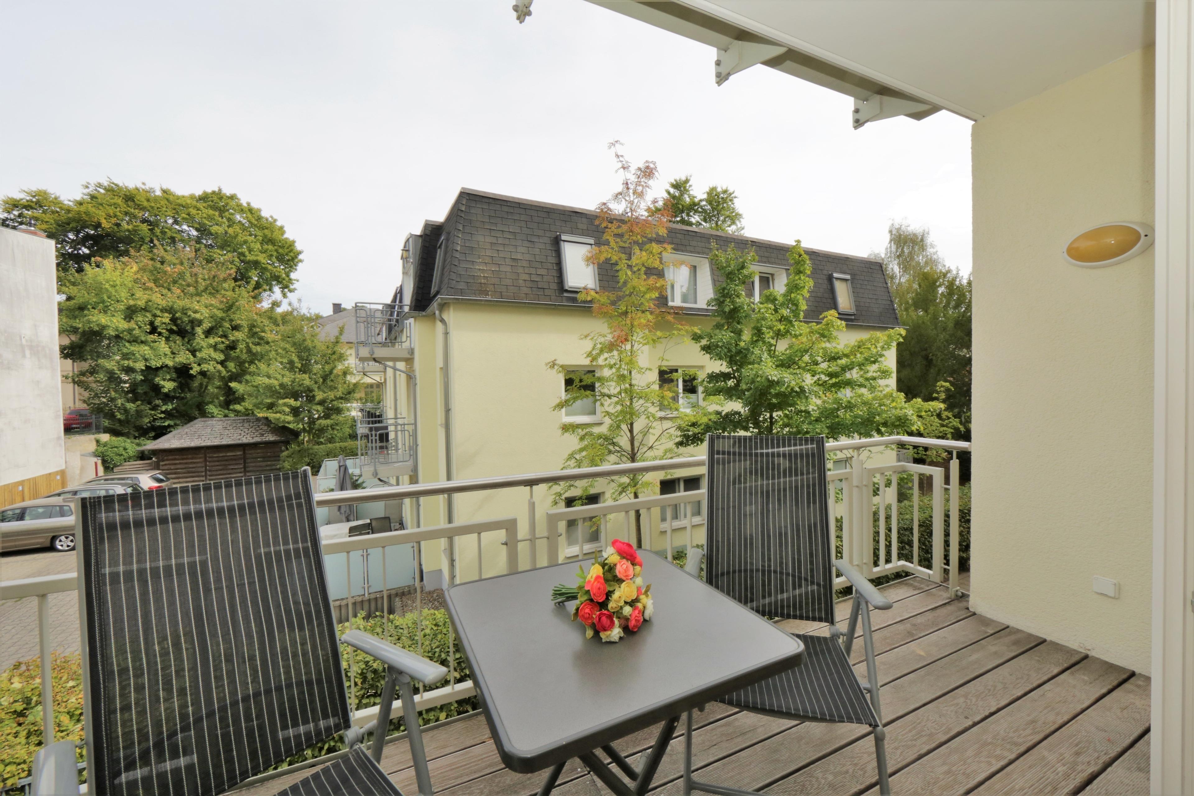 Dieses 54 qm große gemütliche 3-Zimmer-Appartement liegt im Erdgeschoss und verfügt über einen Balkon in nordöstlicher Ausrichtung. Der helle Wohnraum ist mit einem gemütlichen Sofa und Sessel und einem separaten Essplatz für 4 Personen eingerichtet. Ein Flat TV ist selbstverständlich. Die Küchenzeile inkl. Kühlschrank, Geschirrspüler, Cerankochfeld und Mikrowelle ist offen im hinteren Wohnbereich integriert. Das größere Schlafzimmer ist mit einem Doppelbett mit getrennten Matratzen (90 x 200) Kleiderschrank und Kommode eingerichtet, das kleinere mit zwei Einzelbetten (90 x 180) und kleinerem Schrankraum. Der möblierte Balkon liegt zur Hofseite und lädt besonders vormittags zum Verweilen ein. Im Bad steht den Gästen Dusche und Waschbecken/WC zur Verfügung. Ein Pkw- Stellplatz befindet sich auf dem Hof und ist der Wohnung zugeordnet. Den Fahrradabstellraum mit komfortablem Austritt finden Sie im Keller.