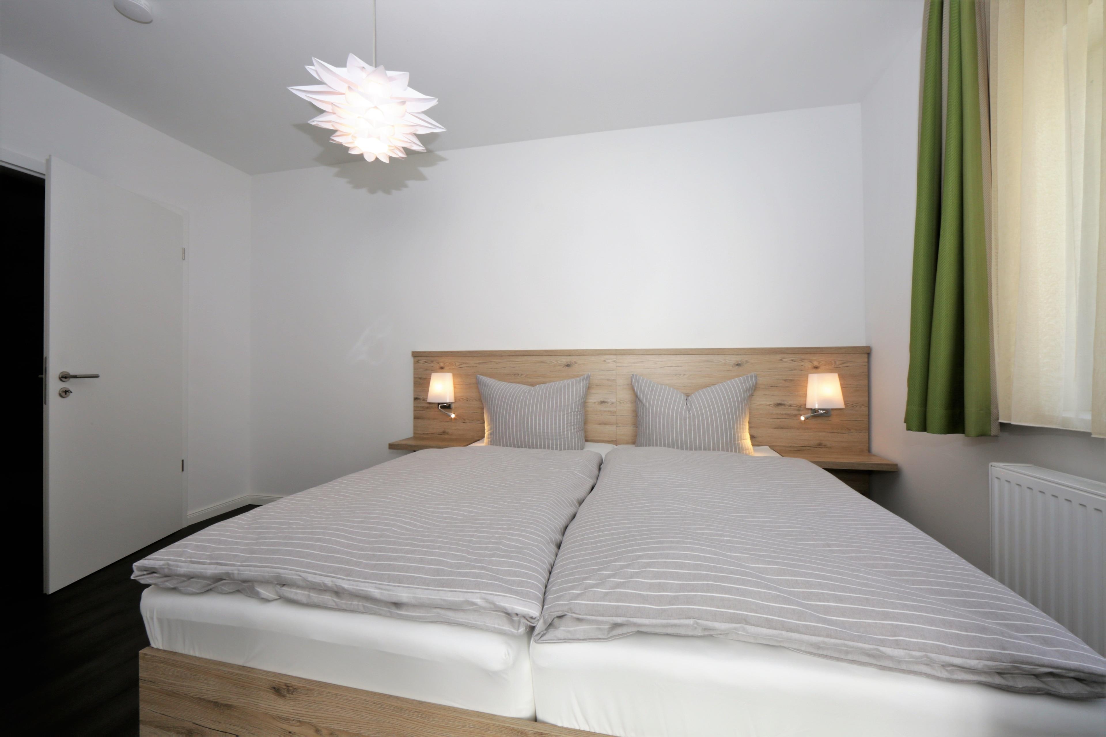 Dieses mit 90 qm großzügige 3-Zimmer Appartement befindet sich im 1. Obergeschoss und eignet sich für max. 5 Personen und ein Baby. Der großzügige Wohnraum erwartet seine Gäste mit einer modernen Sitzgarnitur zum Relaxen, Couchtisch und Flat- TV. Der Essplatz mit rustikalem Echtholztisch sowie die moderne Küchenzeile befinden sich ebenfalls im Wohnraum. Die Küche bietet Ihnen Cerankochfeld, Backofen, Mikrowelle, Geschirrspüler, Kühlschrank etc. Der große überdachte südöstlich ausgerichtete Balkon mit Blick ins Grüne lockt Sie bereits zum Frühstück ins Freie und ist vom Wohnraum aus begehbar. Beide Schlafzimmer sind mit einem Doppelbett mit getrennten Matratzen (80 bzw. 90 x 200) und einem Kleiderschrank eingerichtet. Für die 5. Person bietet ein zusätzliches Schrankbett in einem der Schlafzimmer den Schlafplatz. Ein zweiter nach Süden und ins Grüne ausgerichteter ebenfalls überdachter Balkon ist mit Sonnenliegen möbliert und lädt zum Relaxen und Lesen an. Das moderne Badezimmer mit Fenster ist mit einer Dusche und Waschtisch/WC ausgestattet. Außerdem steht den Gästen eine Waschmaschine im Bad zur Verfügung. Ein Kinderreisebett und ein Hochstuhl befinden sich im Appartement und stehen zur Nutzung bereit. Dem Appartement ist ein Pkw-Stellplatz in der Tiefgarage zugeordnet.