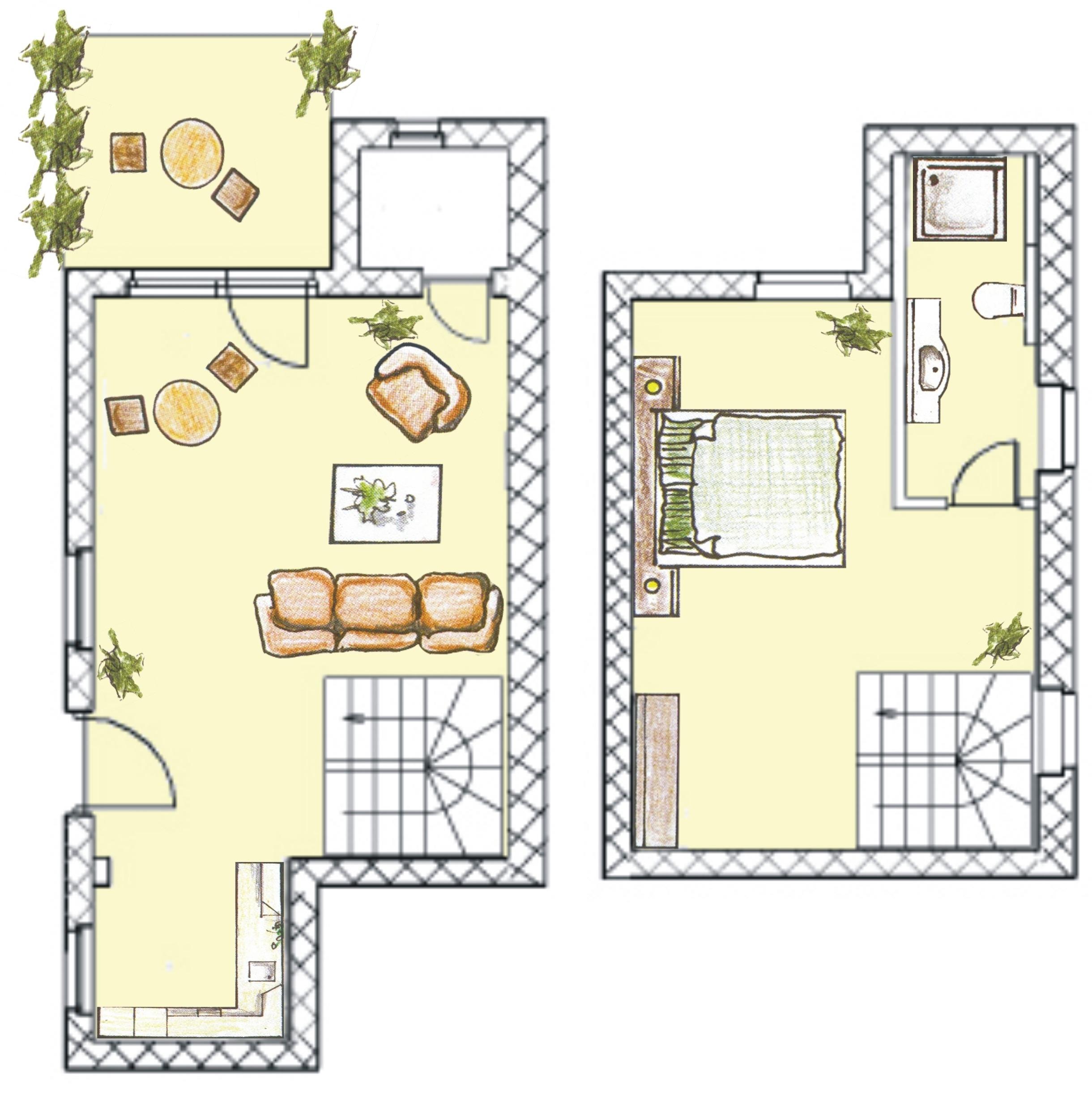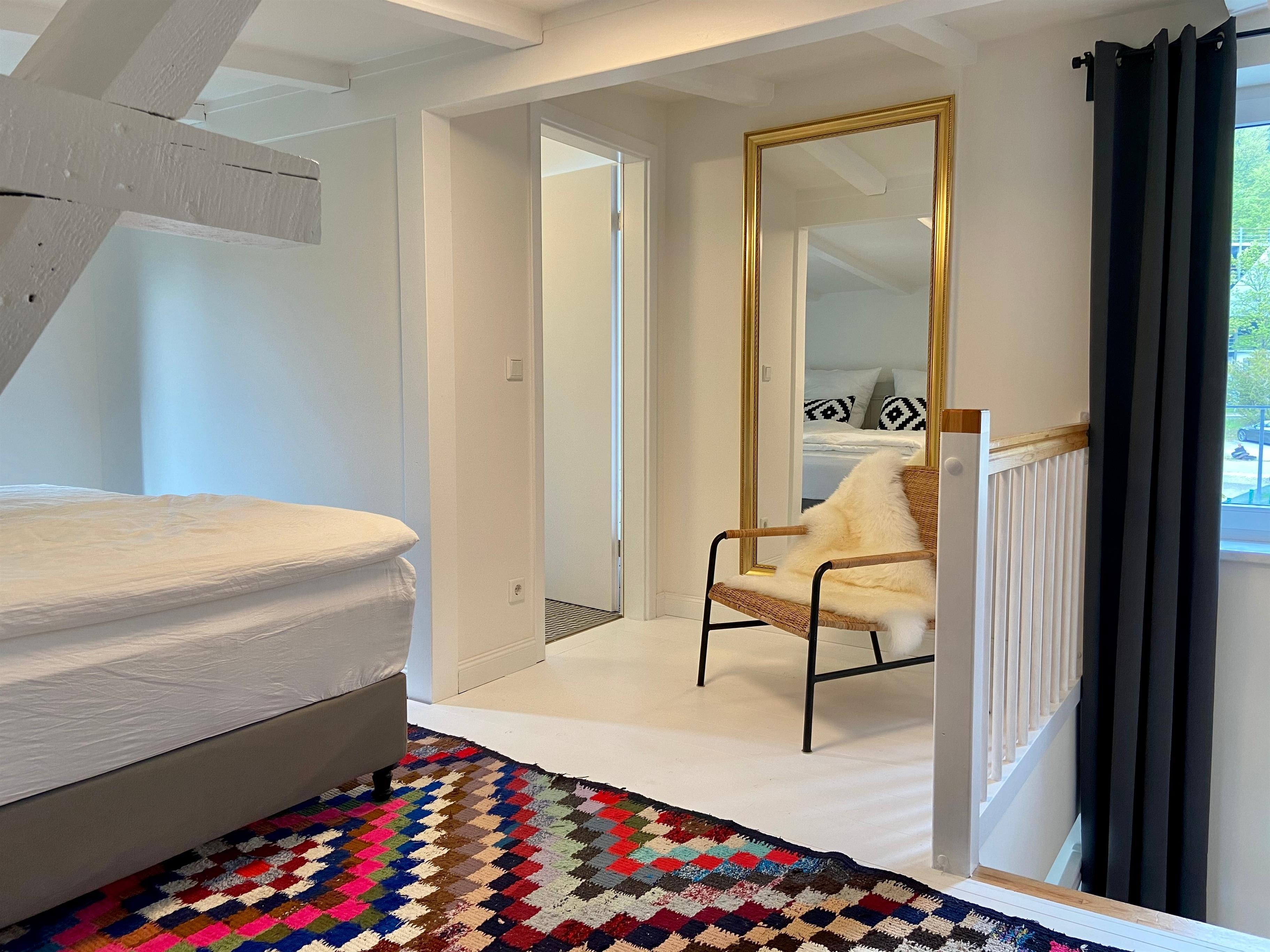 Eine elegante Treppe führt Sie in das Obergeschoss der Maisonette-Wohnung, wo sich das charmante Schlafzimmer und das moderne Badezimmer befinden. Das galerieartige Schlafzimmer, das offen zum Wohnbereich gestaltet ist, versprüht einen einzigartigen Charme und sorgt für ein luftiges Raumgefühl. Hier finden Sie ein hochwertiges Boxspringbett, das mit getrennten Matratzen und einem durchgehenden Topper ausgestattet ist, um Ihnen einen erholsamen Schlaf zu garantieren. Eine stilvolle Kommode bietet ausreichend Stauraum für Ihre persönlichen Dinge, und ein gemütlicher Korbstuhl lädt zum Lesen oder Entspannen ein.