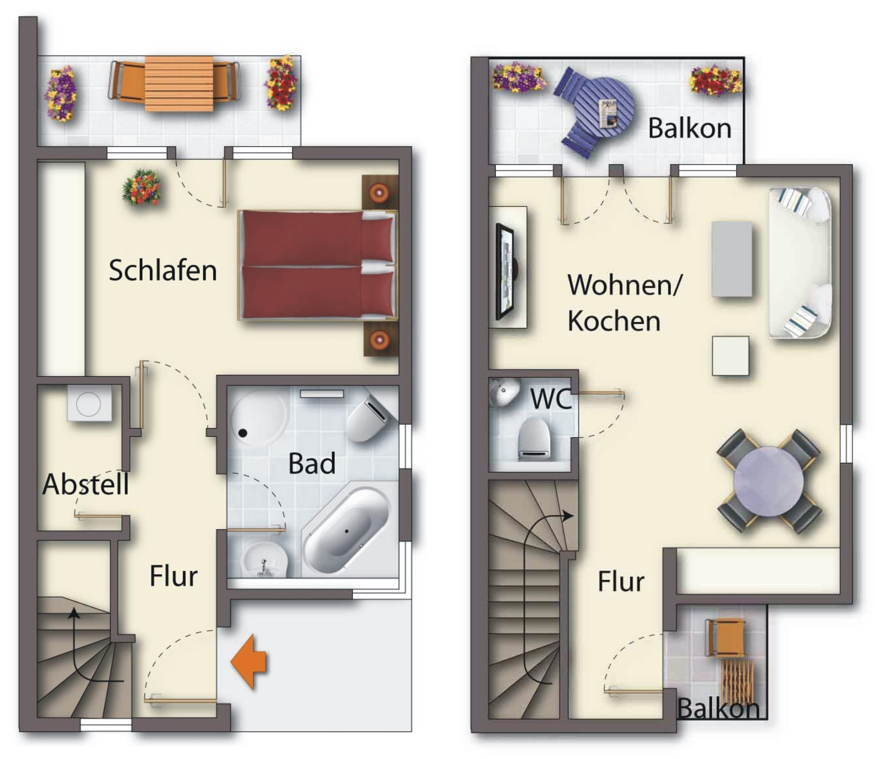 Dieses moderne 2-Zimmer-Appartement mit einer Größe von 65 m² erstreckt sich über zwei Ebenen und bietet 2-3 Personen viel Platz im Urlaub. Im Erdgeschoss befinden sich das Schlafzimmer, ausgestattet mit einem Doppelbett mit getrennten Matratzen (90 x 200) und Kleiderschrank sowie das Tageslichtbad, das Ihnen Badewanne, Dusche mit Echtglasabtrennung und Waschtisch/WC bietet. Über eine Treppe gelangt man in den hellen, großzügigen Wohnbereich mit Sitzecke und TV. Von dem westlich ausgerichteten Balkon genießen Sie den Blick auf die Ostsee. Eine moderne Küche mit Geschirrspüler, Cerankochfeld, Backofen, Kühlschrank etc. und der Esstisch sind ebenfalls offen im Wohnraum integriert. Ein zweiter Balkon, der aus der Küche begehbar ist und nach Osten zeigt, lockt die Gäste bereits zum Frühstück ins Freie. Im Obergeschoss steht ein Gäste-WC zur Verfügung. Ein Pkw-Stellplatz befindet sich auf dem Grundstück und ist der Wohnung zugeordnet. Waschmaschine und Trockner finden Sie im Keller. Im Winterhalbjahr steht den Gästen an verschiedenen Tagen im Nachbargebäude eine Sauna zur kostenfreien Nutzung bereit.