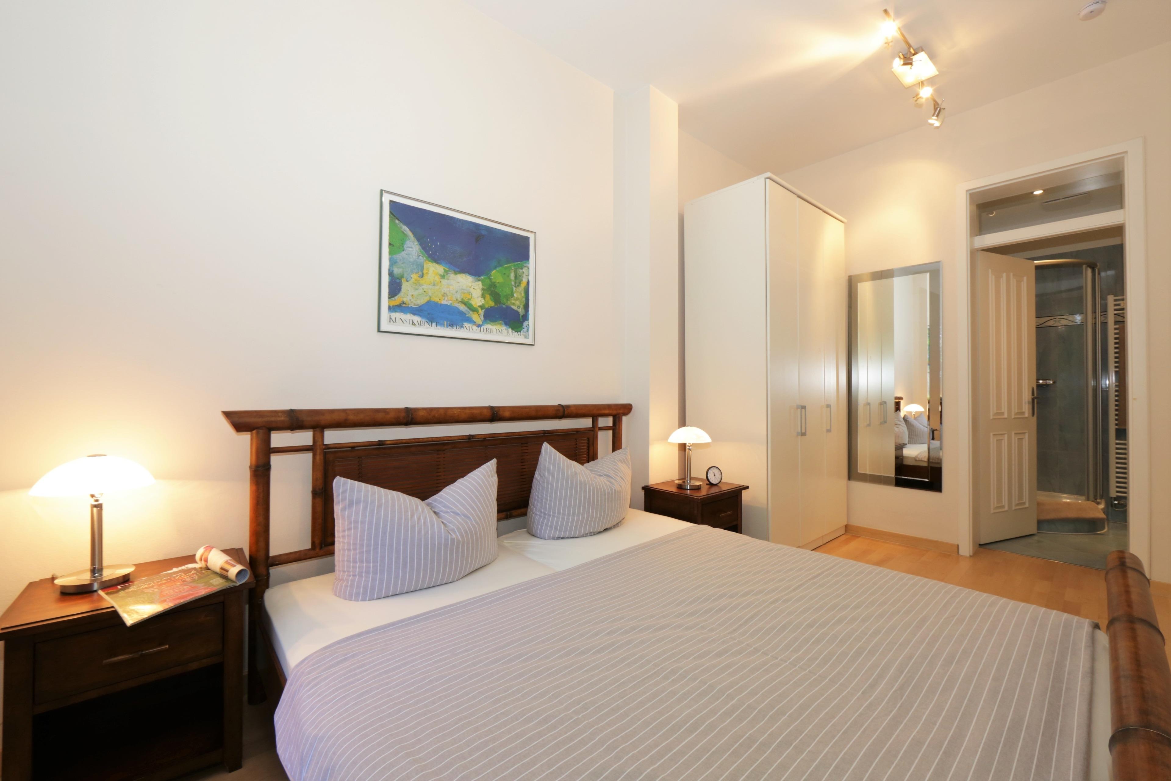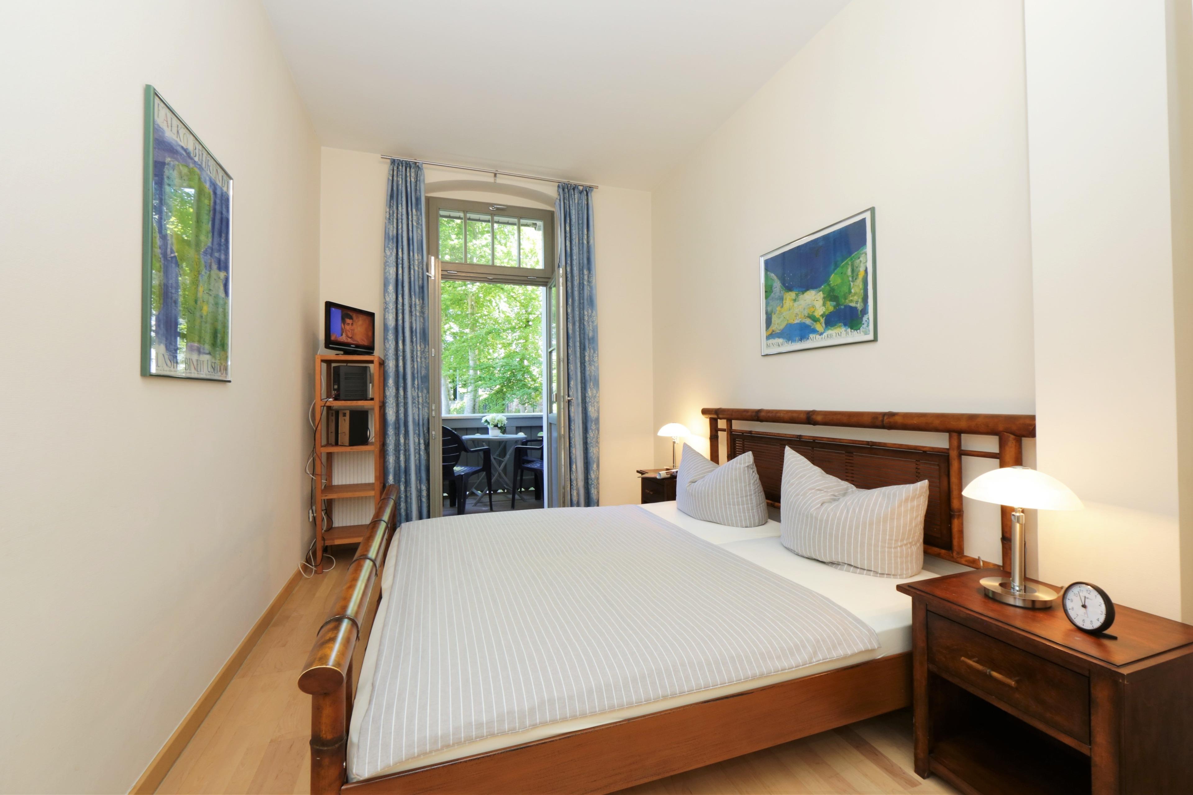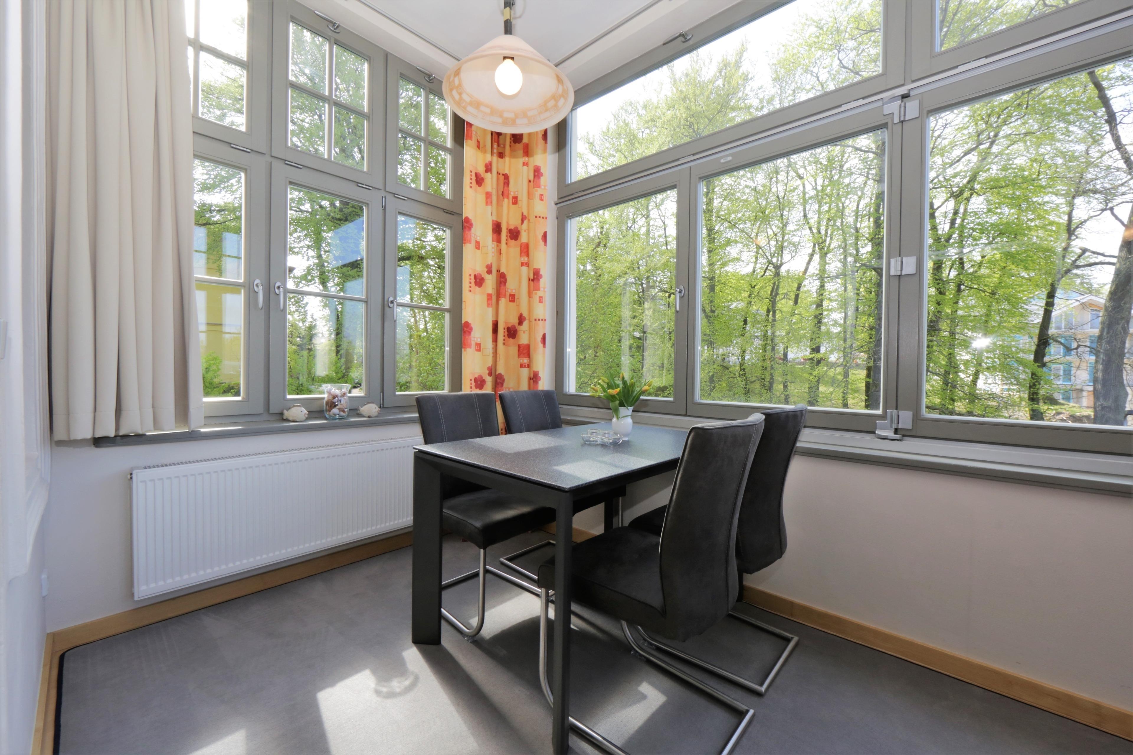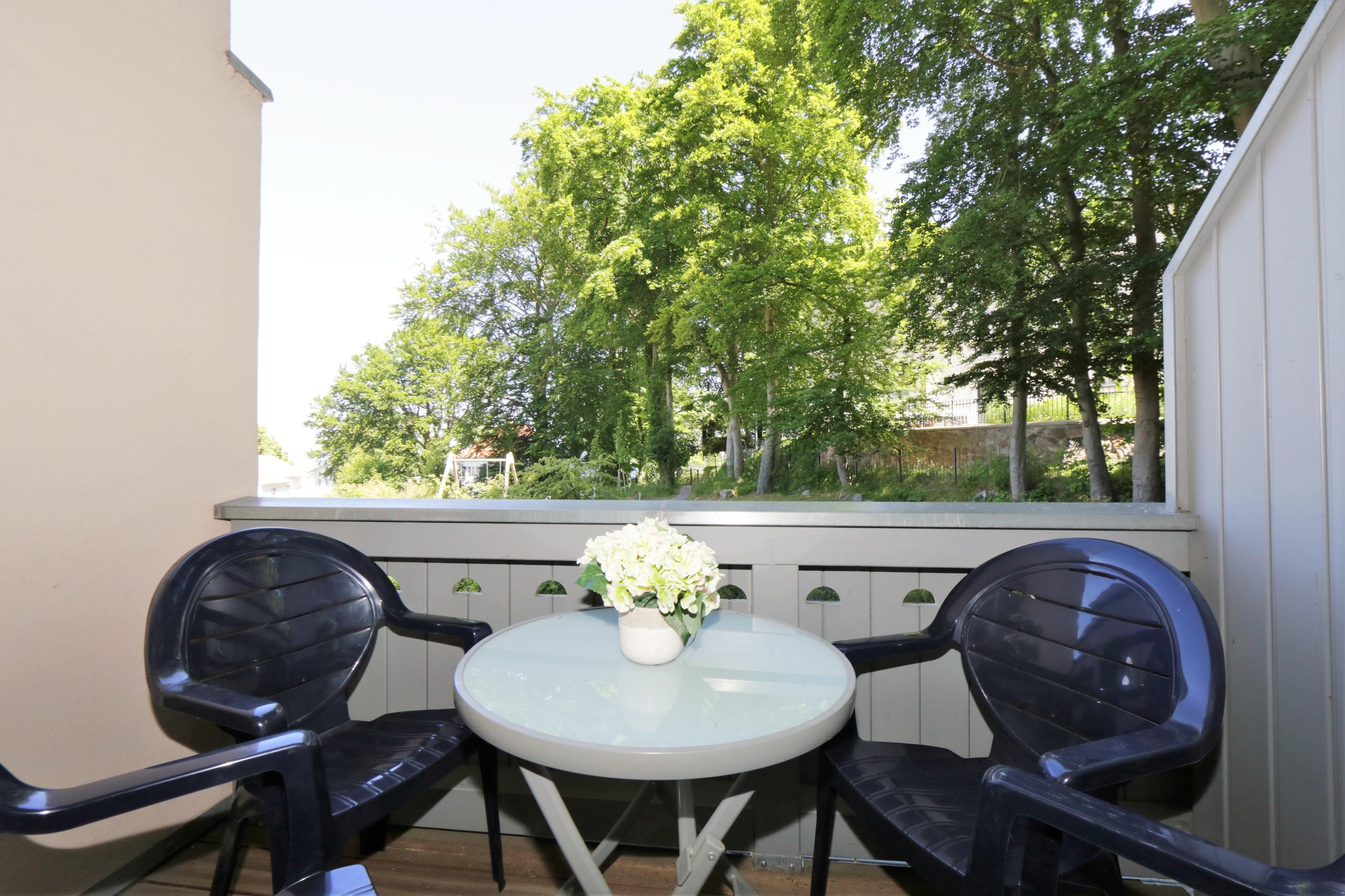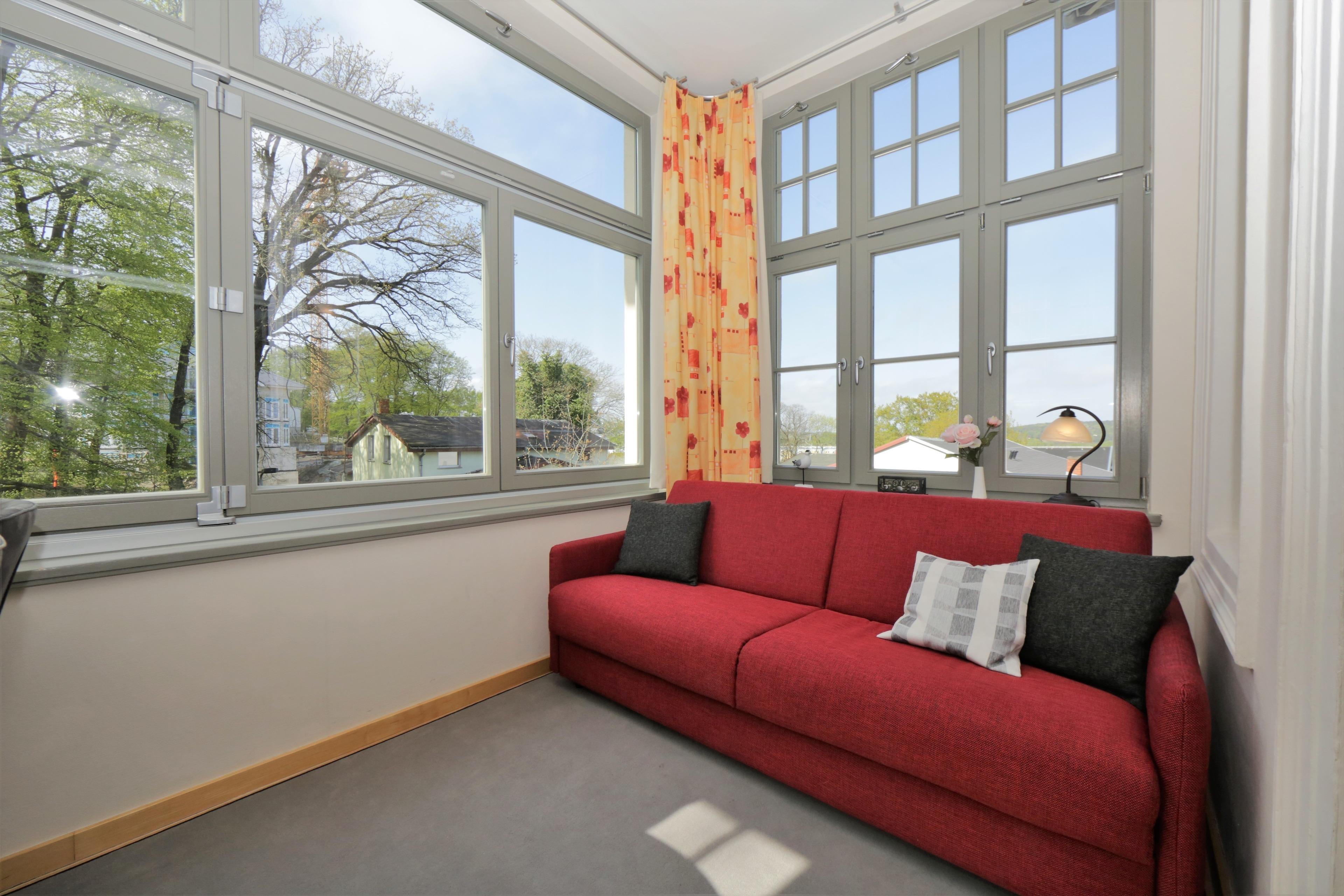 Dieses 53 qm große 2-Zimmer Appartement befindet sich im 1. Obergeschoss der Villa. Der Wohnraum bietet Ihnen ein gemütliches Ecksofa bzw. ein kleines Sofa mit TV. Die Vollküche mit Geschirrspüler, Cerankochfeld, Mikrowelle, Backofen und einem großen Kühlschrank mit Gefrierfach ist offen im Wohnraum integriert. Die Mahlzeiten können Sie am Esstisch in der sonnendurchfluteten Loggia mit Südausrichtung einnehmen. Das Highlight der Loggia ist der dreiteilige Fensterflügel, der sich fast vollständig öffnen lässt. Das Schlafzimmer ist mit einem Doppelbett mit getrennten Matratzen, ausreichend Schrankraum und einem zusätzlichen TV eingerichtet. Das Bad en suite sorgt für Privatsphäre und ist mit Dusche und Waschtisch/WC ausgestattet. Von dem möblierten Balkon zur Seeseite, der vom Schlafraum begehbar ist, können Sie einen Blick auf die Ostsee erhaschen. Zwei weitere Schlafgelegenheiten stellt in der Loggia eine Schlafcouch (Liegefläche 180 x 200). Auch diese Gäste haben ein eigenes Bad, welches mit Badewanne und Waschtisch/WC ausgestattet ist. Der Pkw- Stellplatz befindet sich auf dem Grundstück und ist der Wohnung zugeordnet. Waschmaschine und Trockner finden Sie im Keller. In diesem Appartement sind Haustiere erlaubt.