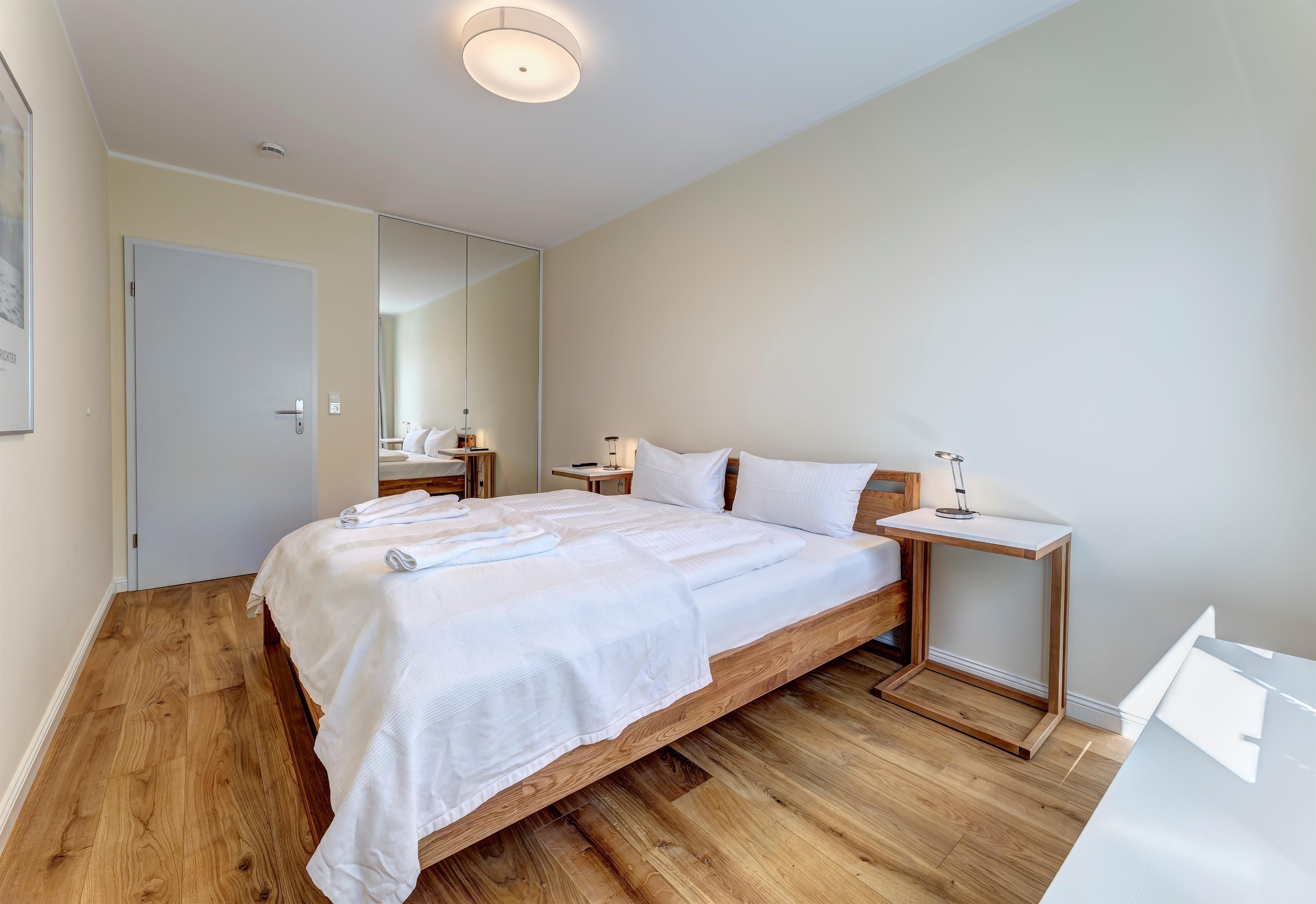 Das Schlafzimmer des Appartements überzeugt mit einem großzügigen Doppelbett, dessen Matratzen mit einer Größe von 90 x 200 cm separiert sind, um optimalen Schlafkomfort zu gewährleisten. Ein weiterer Flat-TV im Schlafzimmer ermöglicht es Ihnen, gemütlich vom Bett aus zu entspannen und Ihre Lieblingssendungen zu genießen. Darüber hinaus ist ausreichend Stauraum in Form eines geräumigen Kleiderschranks vorhanden, sodass Sie Ihre Kleidung und persönlichen Gegenstände bequem unterbringen können.