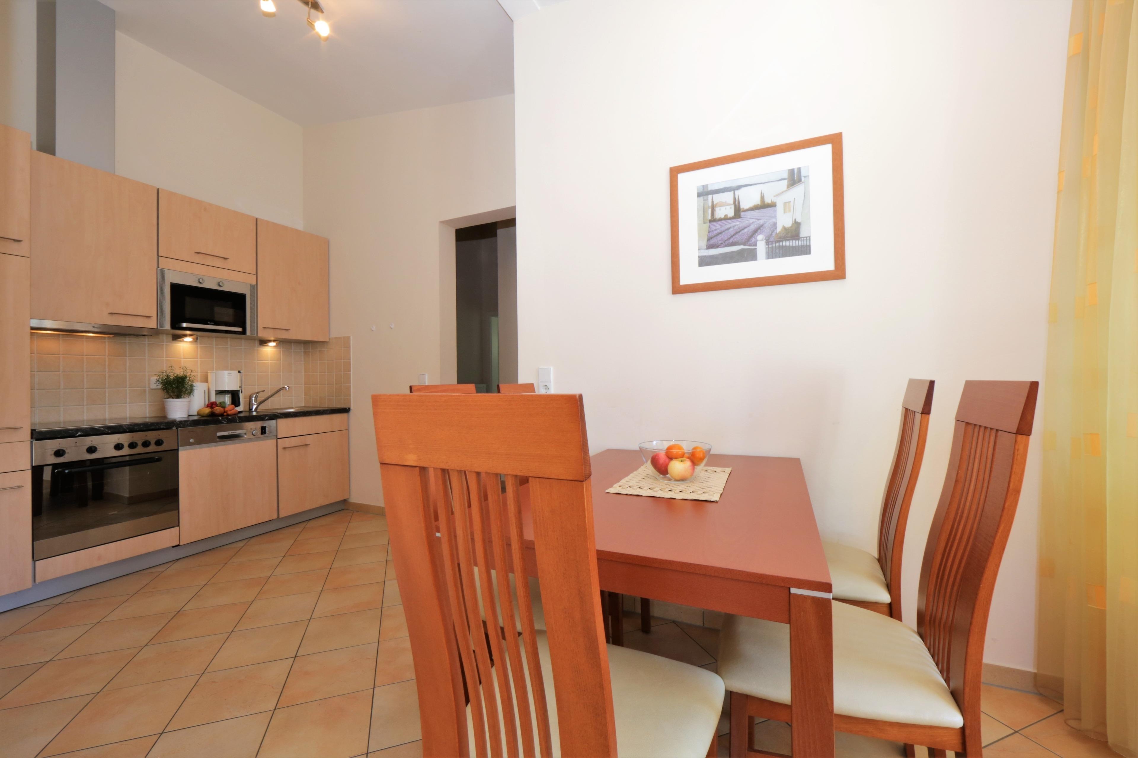 Diese mit italienischen Stilmöbeln eingerichtete 3-Zimmer Wohnung ist 67m² groß und befindet sich im 1. Obergeschoss des an die Villa angrenzenden Neubaus. Die Wohnung ist komfortabel ausgestattet und bietet 4-5 Personen Platz für einen erholsamen Inselurlaub. Der großzügige helle Wohnraum bietet Ihnen eine gemütliche Sitzecke mit Sofa, Sessel, TV und Essplatz. Die Küchenzeile incl. Backofen, Ceranfeld, Kühlschrank, Geschirrspüler, Mikrowelle etc. ist offen im hinteren Bereich des Wohnraums integriert. Vom Wohnzimmer betreten Sie auch den westlich ausgerichteten Balkon, auf dem Sie den Tag mit einem Glas Wein ausklingen lassen können. Von hier aus können Sie auch einen teilweisen Blick auf das Meer erhaschen. Beide Schlafzimmer sind mit einem Doppelbett mit getrennten Matratzen (90 x 200) und einem Kleiderschrank eingerichtet. Den großen, überdachten, südlich ausgerichteten Balkon, der zu gemeinsamen Mahlzeiten einlädt, können Sie vom Wohnraum und vom größeren Schlafzimmer betreten. Das moderne Bad ist sowohl mit einer Dusche mit Echtglasabtrennung als auch mit einer Badewanne, Doppelwaschbecken und WC ausgestattet. Außerdem steht ein Gäste-WC zur Verfügung. Der Pkw- Stellplatz befindet sich auf dem Grundstück und ist der Wohnung zugeordnet.