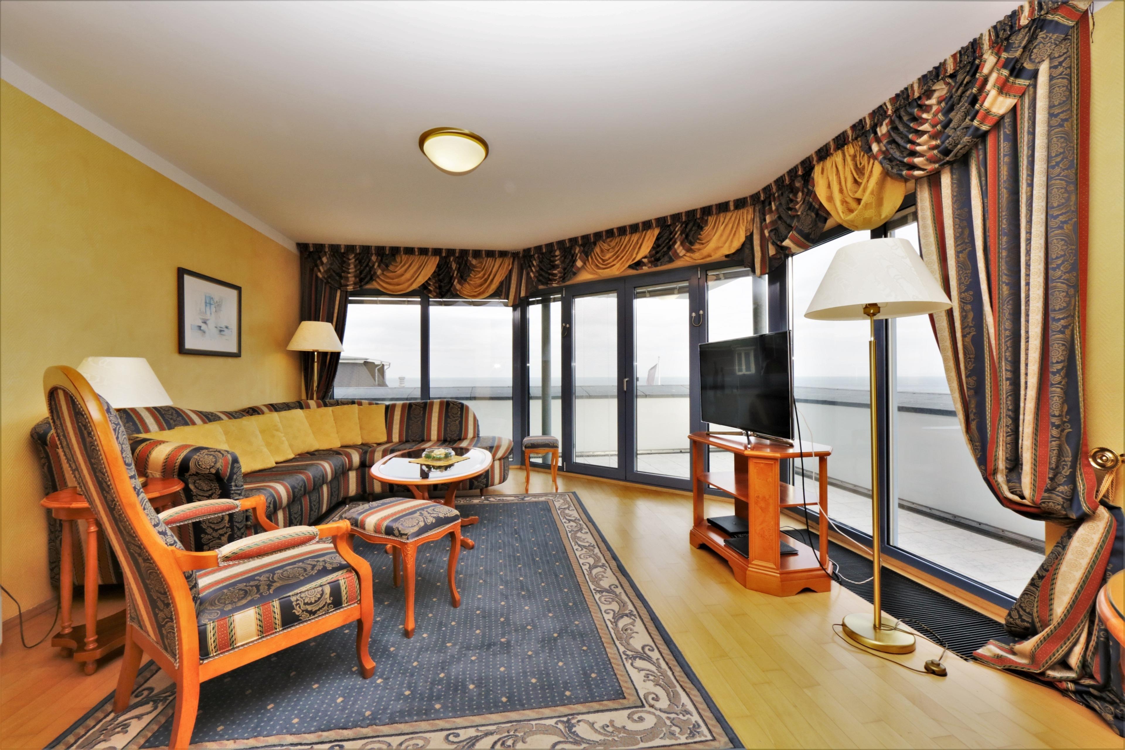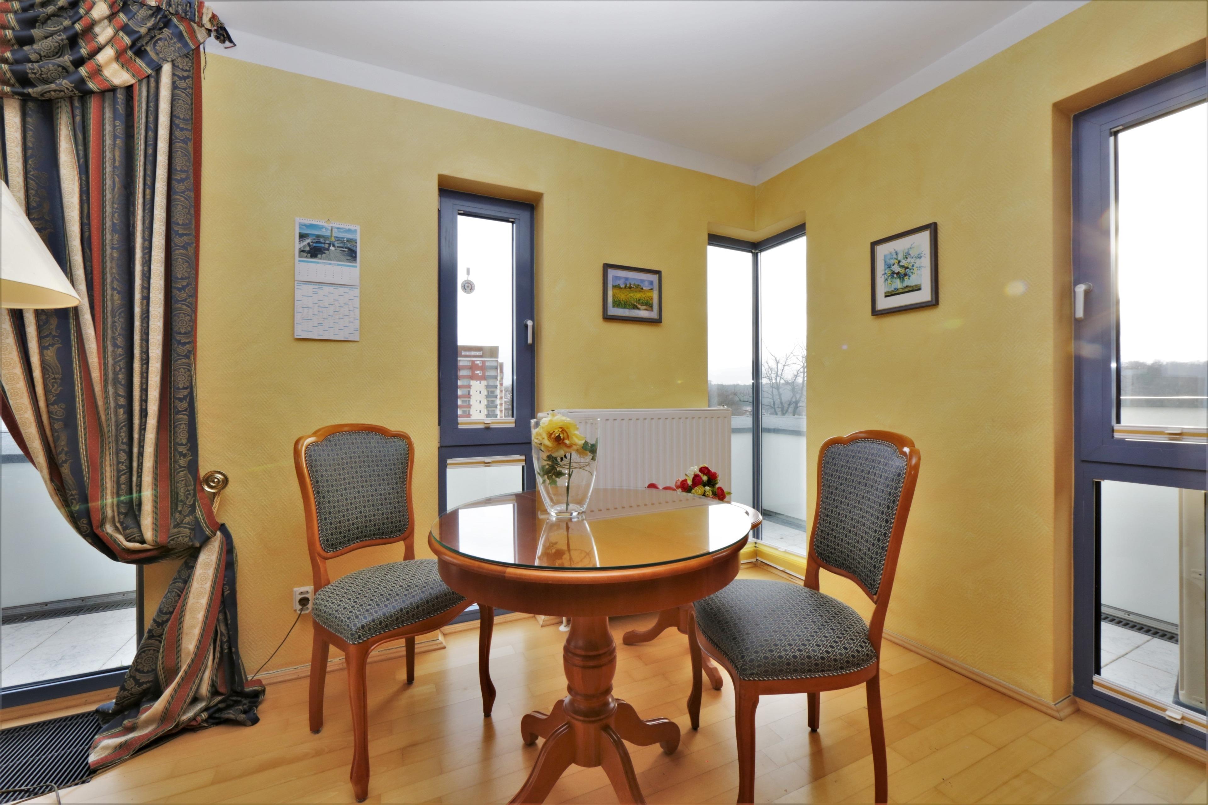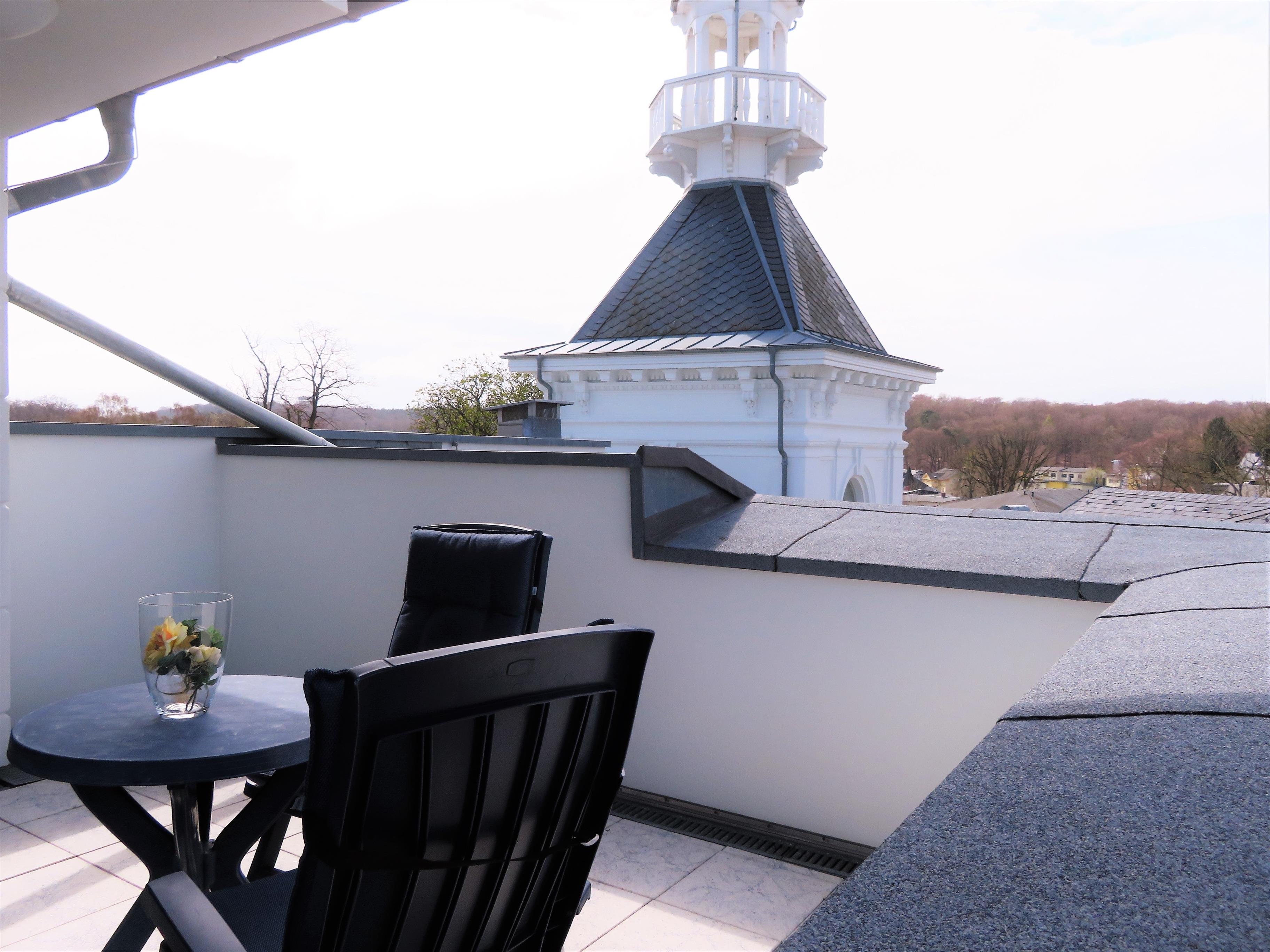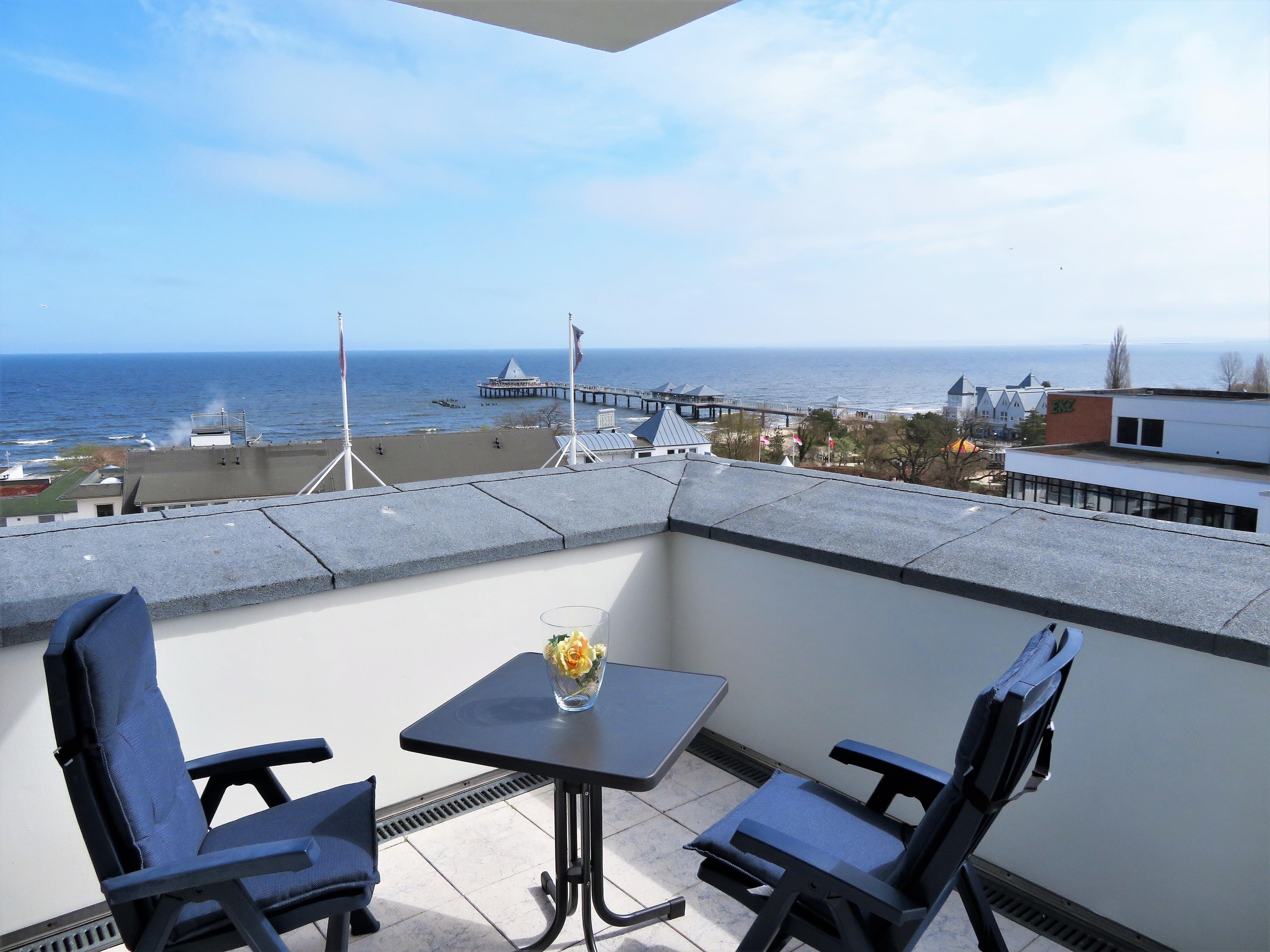 Die mit 60 qm großzügige 2-Zimmer Wohnung im Penthouse besticht in jeder Hinsicht durch die tolle Lage und den traumhaften Seeblick. Die der ursprünglichen Architektur entsprechende Ausstattung der Appartements ist elegant und anspruchsvoll und lässt den Alltag schnell verfliegen. Hochwertige italienische Möbel, gepaart mit modernem Komfort, prägen das Wohn- und Wohlgefühl. Der lichtdurchflutete Wohnbereich ist mit einer gemütlichen Sitzecke und Flat-TV stilvoll eingerichtet. Eine winzige Pantryküche mit Geschirrspüler, doppeltem Cerankochfeld und separatem Kühlschrank sowie ein Essplatz sind ebenfalls offen im Wohnbereich integriert. Zusätzlich gibt es ein Sofa auf der gegenüberliegenden Südseite, das zum Lesen und Relaxen einlädt und einen Schreibtisch. Im geräumigen Schlafzimmer befinden sich ein Doppelbett mit getrennten Matratzen (90 x 200) ein Kleiderschrank und eine Kommode. Das hochwertig ausgestattete Tageslichtbad bietet Ihnen sowohl eine Badewanne als auch eine Dusche, Waschtisch/WC und Fön. Die Dachterrasse ist rundläufig und bietet zu jeder Tageszeit Sonnenlicht. Genießen Sie hier einen weiten Blick über die Ostsee und die Heringsdorfer Seebrücke bis hinüber nach Swinemünde. Hier spüren Sie das Leben in der Mitte Heringsdorfs und die Atmosphäre des mondänen Seeschlosses. Für Ihren Komfort befindet sich ein Aufzug im Haus. Die letzten Stufen hinauf in das Dachgeschoss müssen allerdings zu Fuß gelaufen werden. Für mitgebrachte oder Leihfahrräder steht ein Fahrradkeller zur Nutzung zur Verfügung. Der Pkw- Stellplatz befindet sich direkt am Haus.