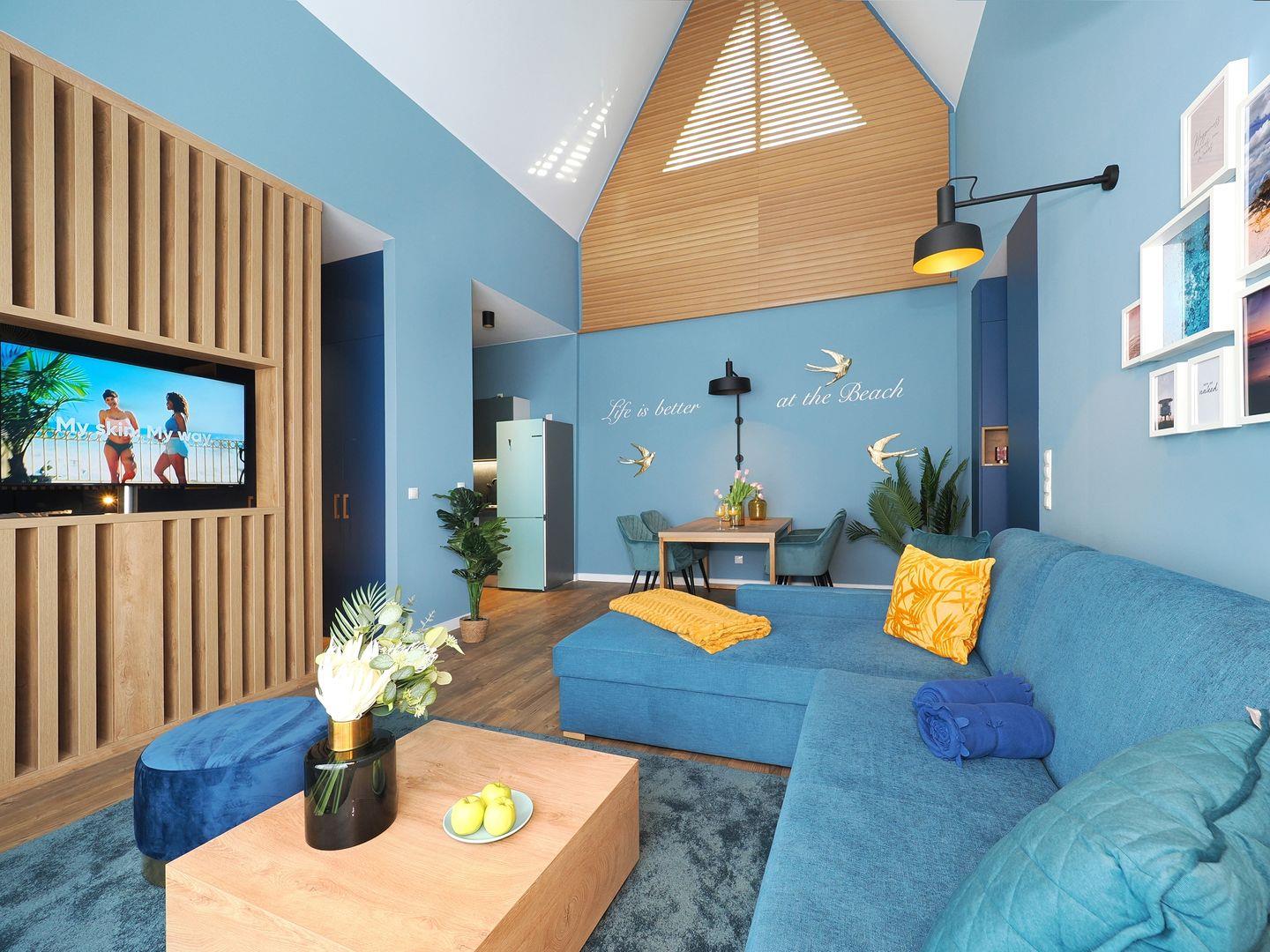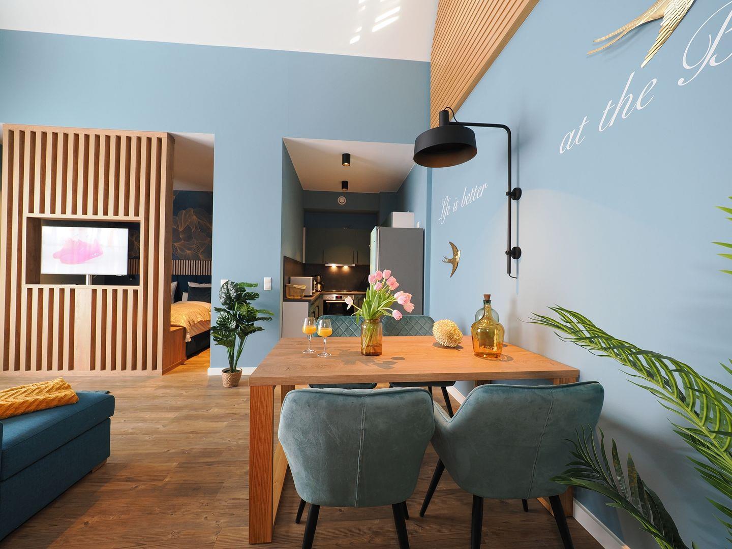 1-Raum Ferienwohnung mit Balkon, Bad mit Dusche, Küche mit Cerankochfeld, Backofen, Kühl-Gefrierkombination, Geschirrspüler und Mikrowelle, Smart-TV, Eckschlafsofa und Boxspringdoppelbett, Nichtraucher, Haustiere gestattet