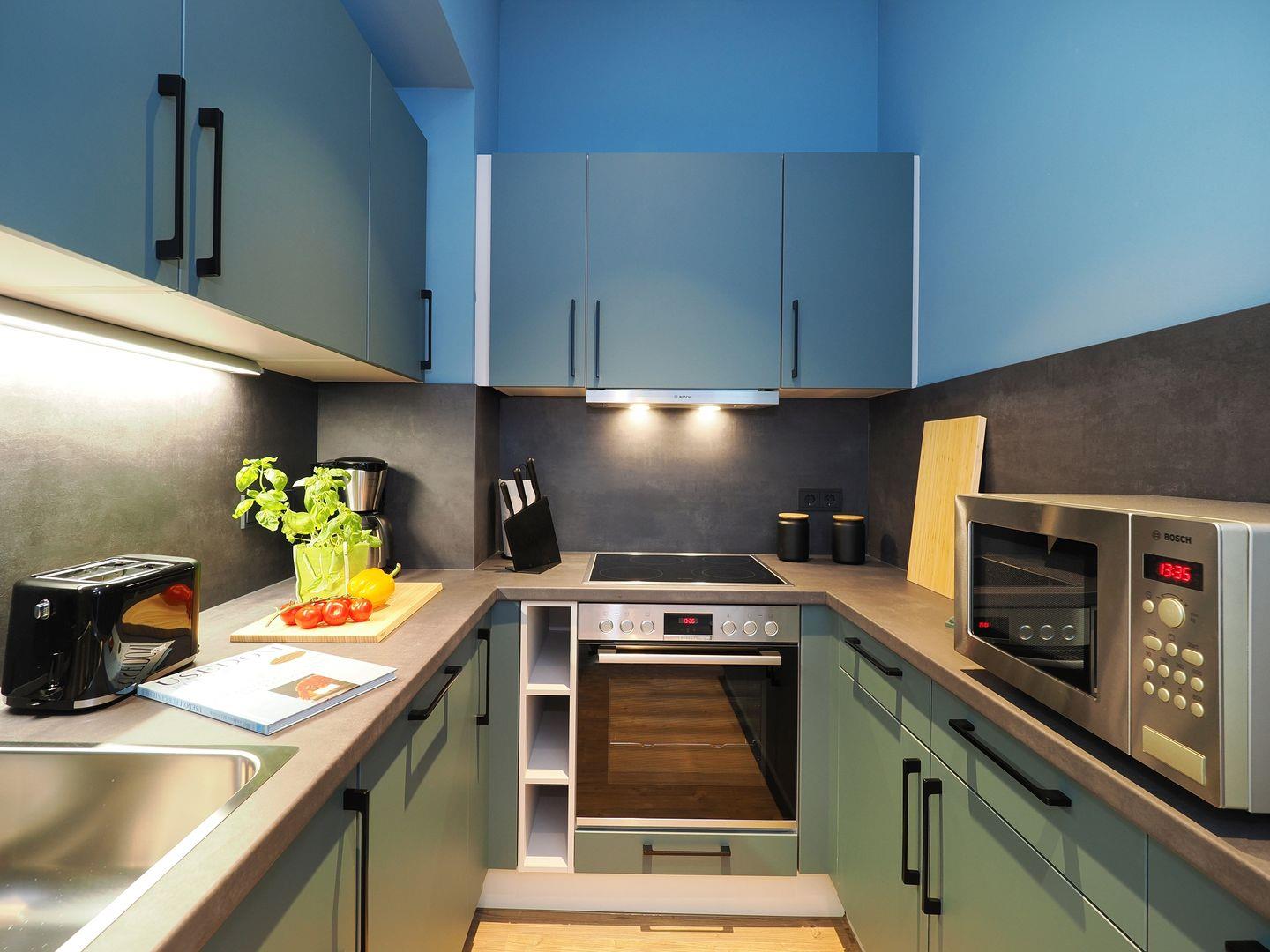 1-Raum Ferienwohnung mit Balkon, Bad mit Dusche, Küche mit Cerankochfeld, Backofen, Kühl-Gefrierkombination, Geschirrspüler und Mikrowelle, Smart-TV, Eckschlafsofa und Boxspringdoppelbett, Nichtraucher, Haustiere gestattet