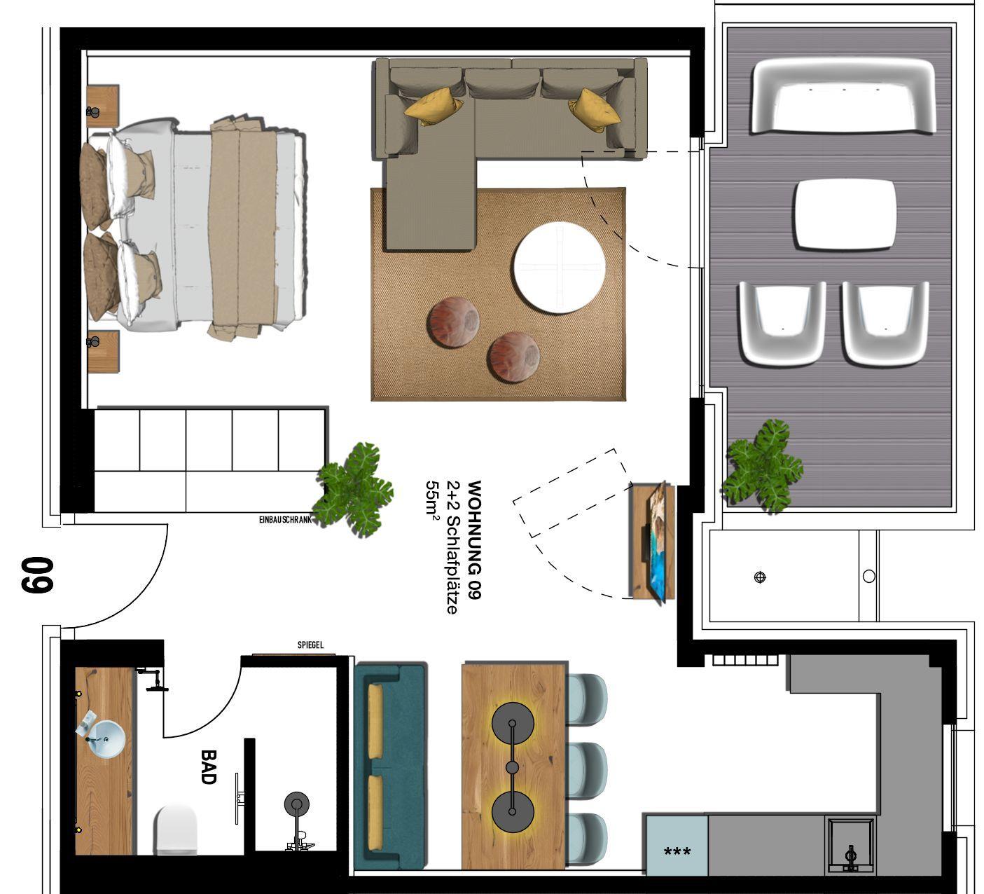 1-Raum Ferienwohnung mit Balkon, Bad mit Dusche, Küche mit Cerankochfeld, Backofen, Kühl-Gefrierkombination, Geschirrspüler und Mikrowelle, Smart-TV, Eckschlafsofa und Boxspringdoppelbett, Nichtraucher, Haustiere gestattet