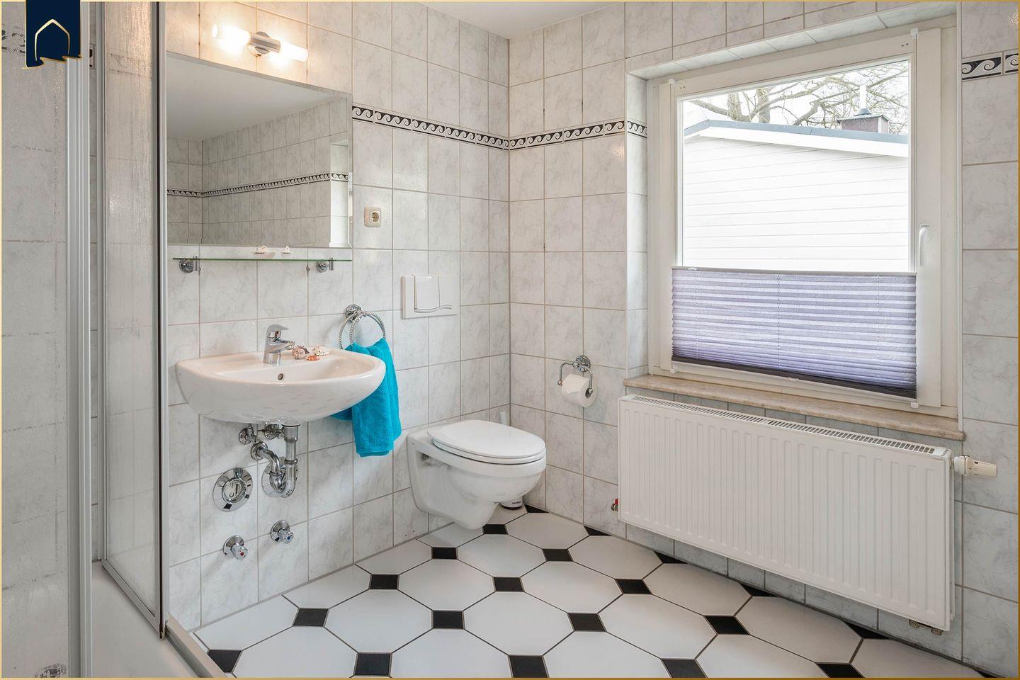 Das Tageslichtbad ist mit Dusche, Badewanne und Waschbecken ausgestattet – hier beginnt jeder Urlaubstag erfrischend. Der Essbereich mit großem Esstisch bietet ausreichend Platz für gemeinsame Mahlzeiten. Ein Ganzkörperspiegel, eine Garderobe, Kommoden und Sichtschutz an allen Fenstern sorgen für Wohnkomfort auf hohem Niveau. WLAN, ein Schreibtisch sowie ein Radio runden das Ausstattungspaket ab.
