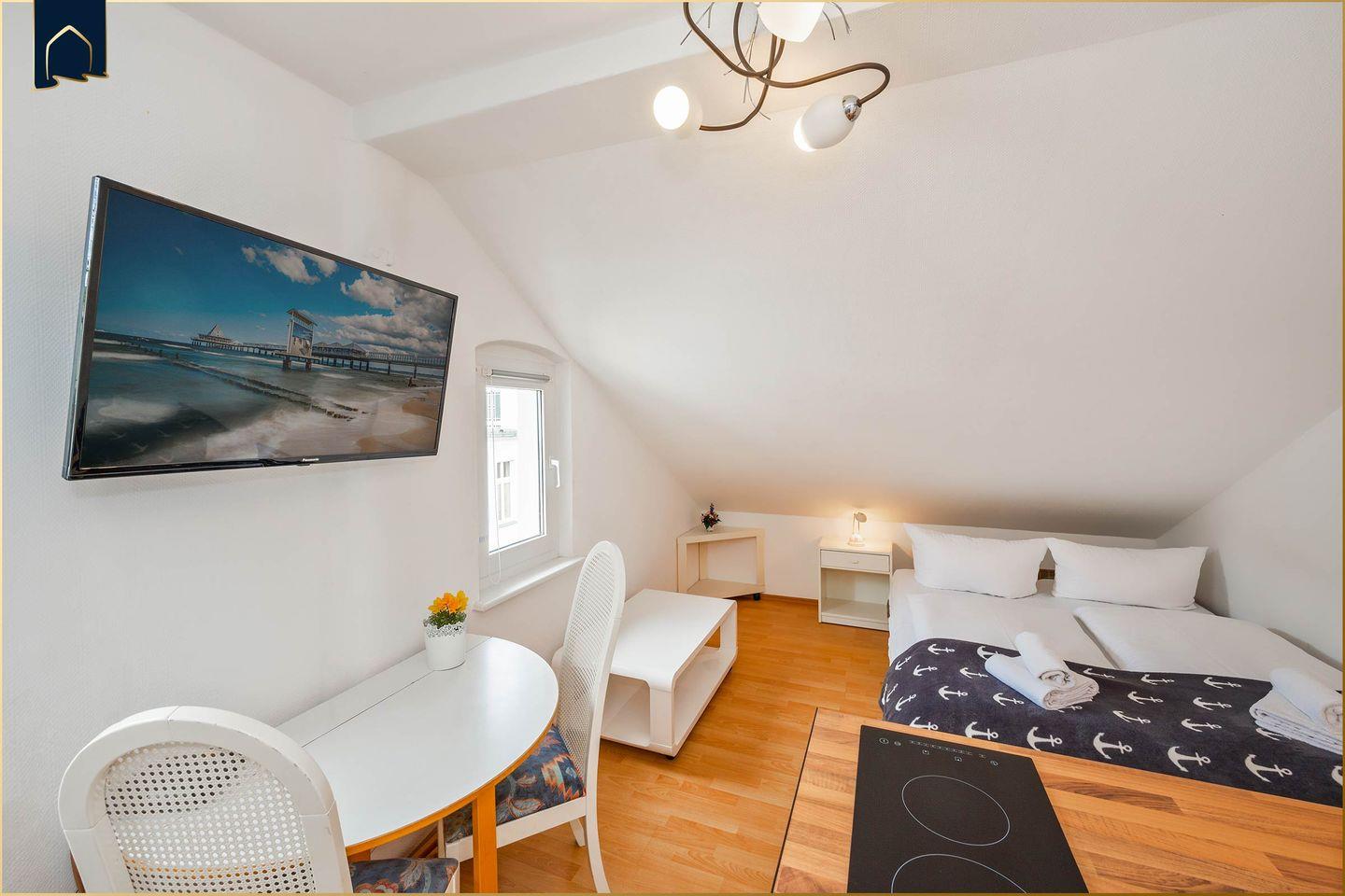 Das 19?m² große Apartment bietet durch seine clevere Raumaufteilung alles, was man für einen erholsamen Aufenthalt braucht. Der Wohnbereich ist mit einem komfortablen Sofa, Esstisch, Spiegel, Ganzkörperspiegel sowie einem TV ausgestattet. Ein WLAN-Anschluss sorgt für Unterhaltung und Konnektivität. Die offene Küche verfügt über moderne Geräte wie Herd, Kühlschrank, Mikrowelle, Wasserkocher, Kaffeemaschine, Toaster sowie eine Spülmaschine. Auch Geschirr, Besteck und Küchenutensilien sind vollständig vorhanden – inklusive Geschirrhandtüchern und einer Auswahl an Gewürzen.