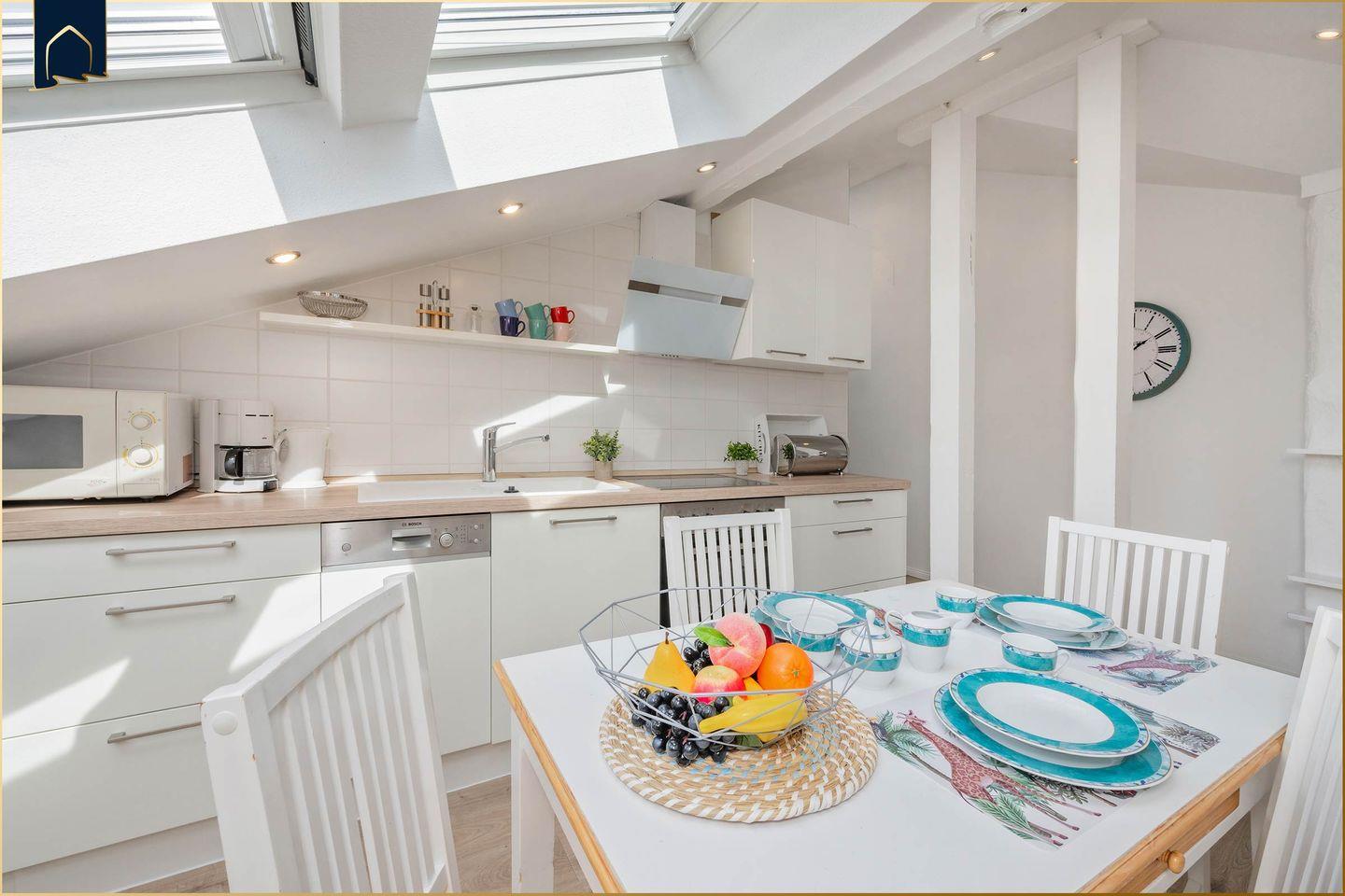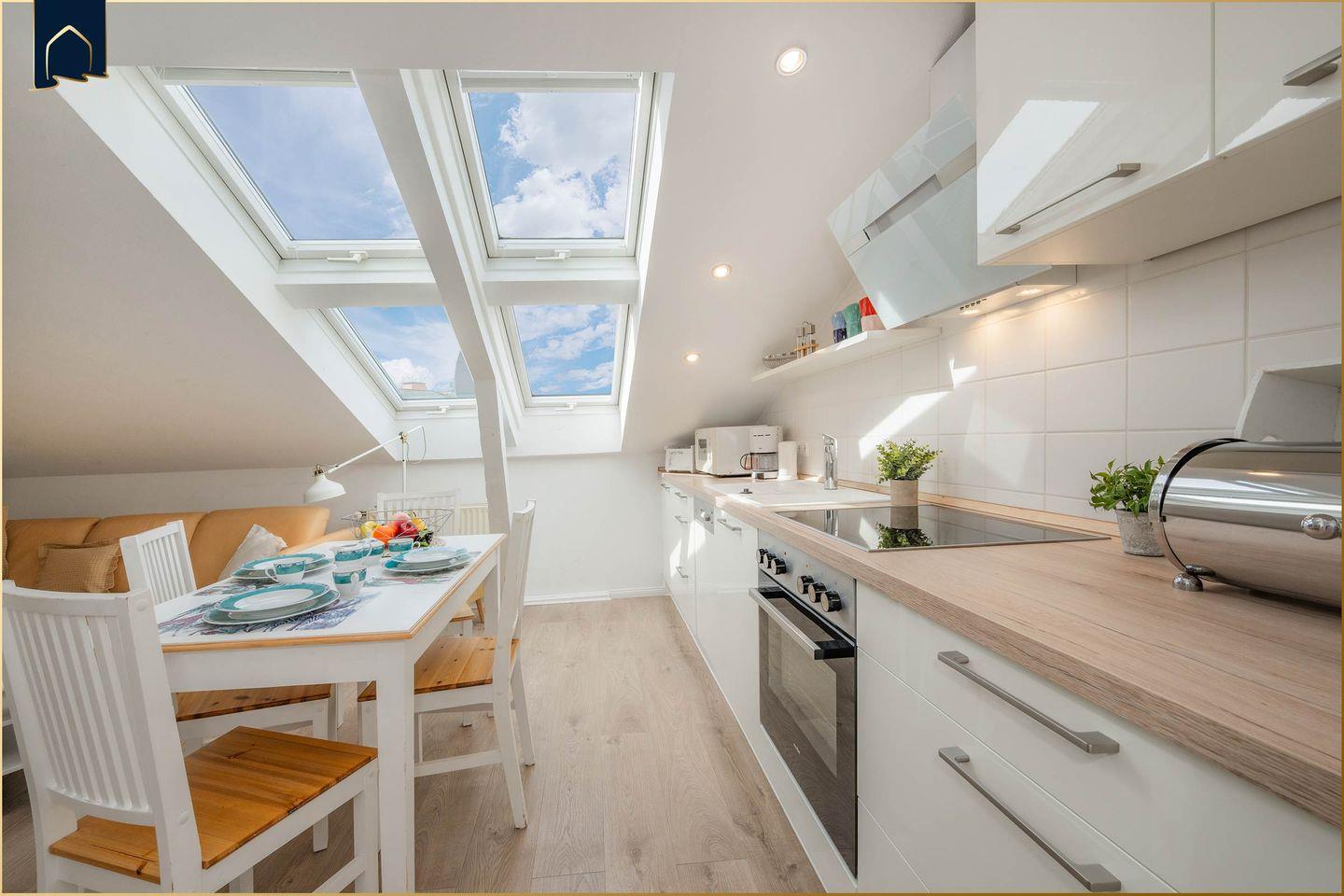 Die Küche ist vollständig eingerichtet und lässt keine Wünsche offen: Backofen, Herd, Kühlschrank mit Gefrierfach, Spülmaschine, Mikrowelle, Toaster, Wasserkocher und Kaffeemaschine stehen bereit, ebenso wie Geschirr und Kochutensilien. Direkt angrenzend befindet sich ein Essbereich mit Esstisch und ausreichend Sitzgelegenheiten für gemeinsame Mahlzeiten. Ein Privatparkplatz rundet das Angebot ab. Durch die Nähe zum Meer und die familienfreundliche Ausstattung ist diese Wohnung ein idealer Ausgangspunkt für entspannte Urlaubstage auf Usedom.