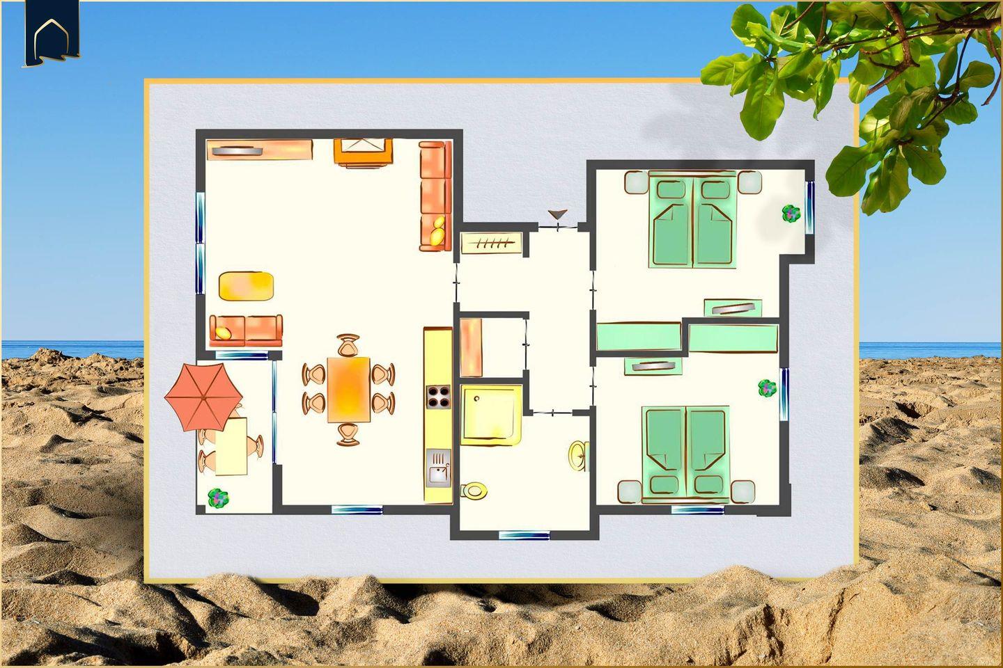 Die Wohnung verfügt über zwei gemütliche Schlafzimmer, ein modernes Bad mit Dusche sowie einen großzügigen Wohnbereich mit Esstisch und Sofaecke. Die offene Küche ist komplett ausgestattet mit Herd, Backofen, Mikrowelle, Geschirrspüler, Kaffeemaschine und Gefrierfach – ideal für Selbstversorger. WLAN, drei Fernseher und ein Kamin sorgen für Unterhaltung und Behaglichkeit an kühleren Tagen. Ein Fahrradabstellraum, Waschmaschine, Trockner und Wäscheständer stehen ebenfalls zur Verfügung.