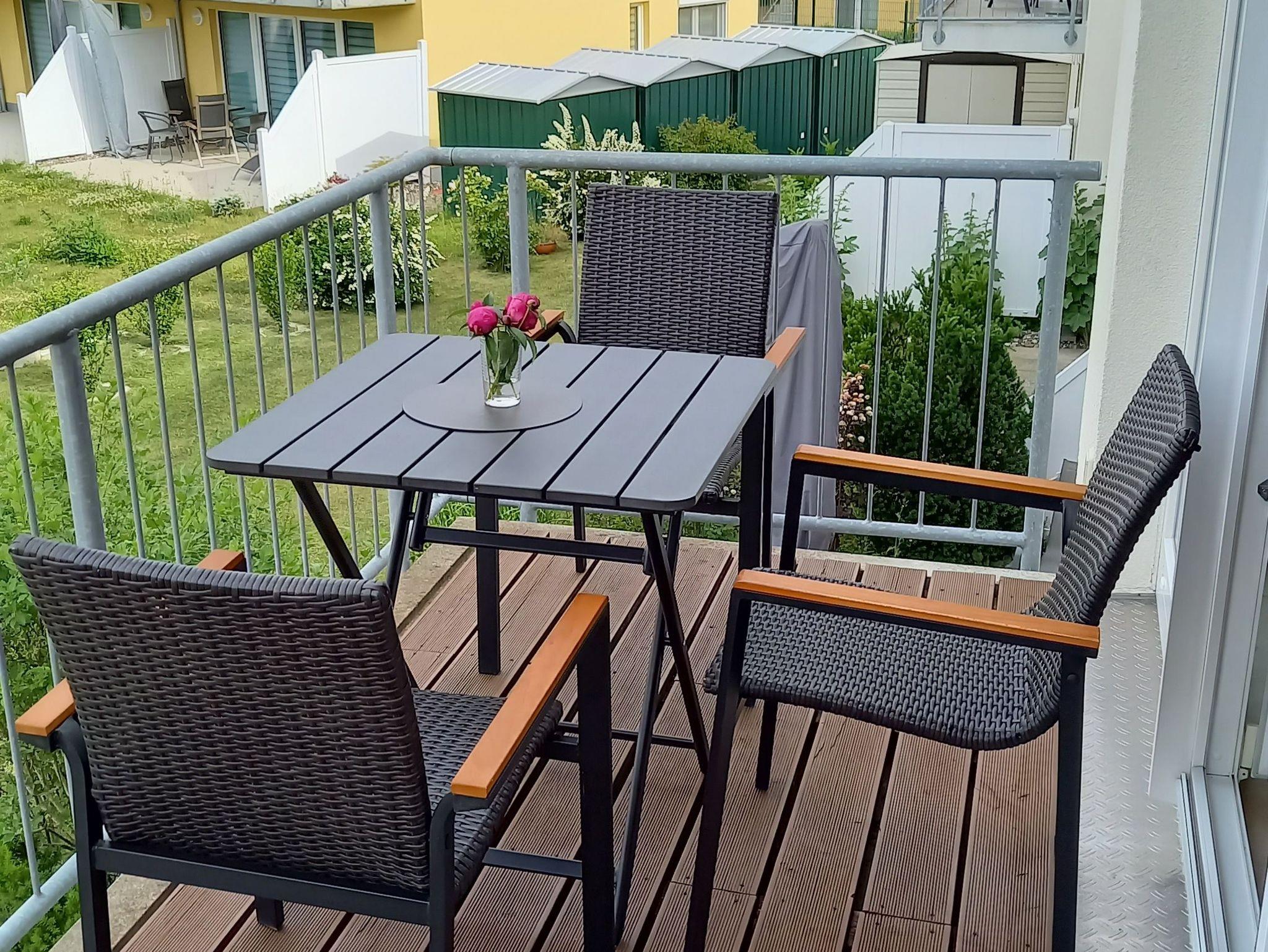 Der Balkon, ca. 6qm, wurde mit Holzdielen belegt. Ein Staubsauger ist in der Wohnung vorhanden. Draußen, neben der Wohnung befindet sich ein abschließbarer Abstellraum für Fahrräder etc.