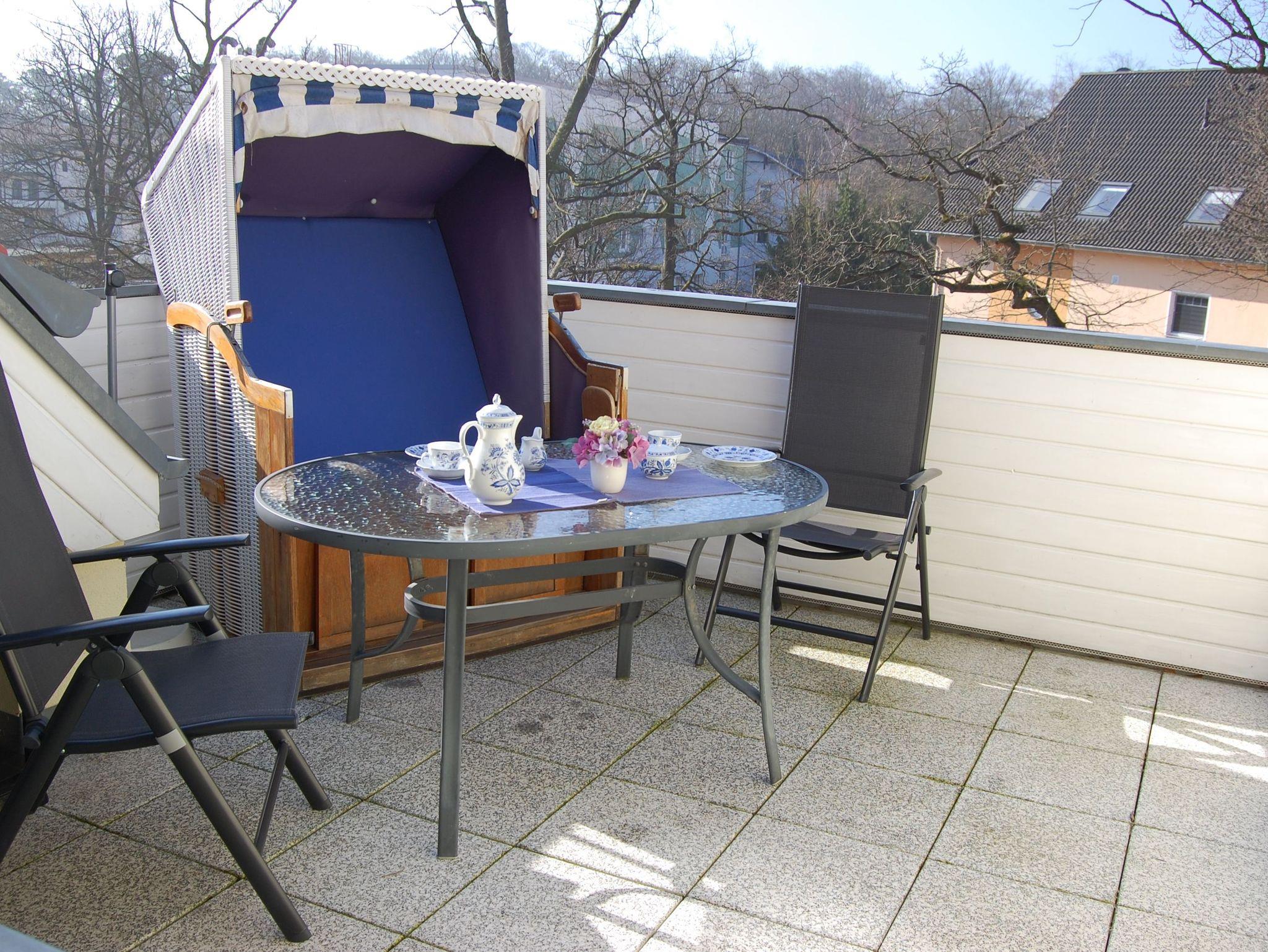 • Dachterrasse: Südausrichtung mit Tisch, 4 Stühle, Sonnenschirm, Strandkorb