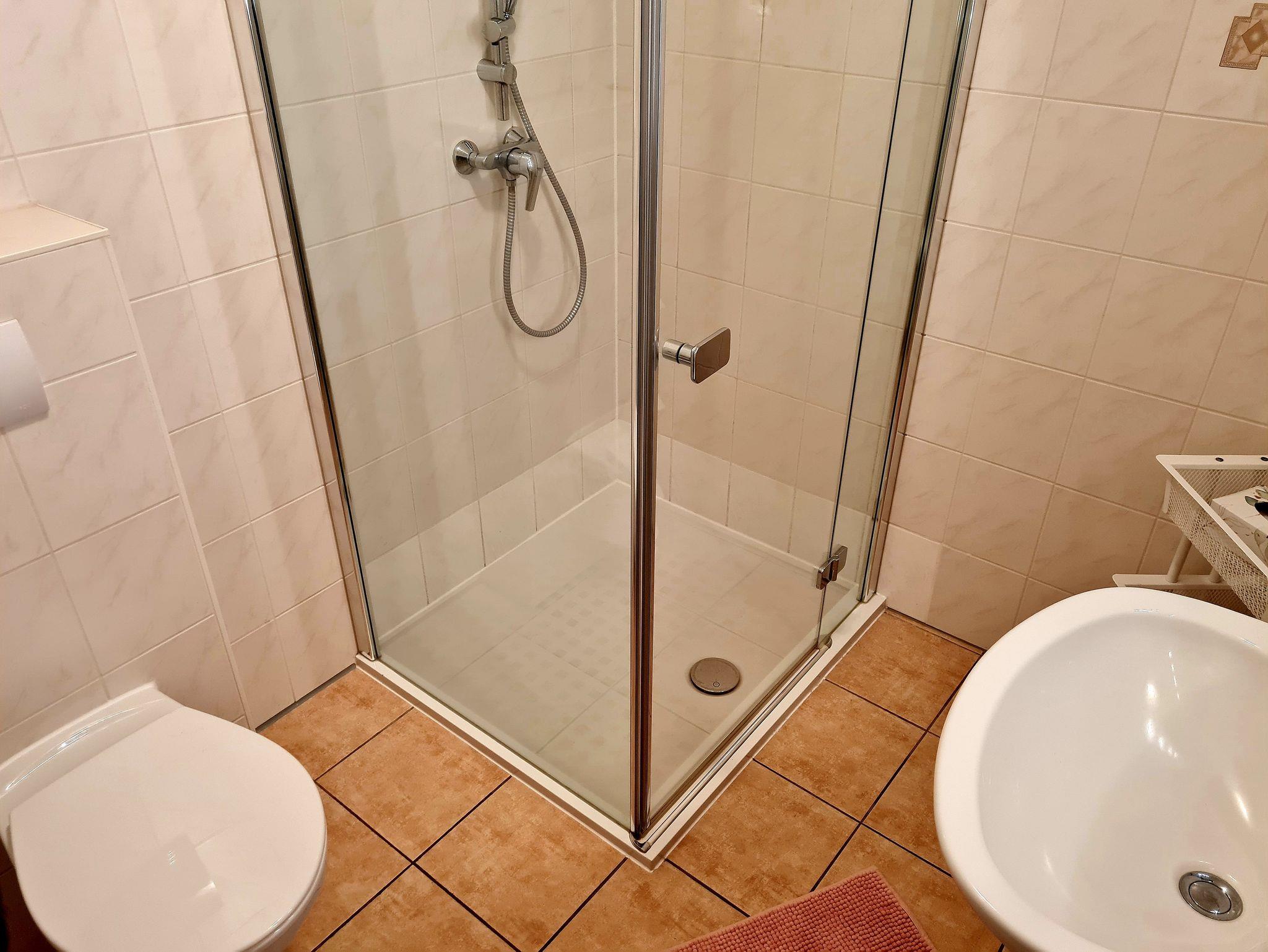 • Badezimmer: Dusche, Waschbecken, Toilette, Spiegel, Schrank