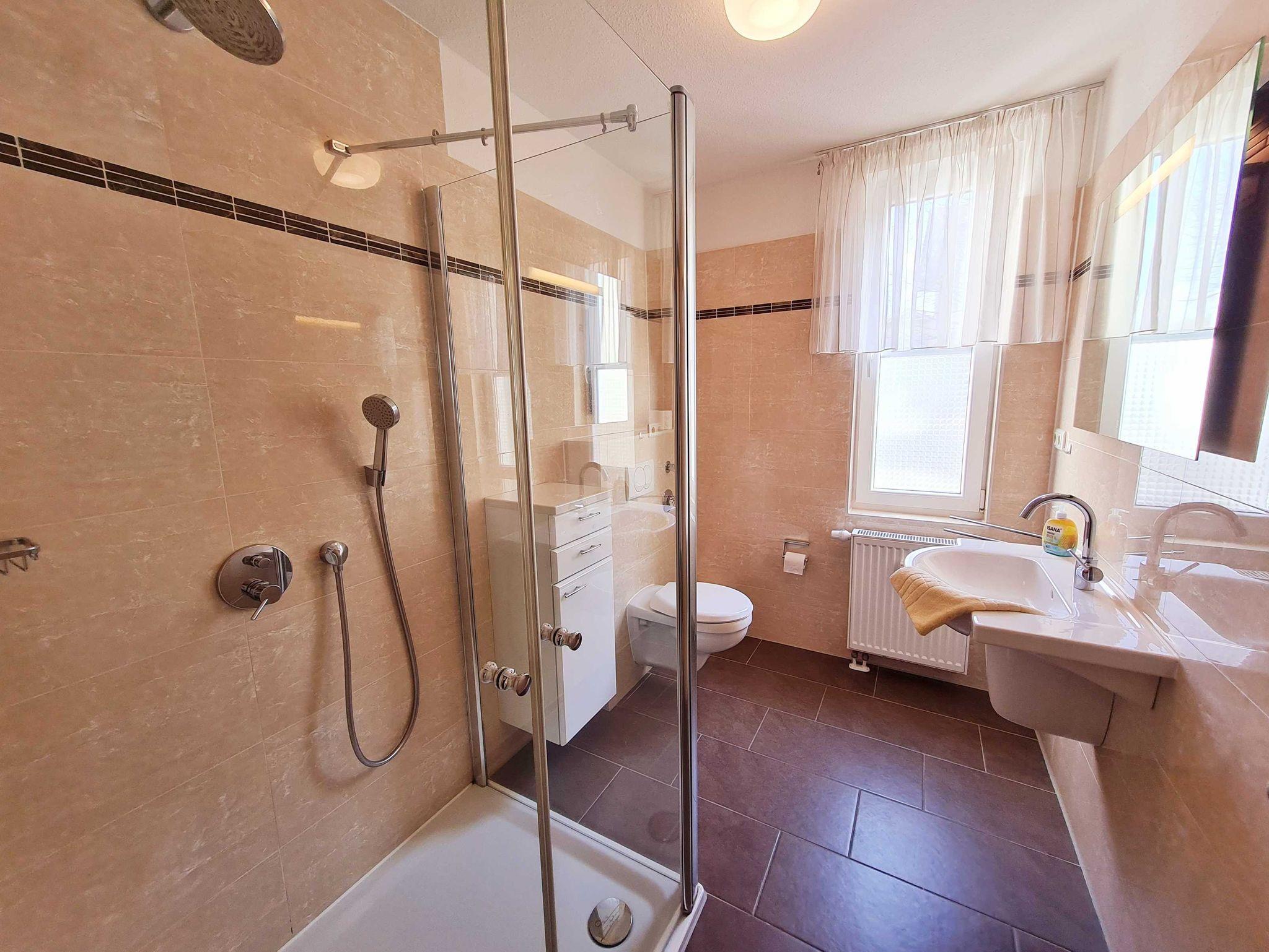 • Bad: mit Fenster, Dusche ebenerdig mit Echtglaswänden, Waschbecken, Toilette, Spiegel, Handtuchheizkörper, Waschmaschine