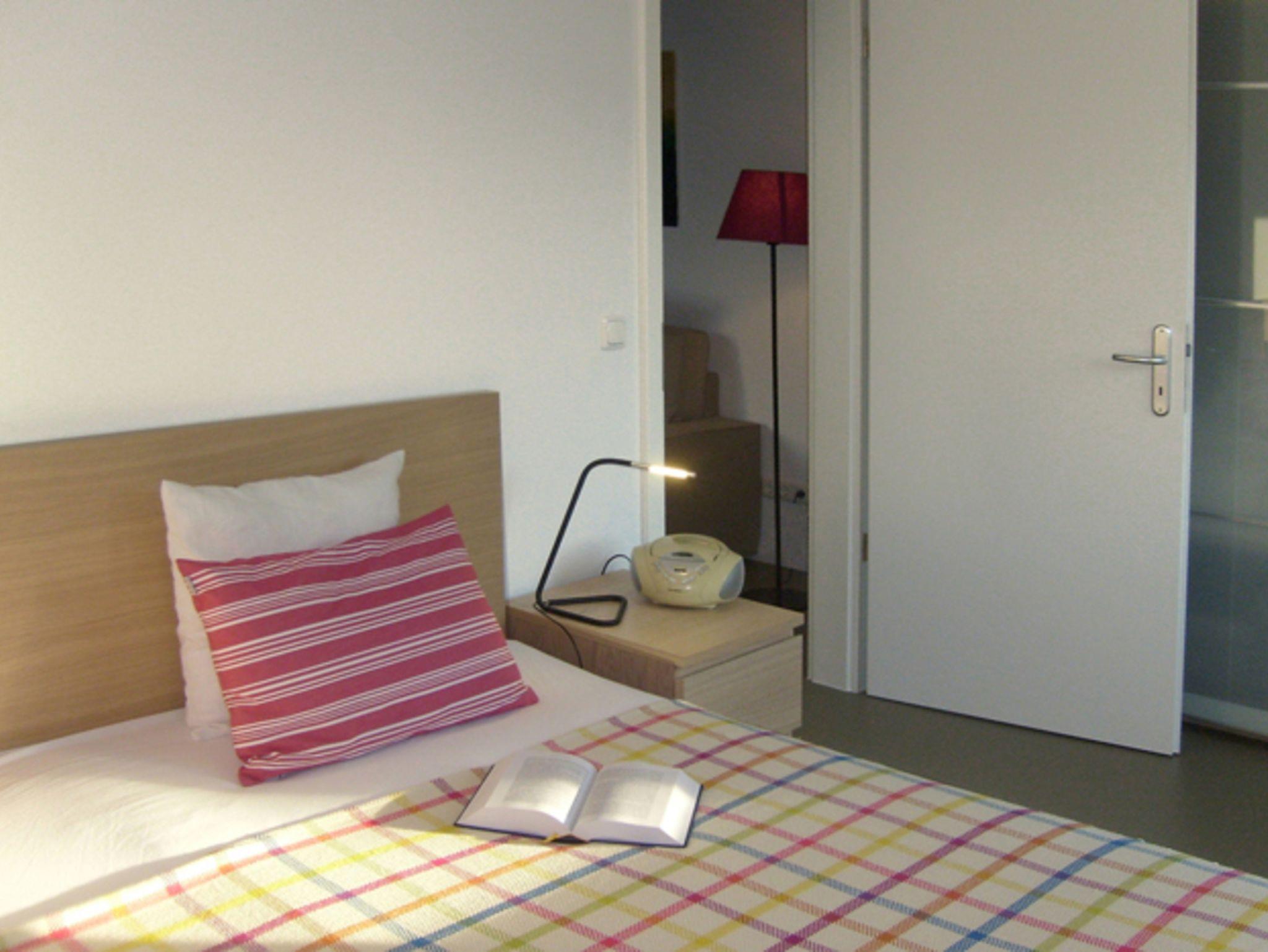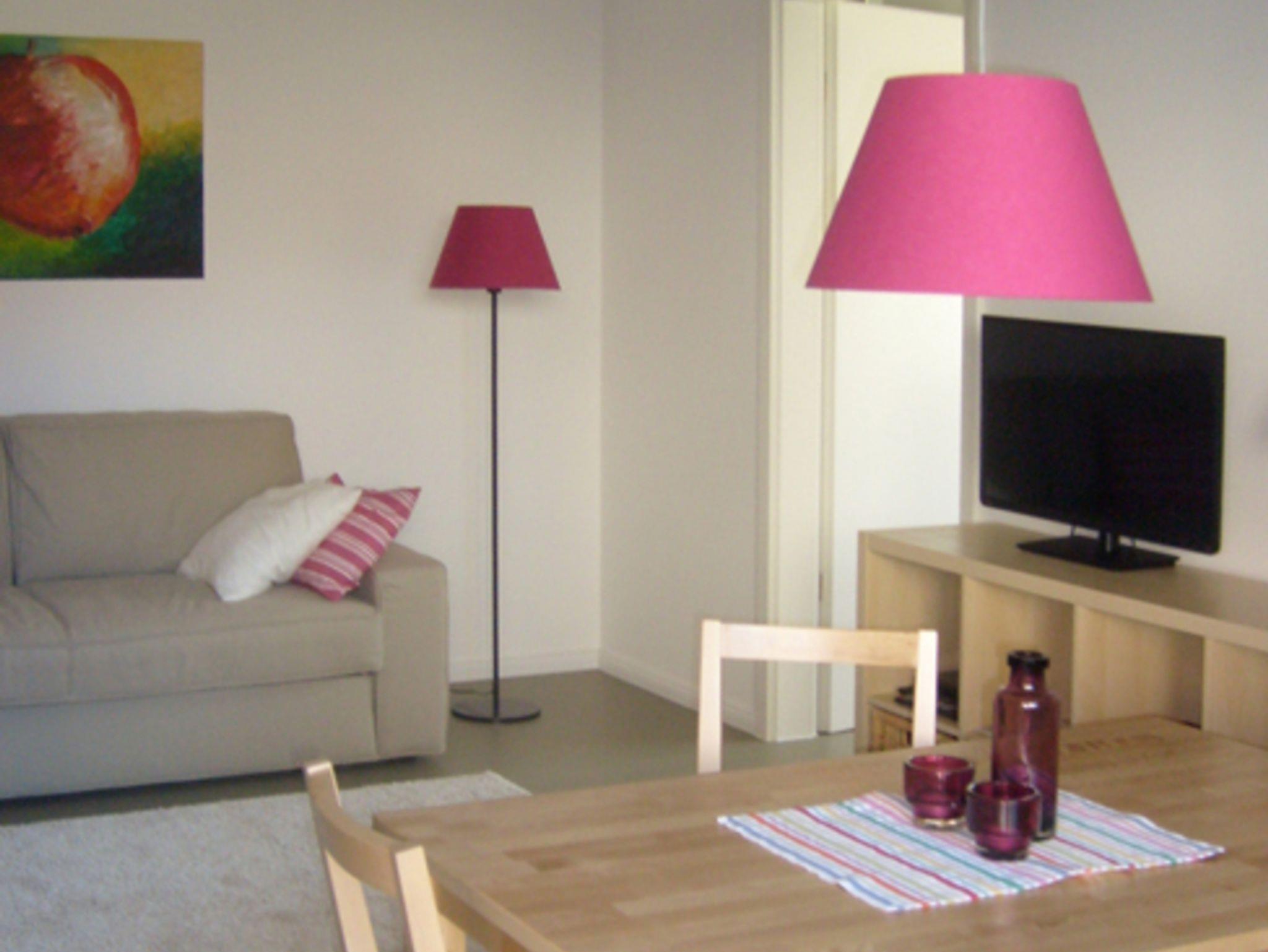 Ein Schlafzimmer mit Doppelbett und geräumigem Schiebetürenschrank, ein komfortabler Wohnbereich mit kombinierter (Schlaf-)Couch und einem Fernseher, sowie ein großzügiges Badezimmer mit ebenerdigem Zugang zur Dusche gehören mit zur Ausstattung.