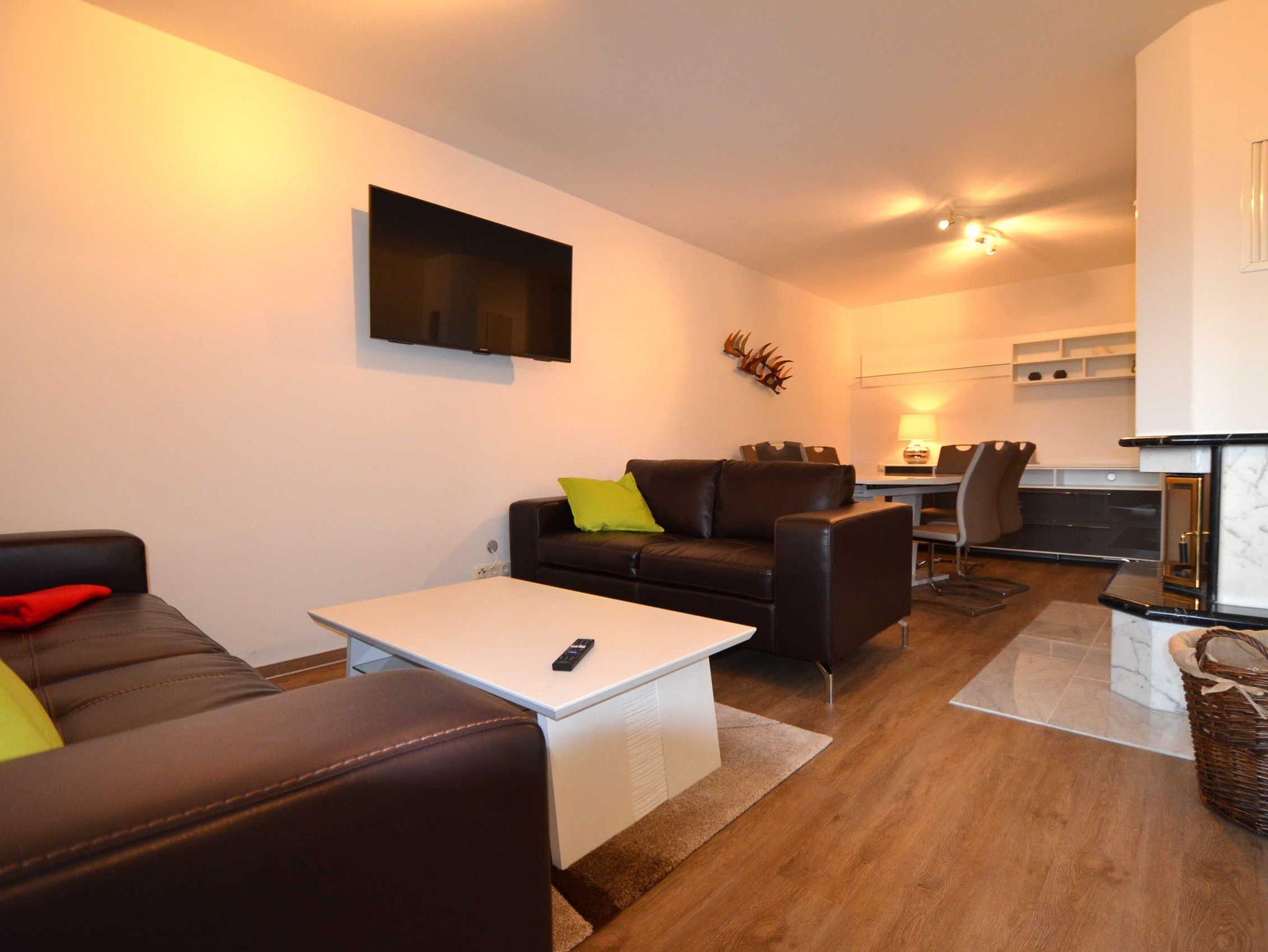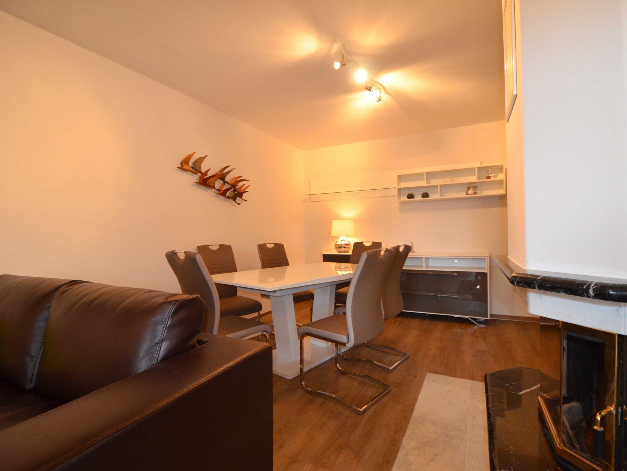 Die Ferienwohnung besteht aus 2 Schlafzimmern mit jeweils einem Doppelbett, einem dritten Schlafzimmer mit Etagenbett, einem Badezimmer mit Dusche und Badewanne und einem Wohnbereich mit Kamin und Zugnag zur offenen Küche. Zur Wohnung gehört ein Balkon.