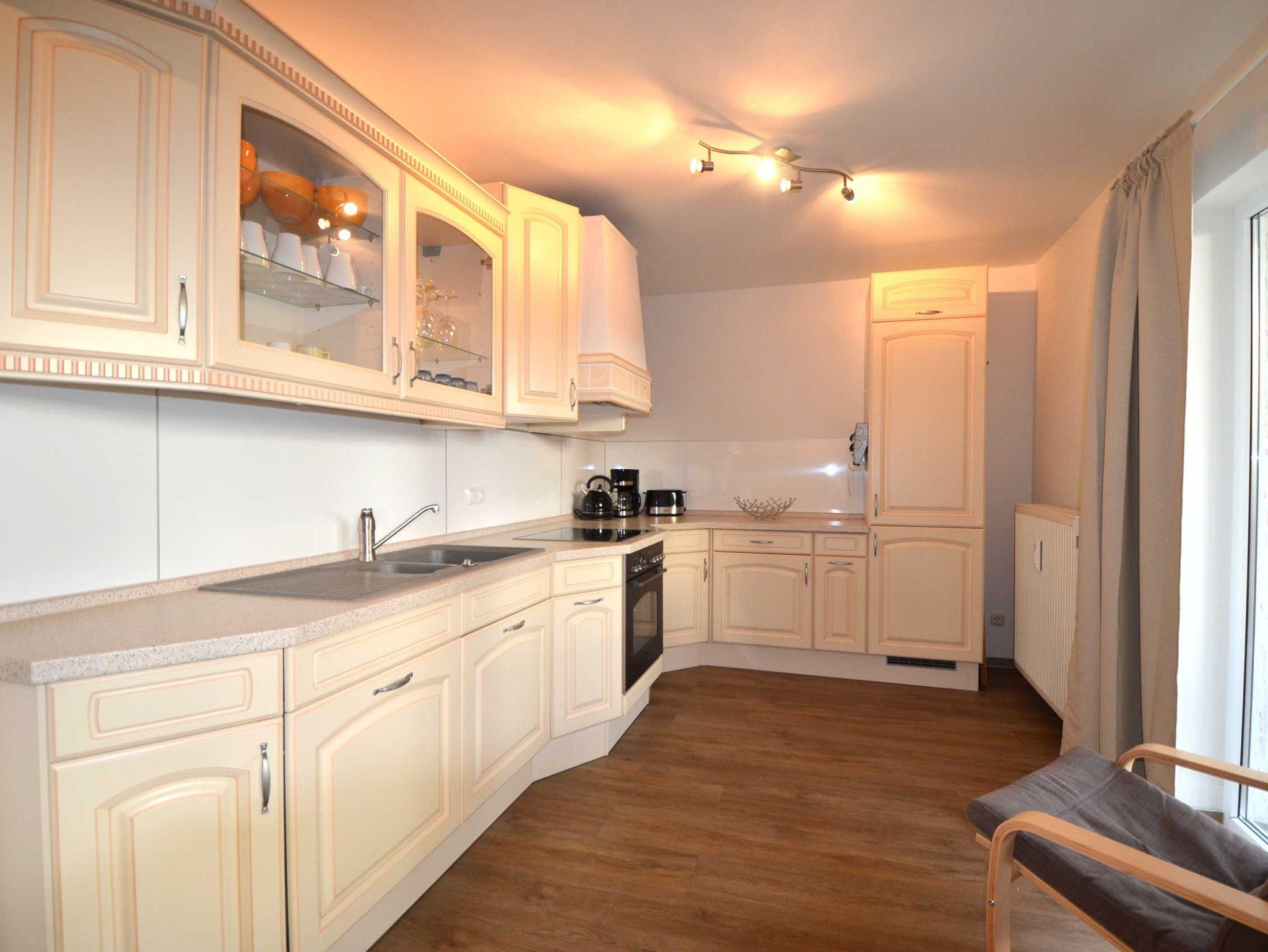 Der Wohn- und Küchenbereich ist kombiniert. Im Wohnbereich befinden sich eine hochwertige Sofa-Gruppe und ein Kamin. Die Küche ist komplett ausgestattet, u.a. mit Herd, Backofen, Kühlschrank mit Tiefkühlfach, Tiefkühlschrank, Geschirrspülmaschine, Kaffeemaschine, Toaster und Wasserkocher. Hier gibt es auch den Essbereich.