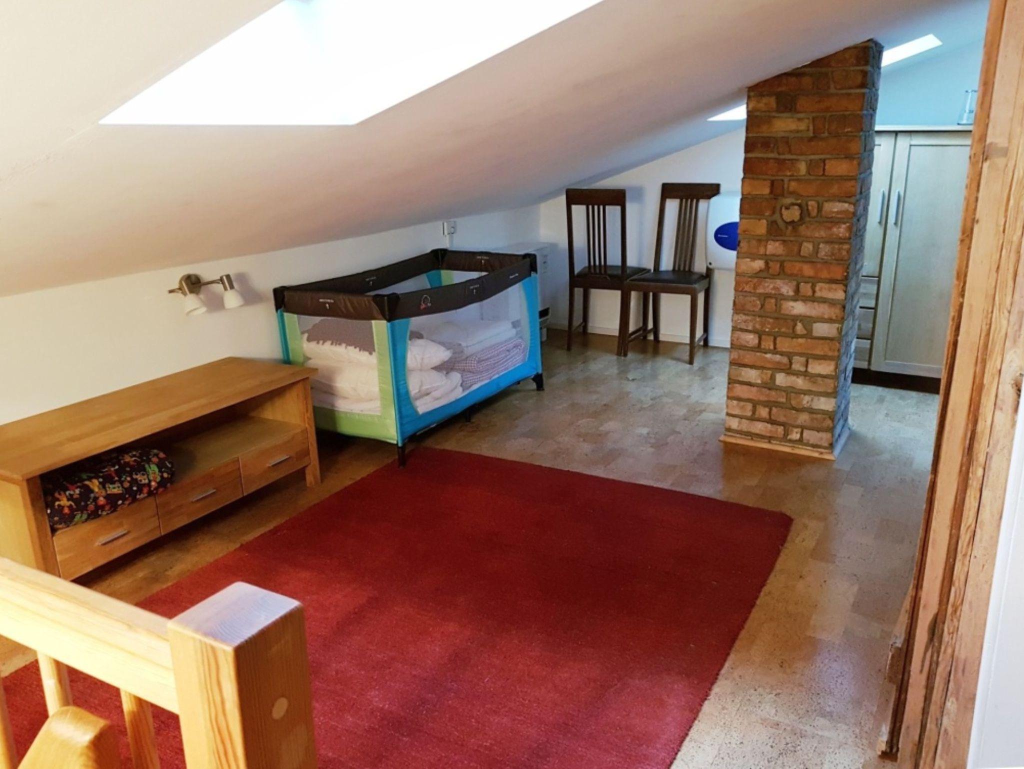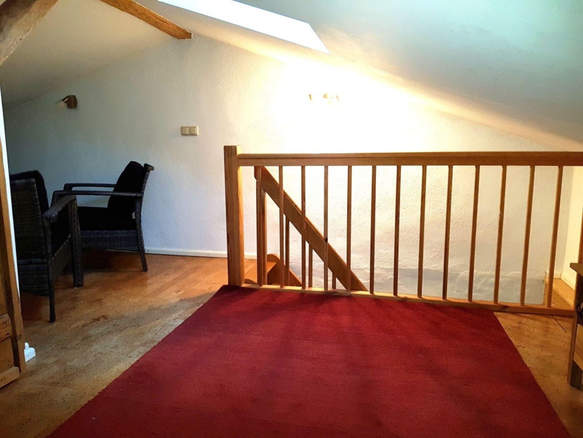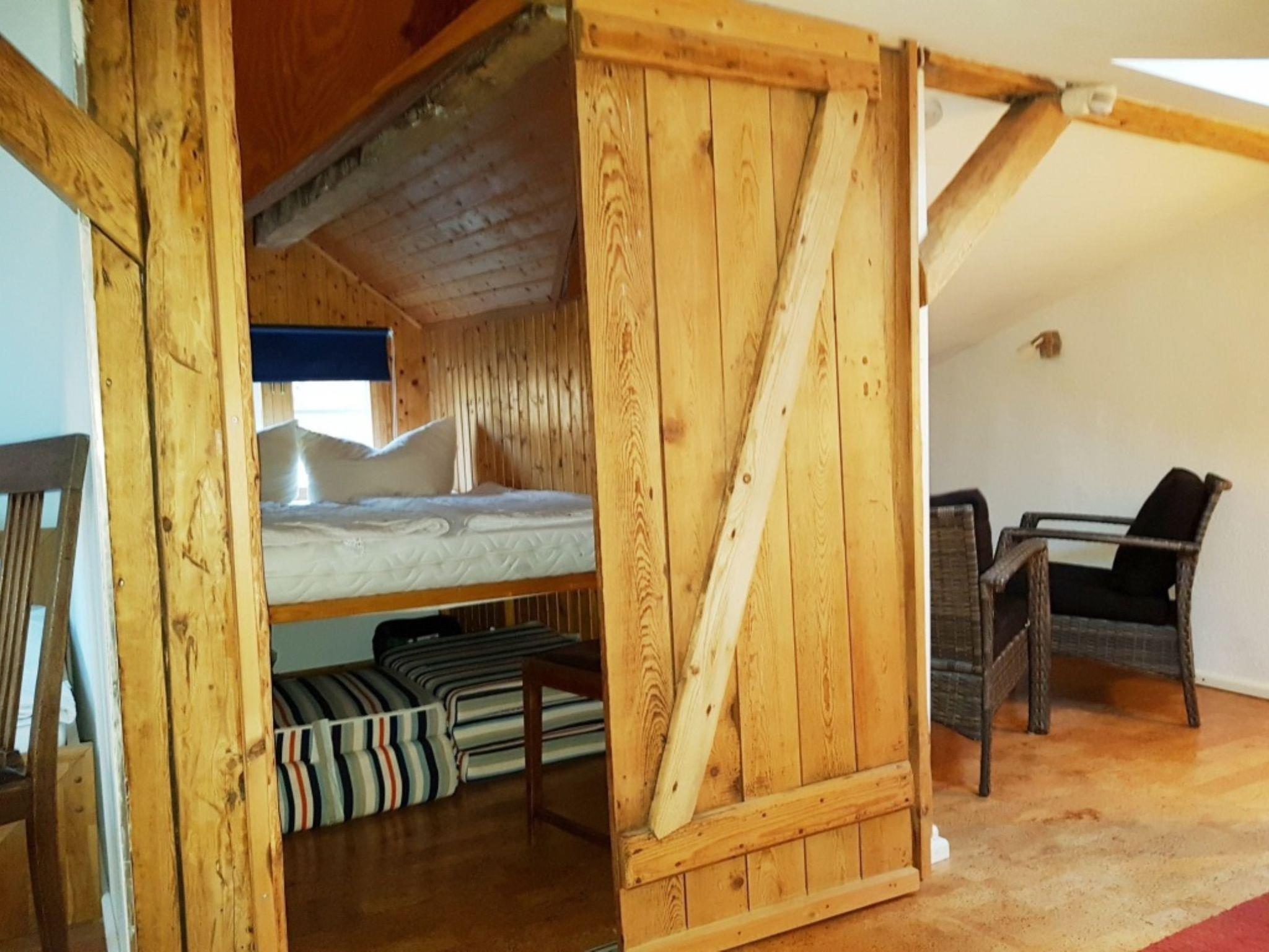 Im Obergeschoss befinden sich die Schlafmöglichkeiten. Hier ist die Decke nicht ganz so hoch, sodass es sein kann, dass Sie leicht geduckt laufen müssen. In der Schlafecke steht ein französisches Bett (1,40m x 2,00m). Das Bett steht unter einer schrägen Wand. In einer selbstgebauten Schlafkoje befindet sich eine weitere Schlafmöglichkeit. Die Schlafkoje kann durch eine nachgebaute Stalltür (Schiebetür) verschlossen werden.