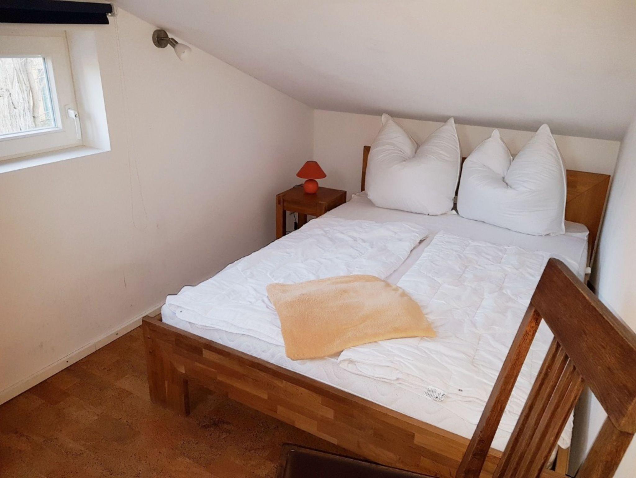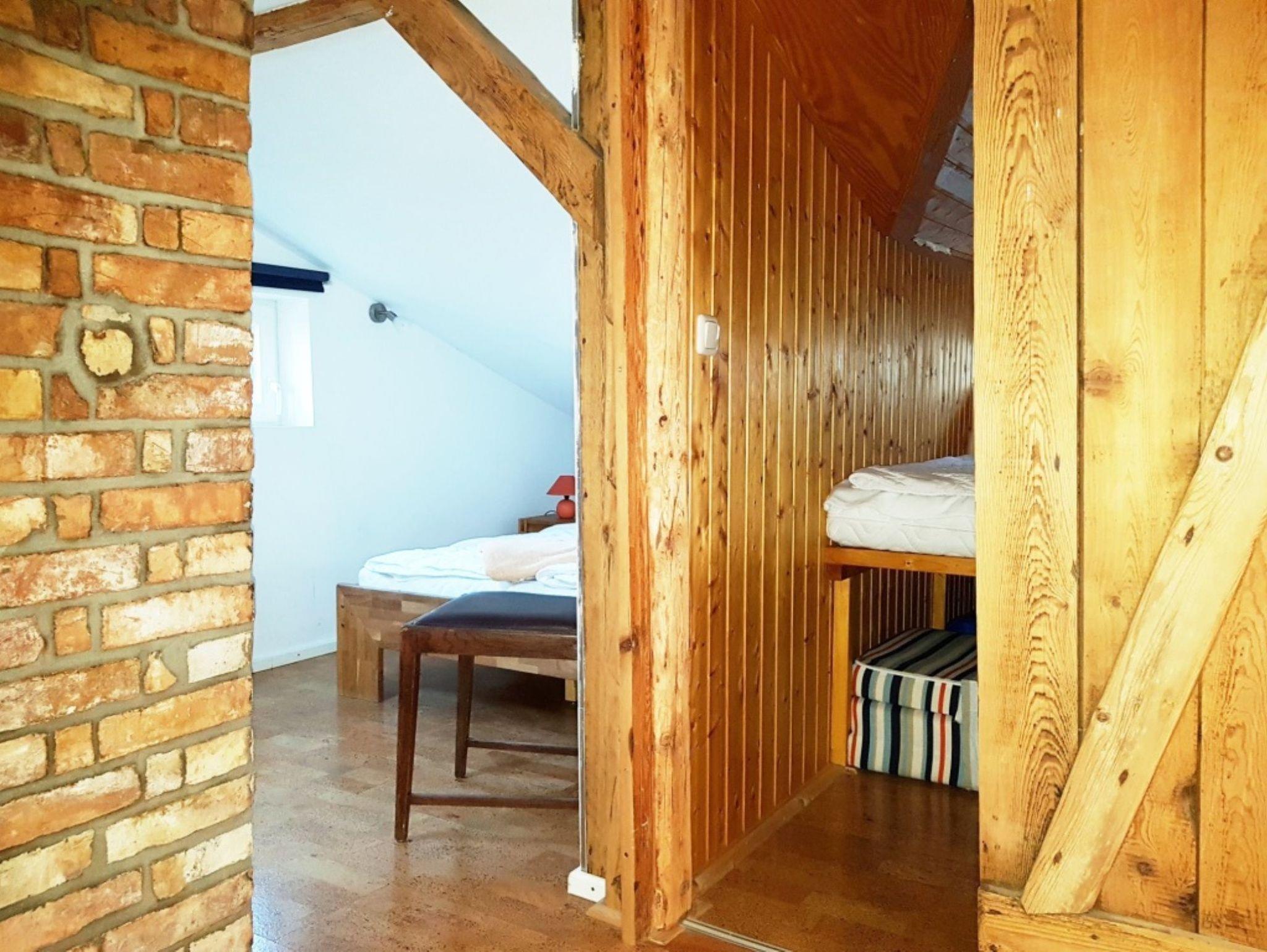 Im Obergeschoss befinden sich die Schlafmöglichkeiten. Hier ist die Decke nicht ganz so hoch, sodass es sein kann, dass Sie leicht geduckt laufen müssen. In der Schlafecke steht ein französisches Bett (1,40m mal 2,00m). Das Bett steht unter einer schrägen Wand. In einer selbstgebauten Schlafkoje befindet sich eine weitere Schlafmöglichkeit. Die Schlafkoje kann durch eine nachgebaute Stalltür (Schiebetür) verschlossen werden.