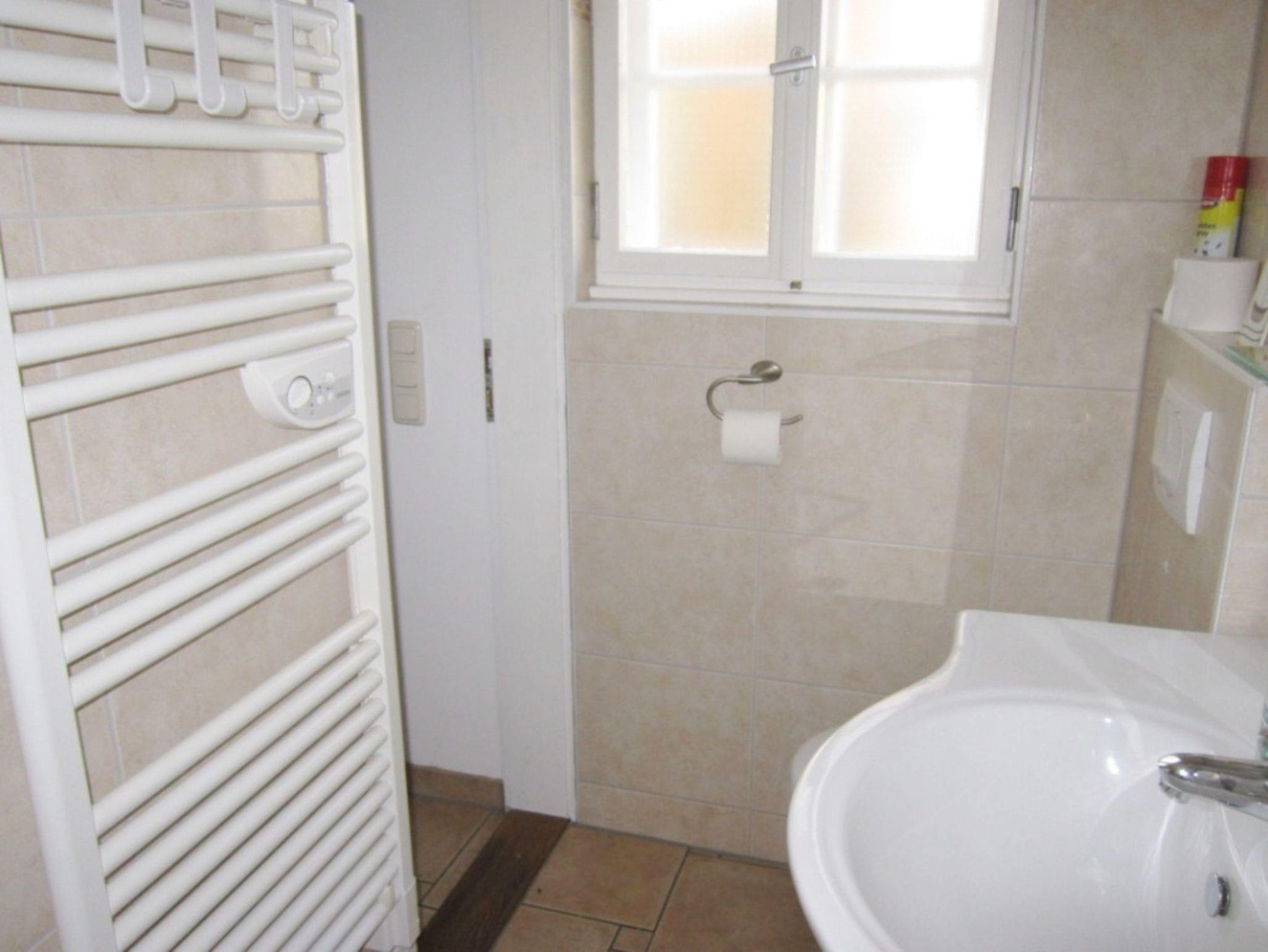 Im kleinen Bad, gefliest und mit Fenster, finden Sie eine Dusche, ein WC und einen Waschtisch.