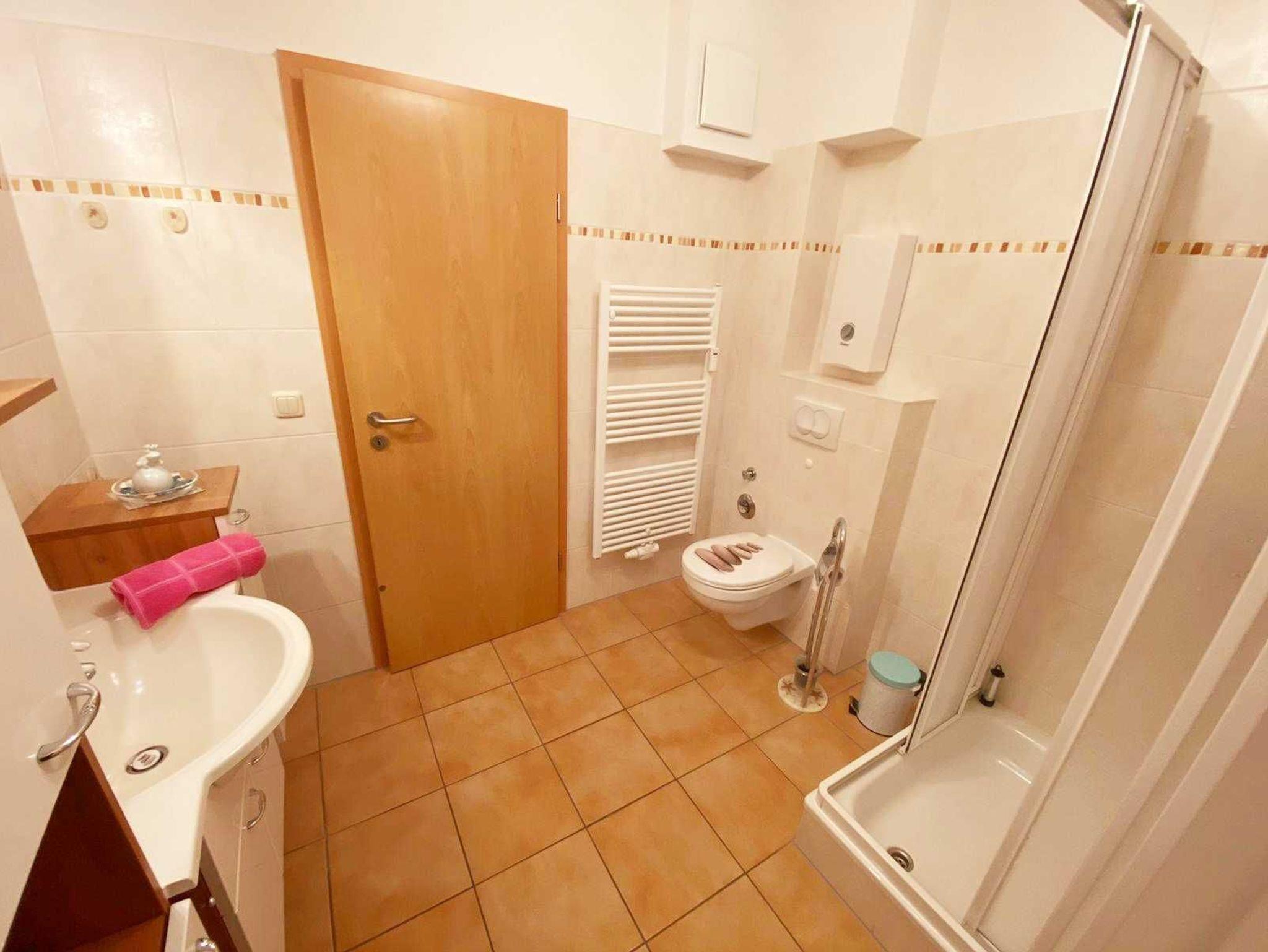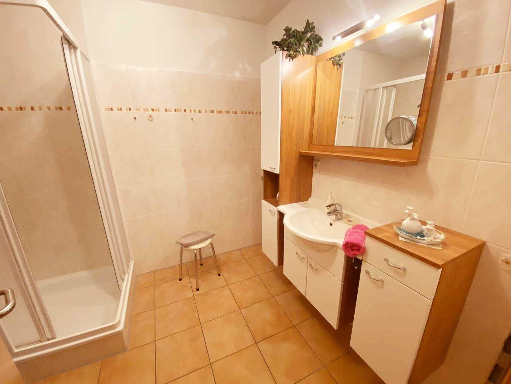 • Bad: mit Dusche, WC, Waschbecken, Spiegel, Schränke und Handtuchheizkörper